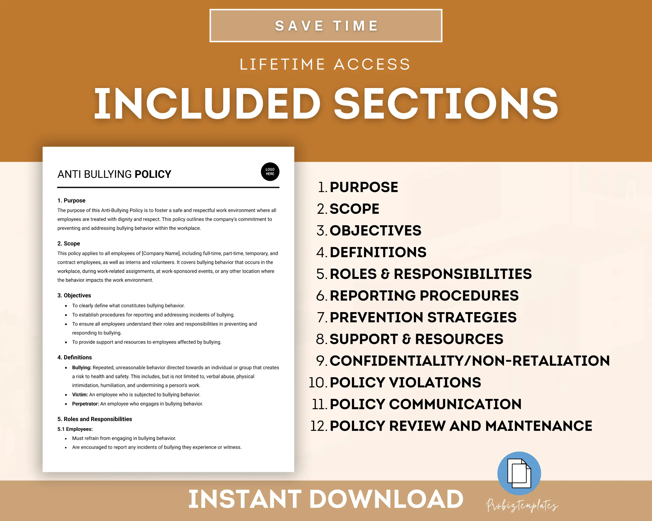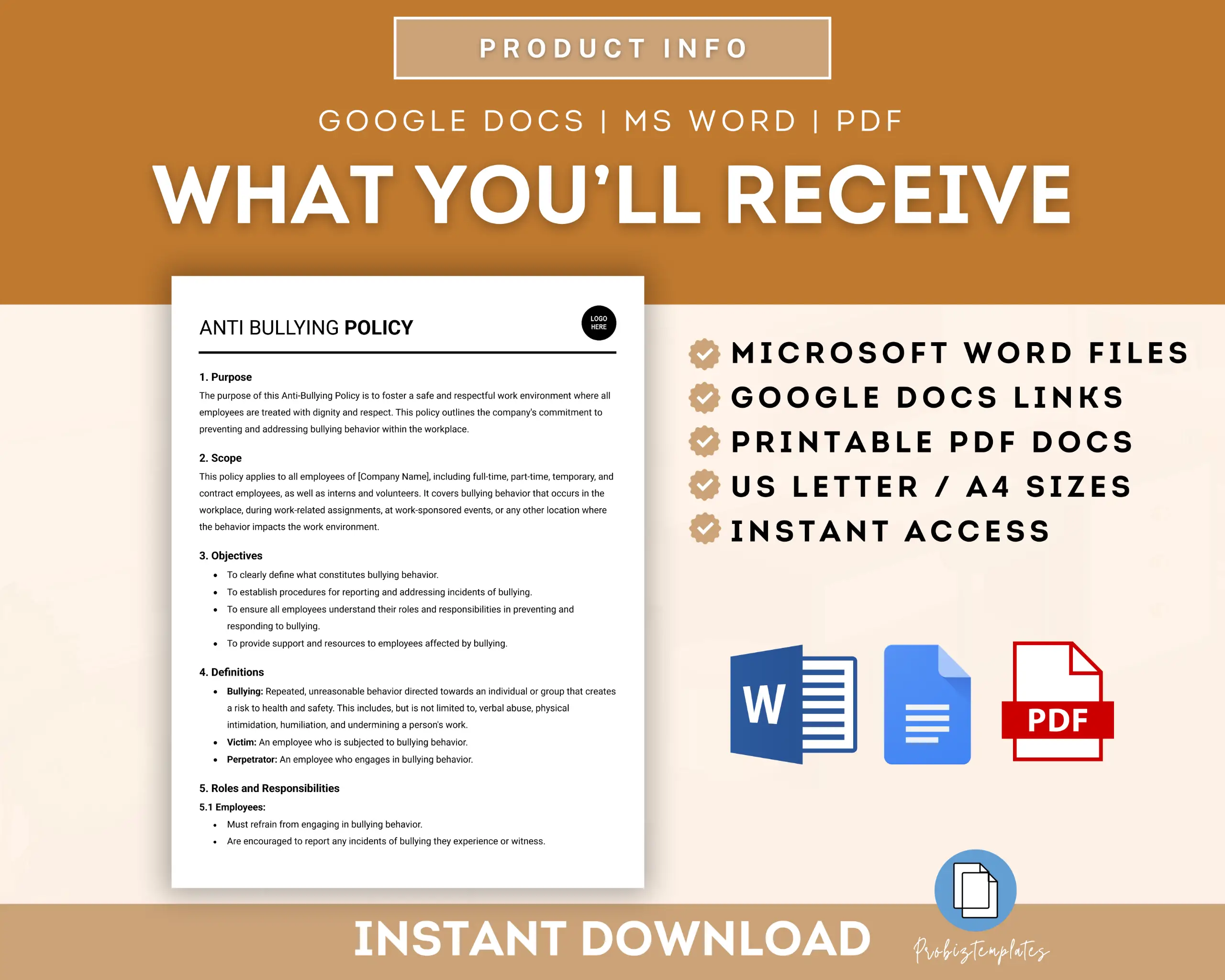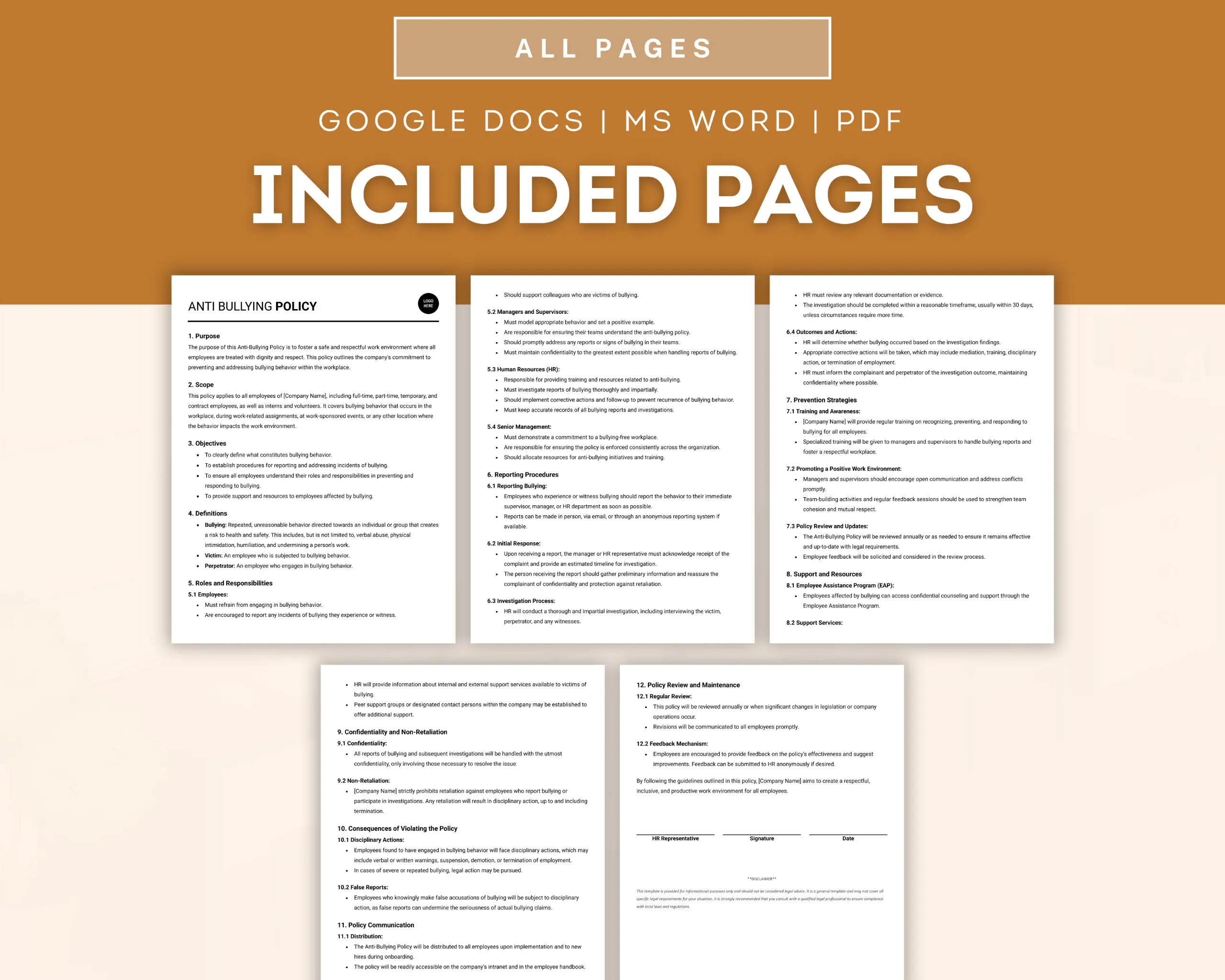 This Anti Bullying Policy template outlines guidelines to prevent and address bullying in the workplace. It includes reporting procedures, disciplinary actions, and support resources. Promote a safe and respectful work environment with these comprehensive guidelines.