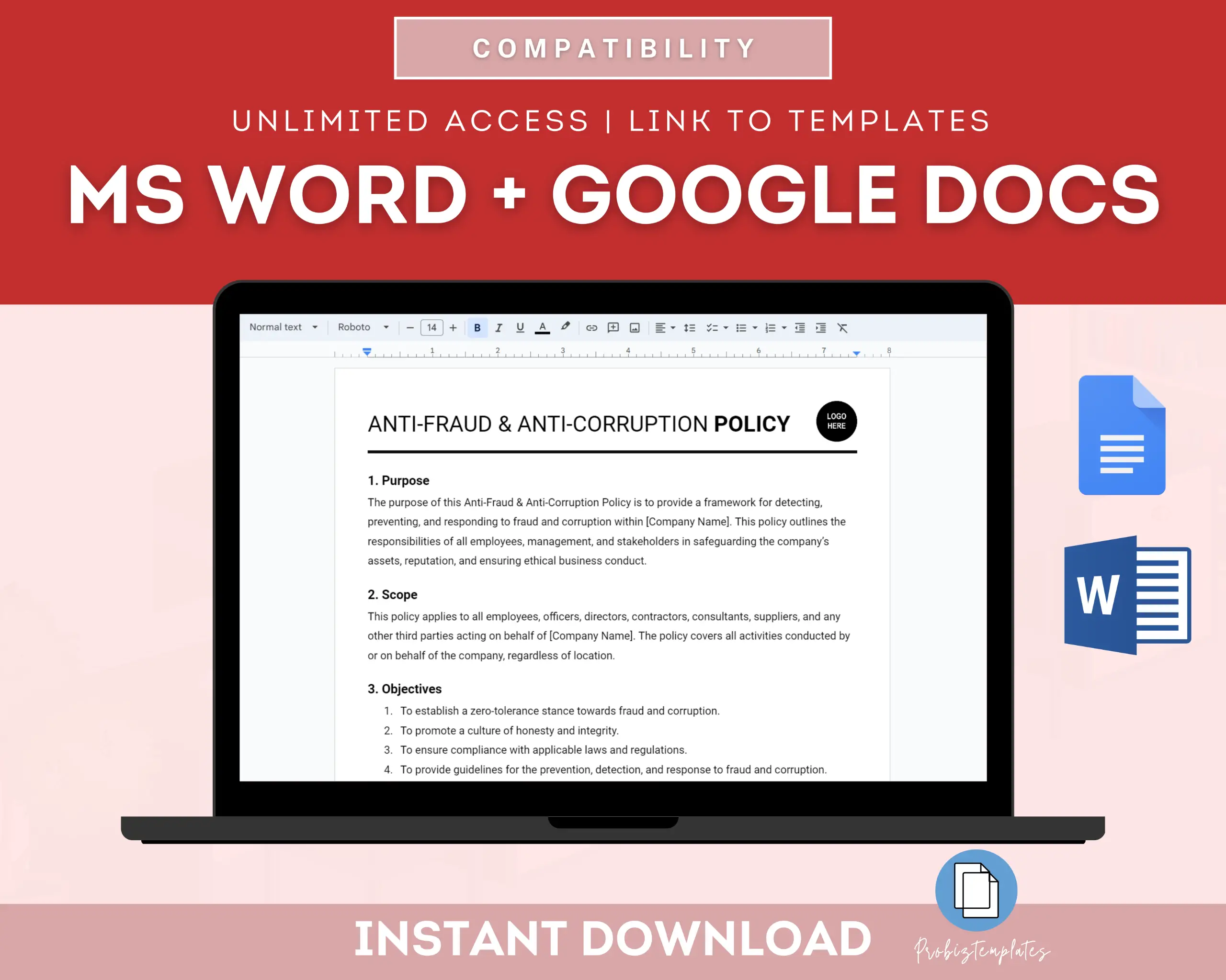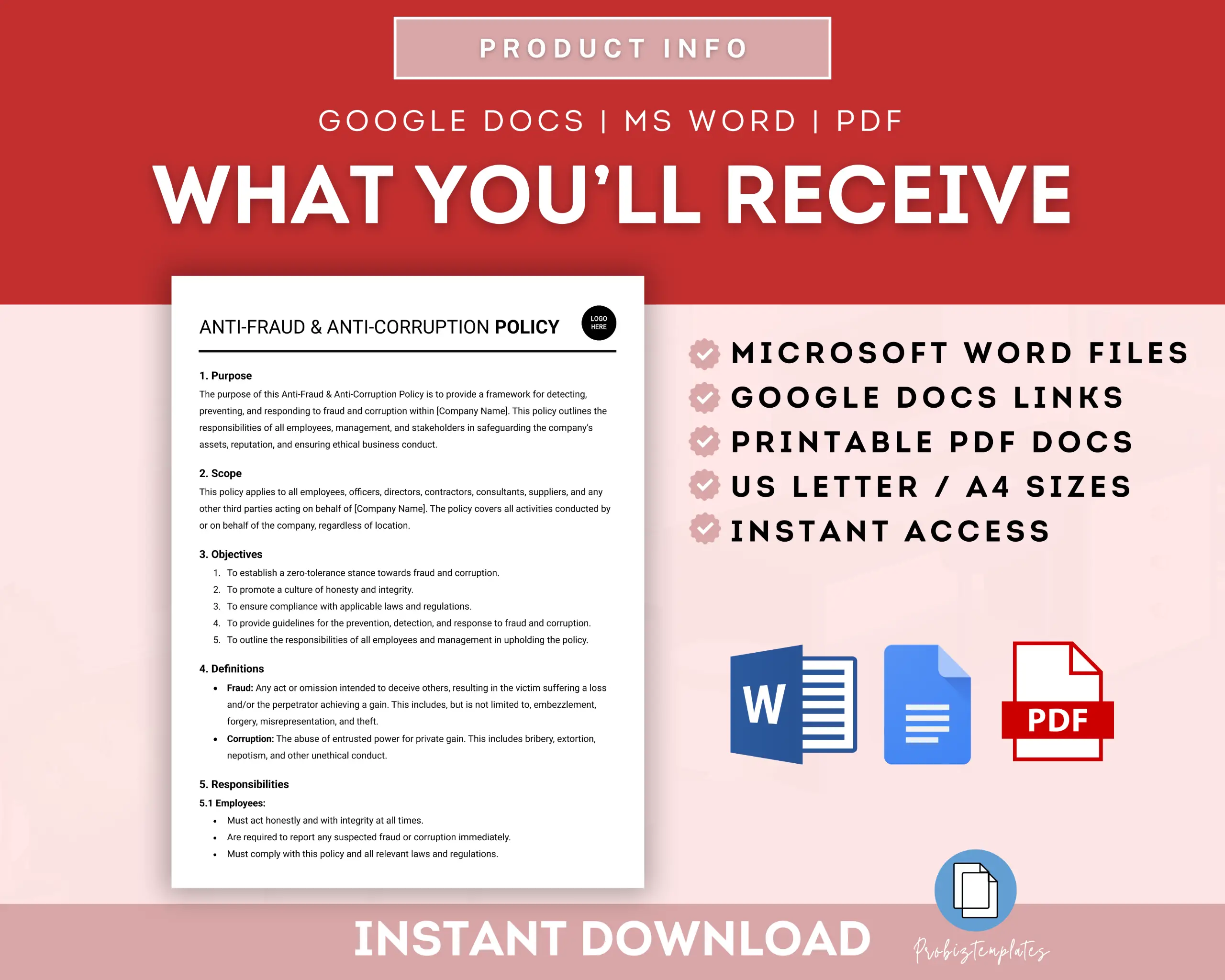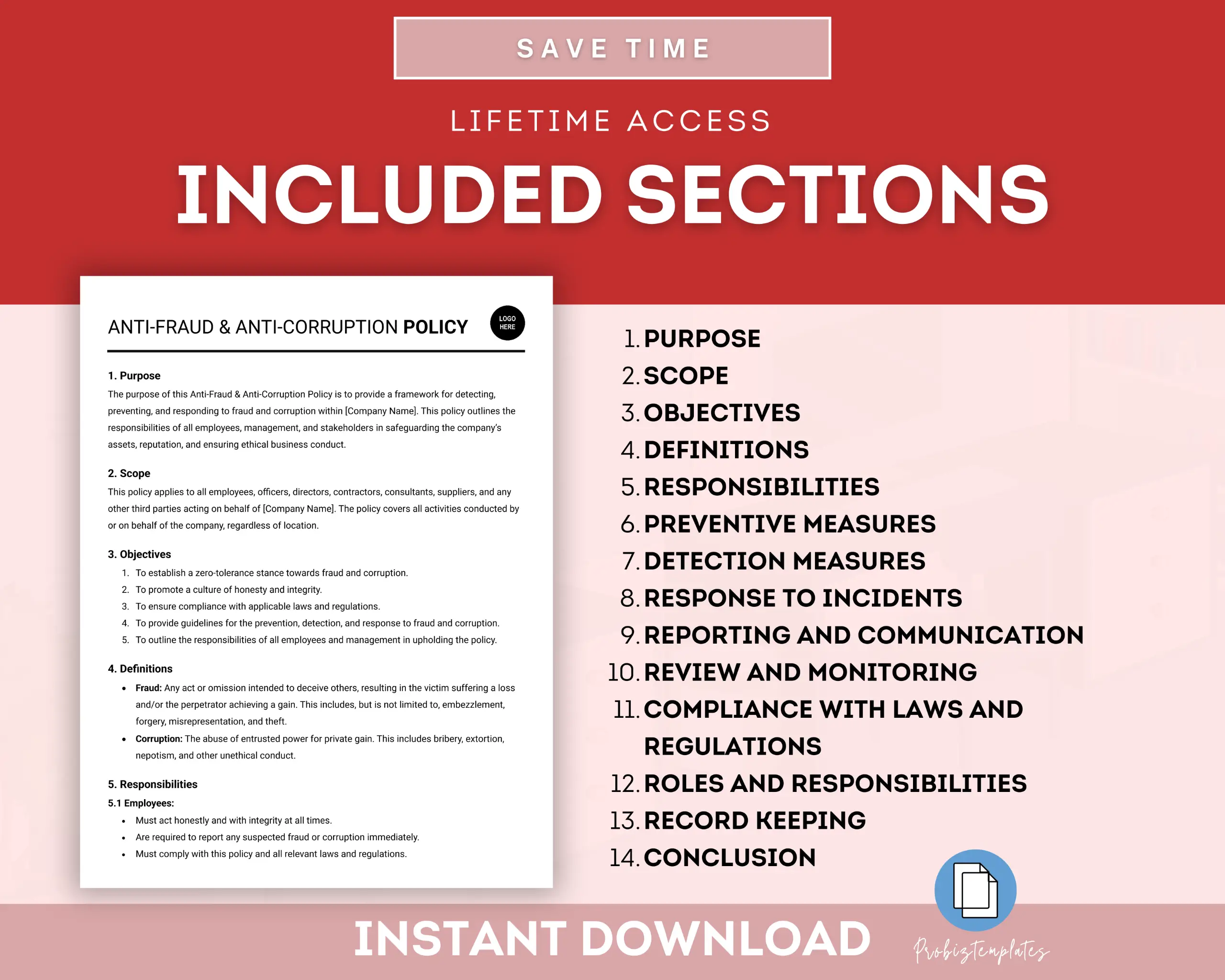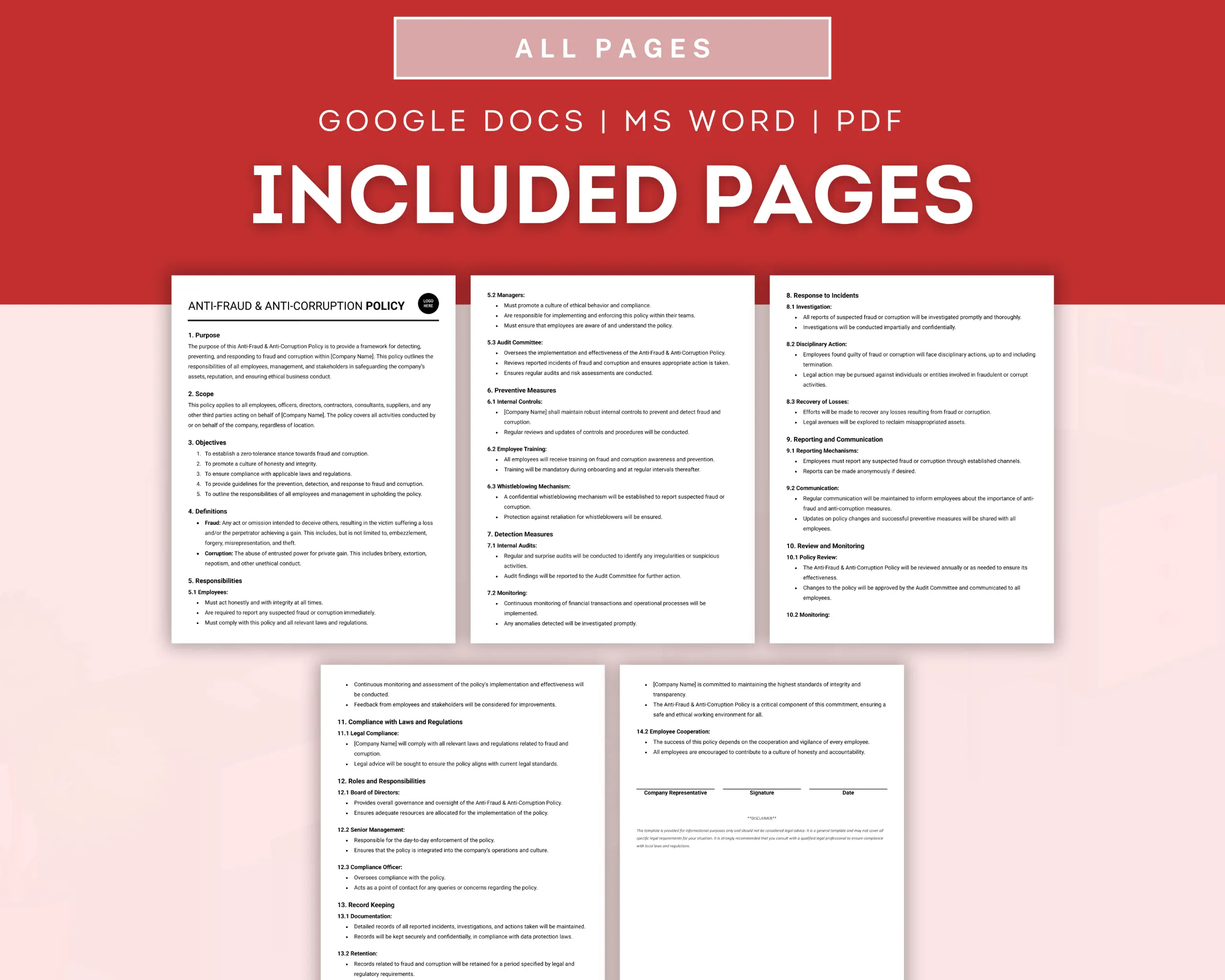 This template outlines the company’s policies to prevent fraud and corruption. It includes reporting procedures, compliance requirements, and disciplinary measures. Ensure a secure and ethical work environment with these comprehensive policies.