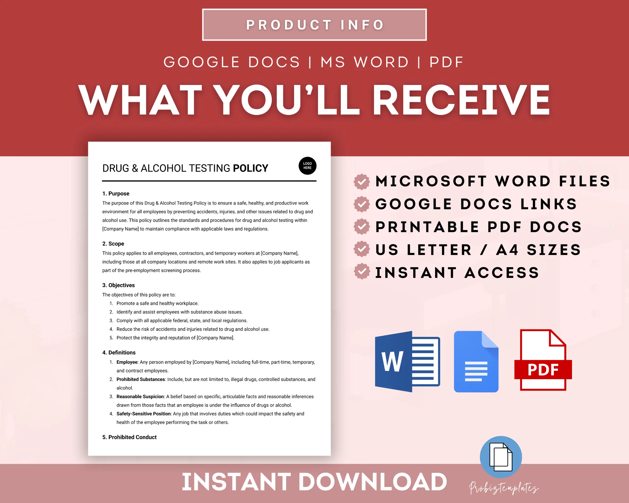 This Drug and Alcohol Testing Policy template outlines the company’s approach to maintaining a drug-free workplace. It includes testing procedures, employee responsibilities, and consequences for policy violations.