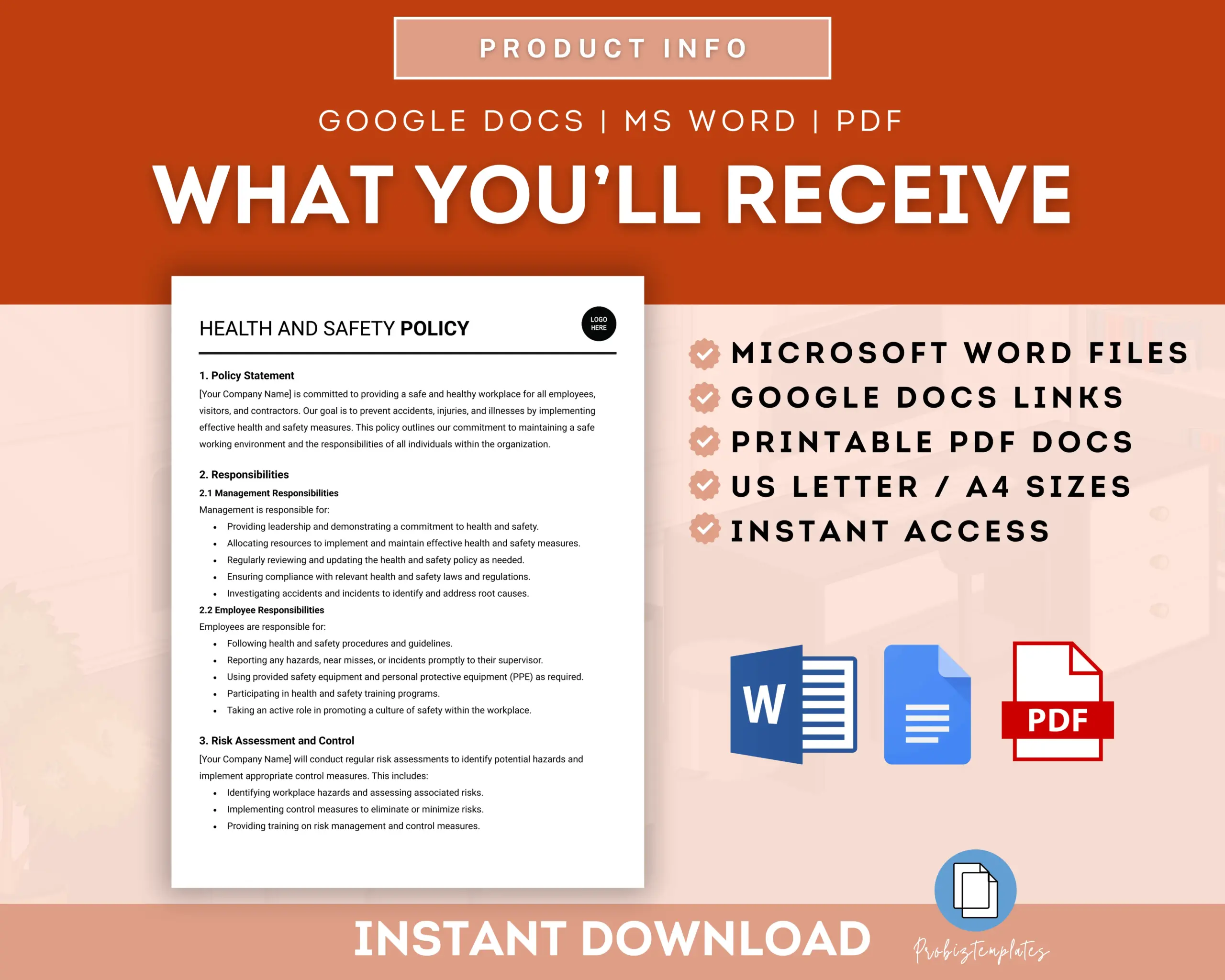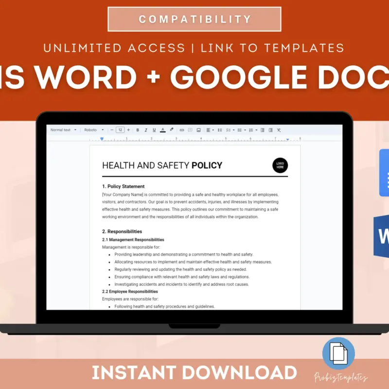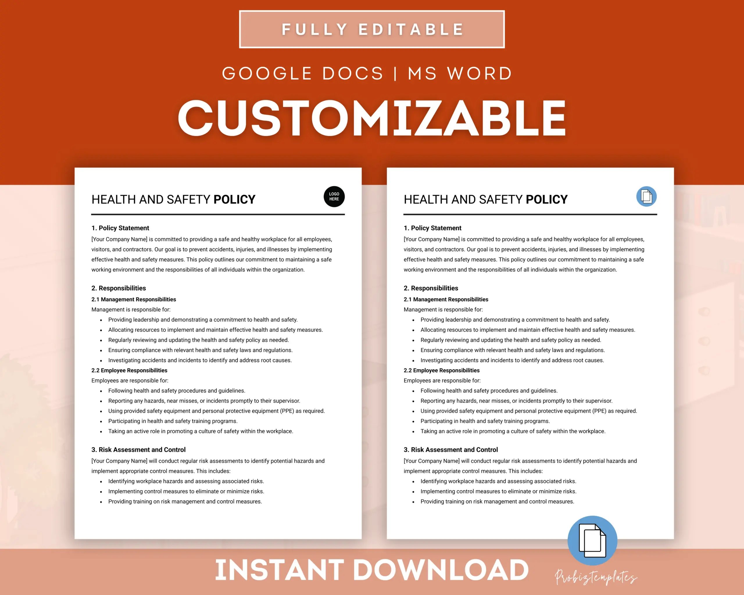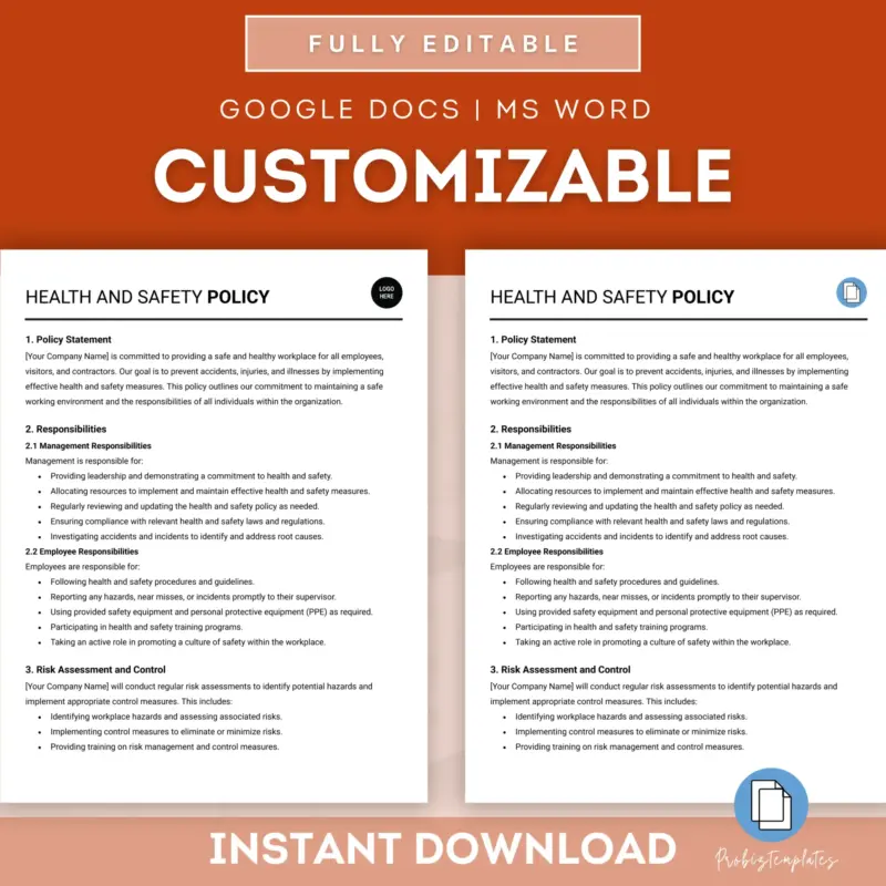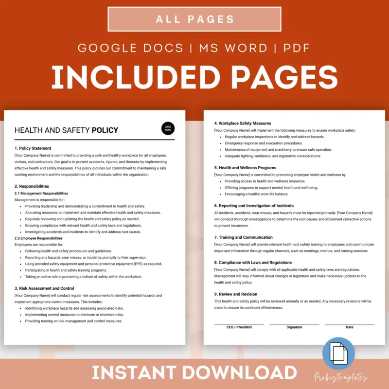 This Employee Health and Safety Policy template is a straightforward and comprehensive document to guide your organization in fostering a safe and healthy workplace. This template outlines essential guidelines and protocols, ensuring compliance with industry standards and promoting a secure environment for your team. Simplify your commitment to employee well-being with this practical and easy-to-implement resource.
