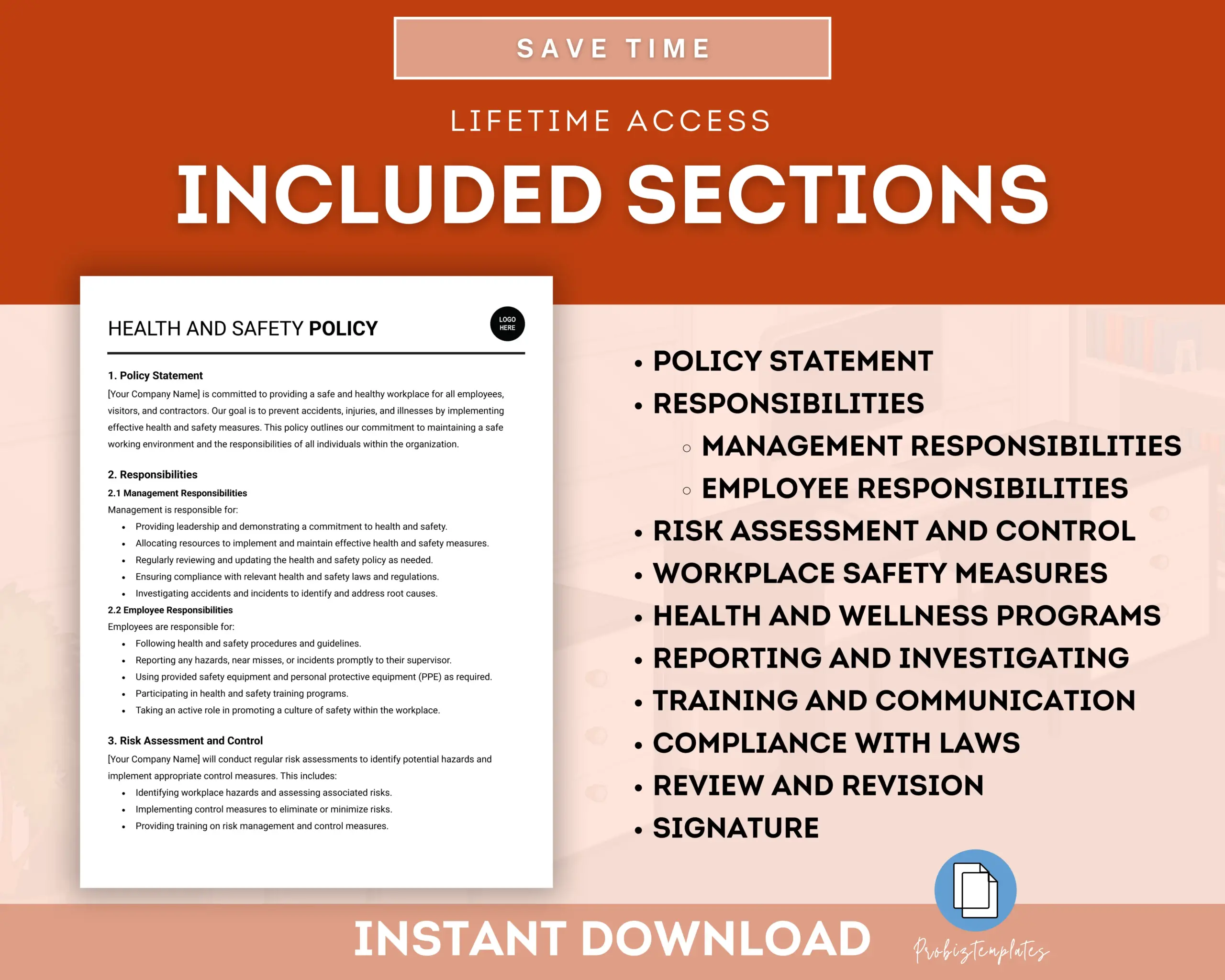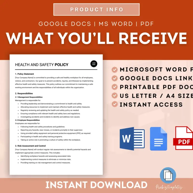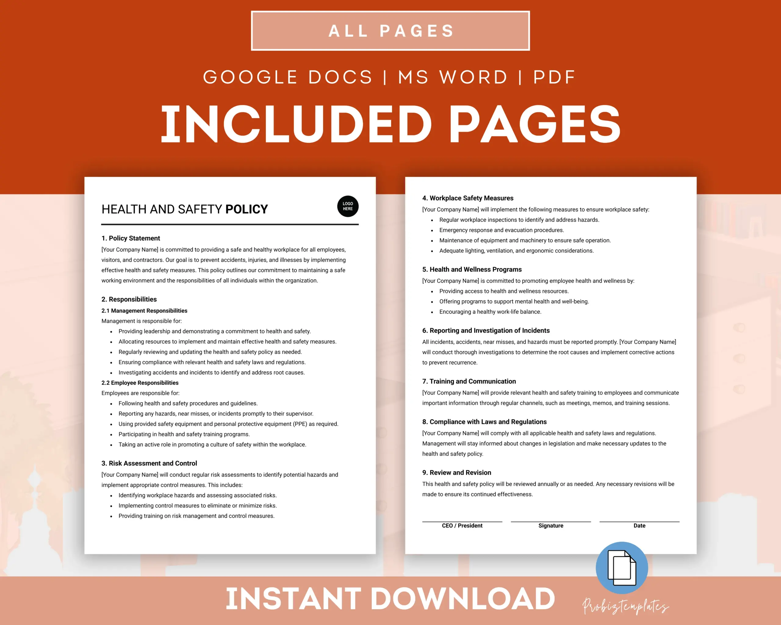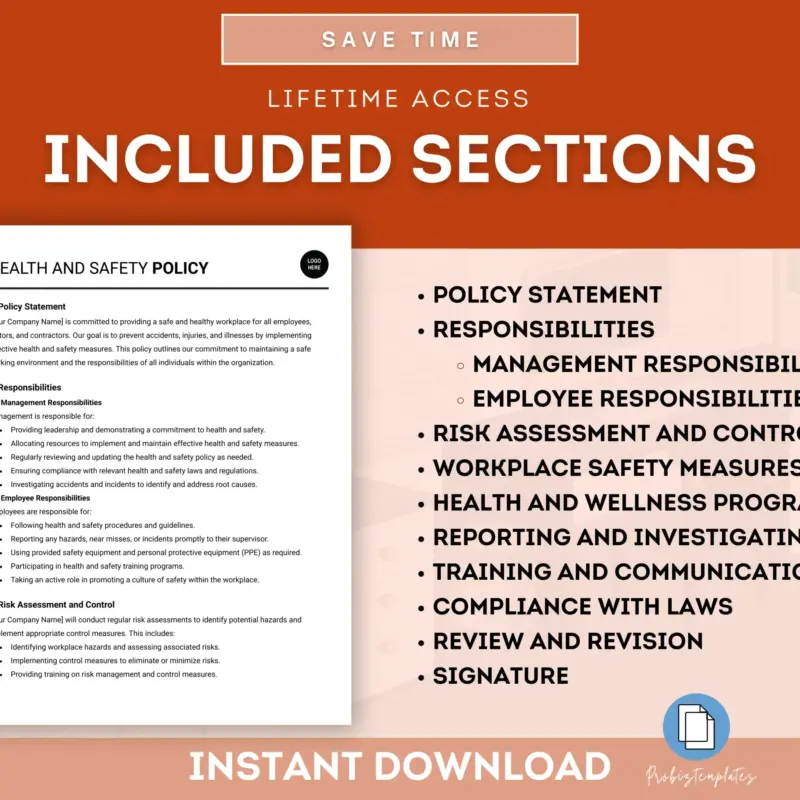 This Employee Health and Safety Policy template is a straightforward and comprehensive document to guide your organization in fostering a safe and healthy workplace. This template outlines essential guidelines and protocols, ensuring compliance with industry standards and promoting a secure environment for your team. Simplify your commitment to employee well-being with this practical and easy-to-implement resource.