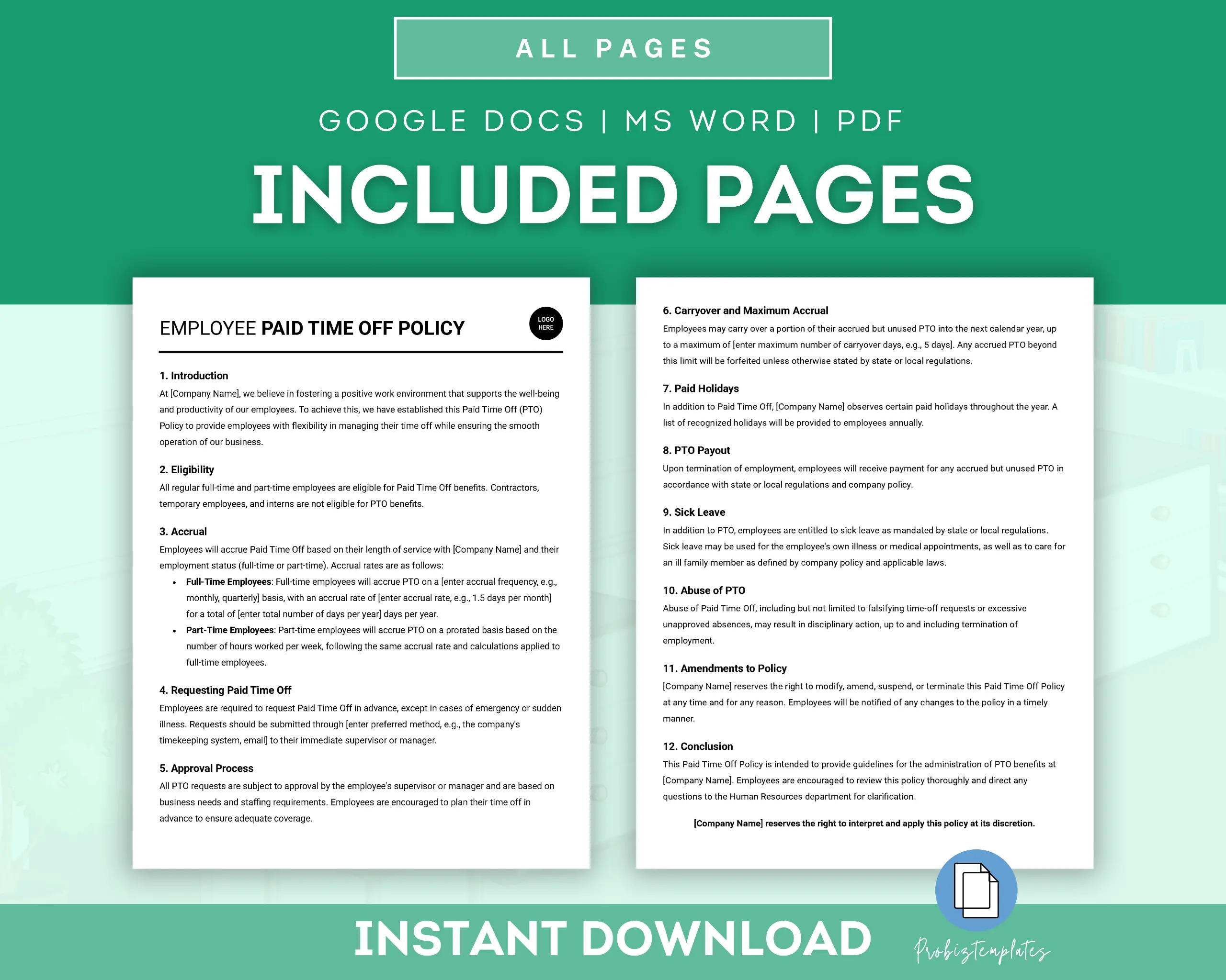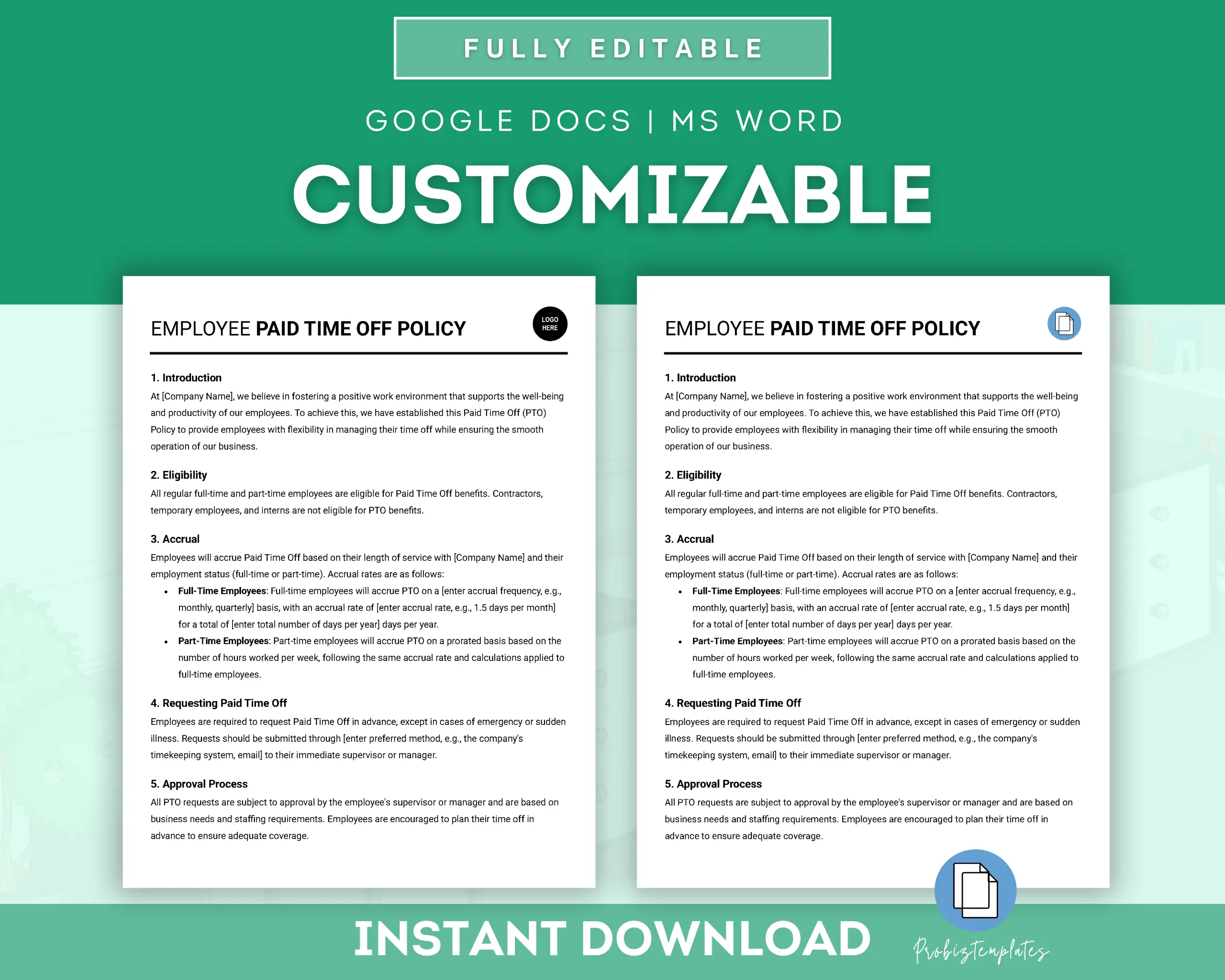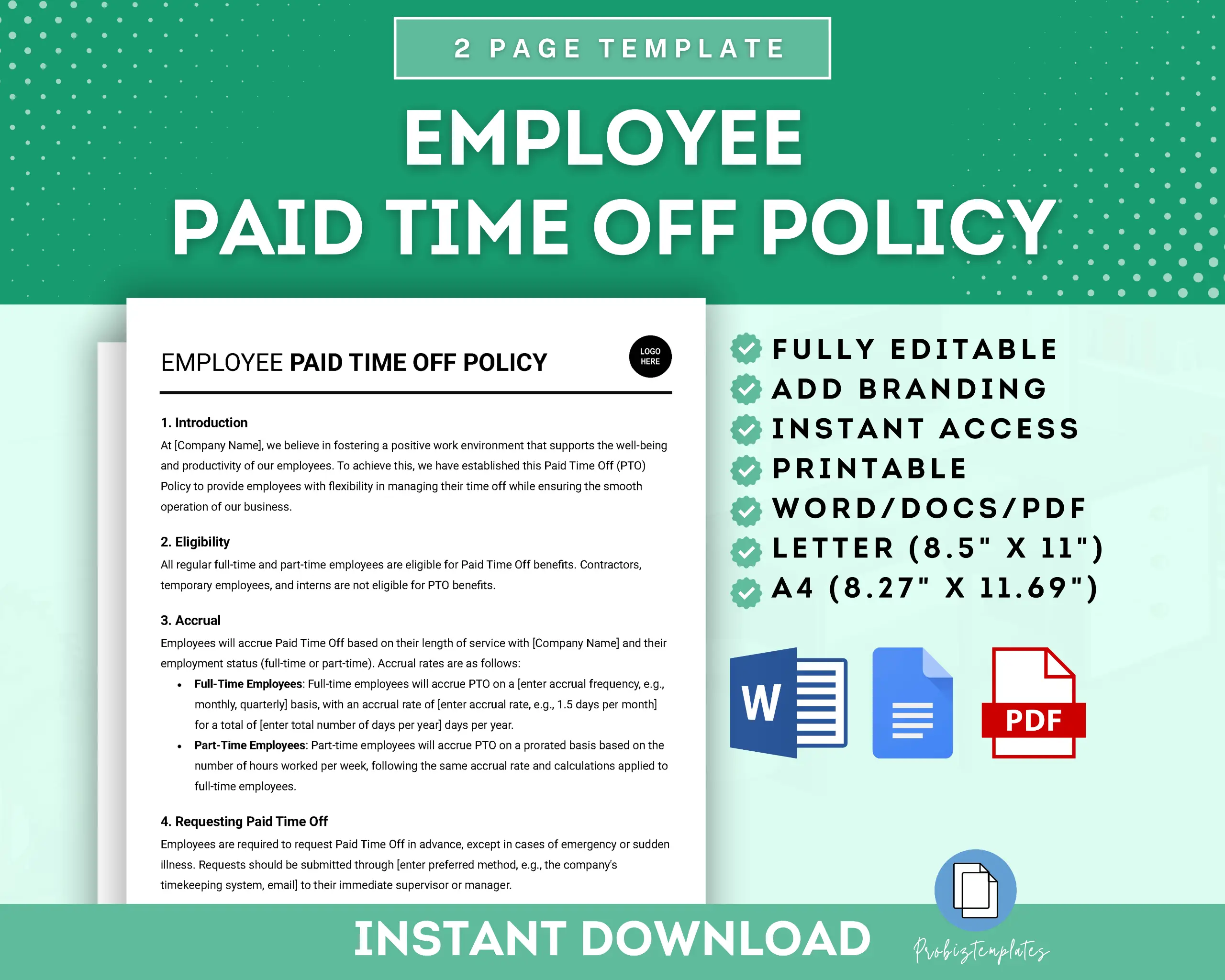 This Employee Paid Time Off Policy template establishes the guidelines and procedures for granting and utilizing paid time off (PTO) within your organization. It defines eligibility criteria, accrual rates, and the process for requesting and approving time off, ensuring clarity and consistency in PTO management.