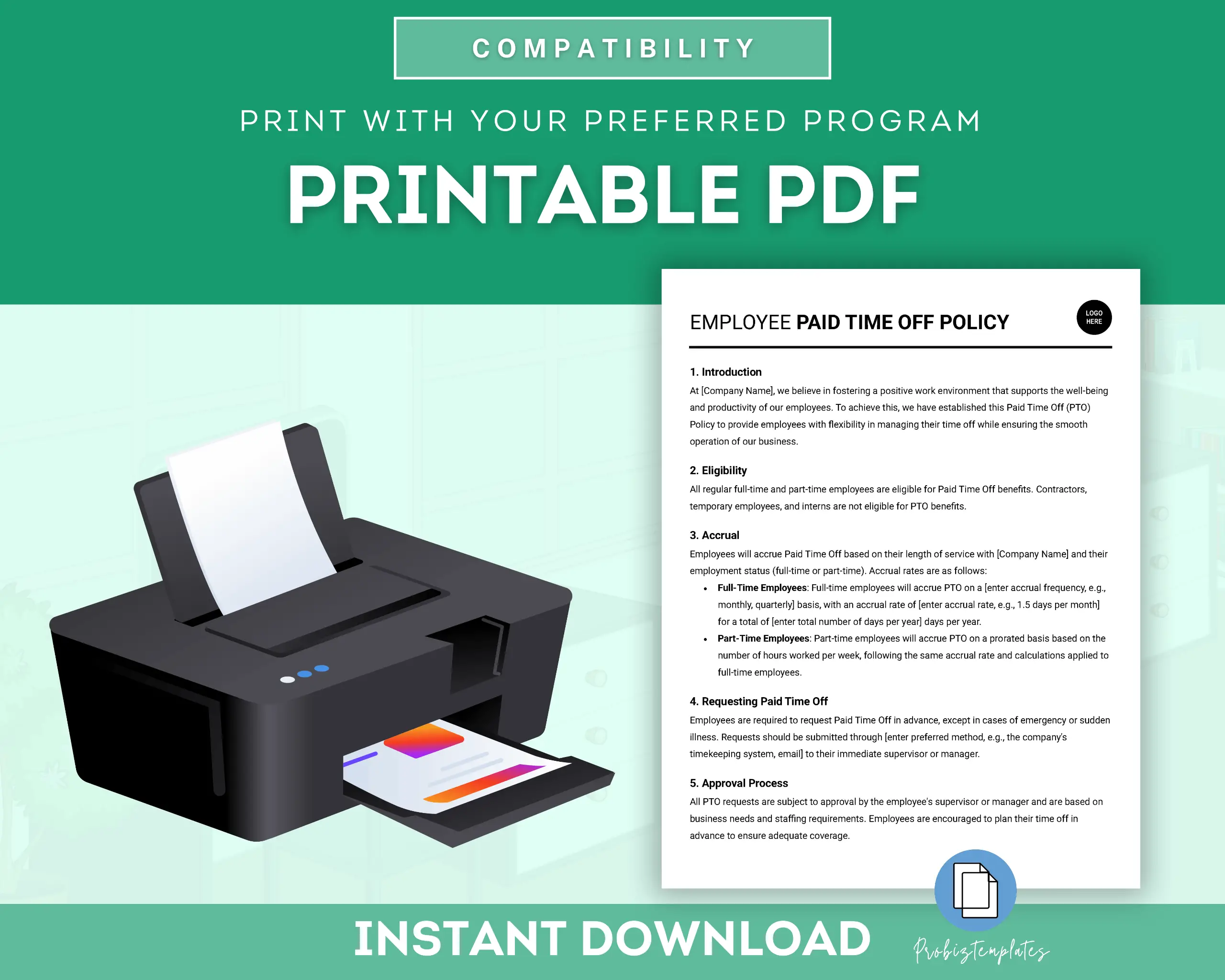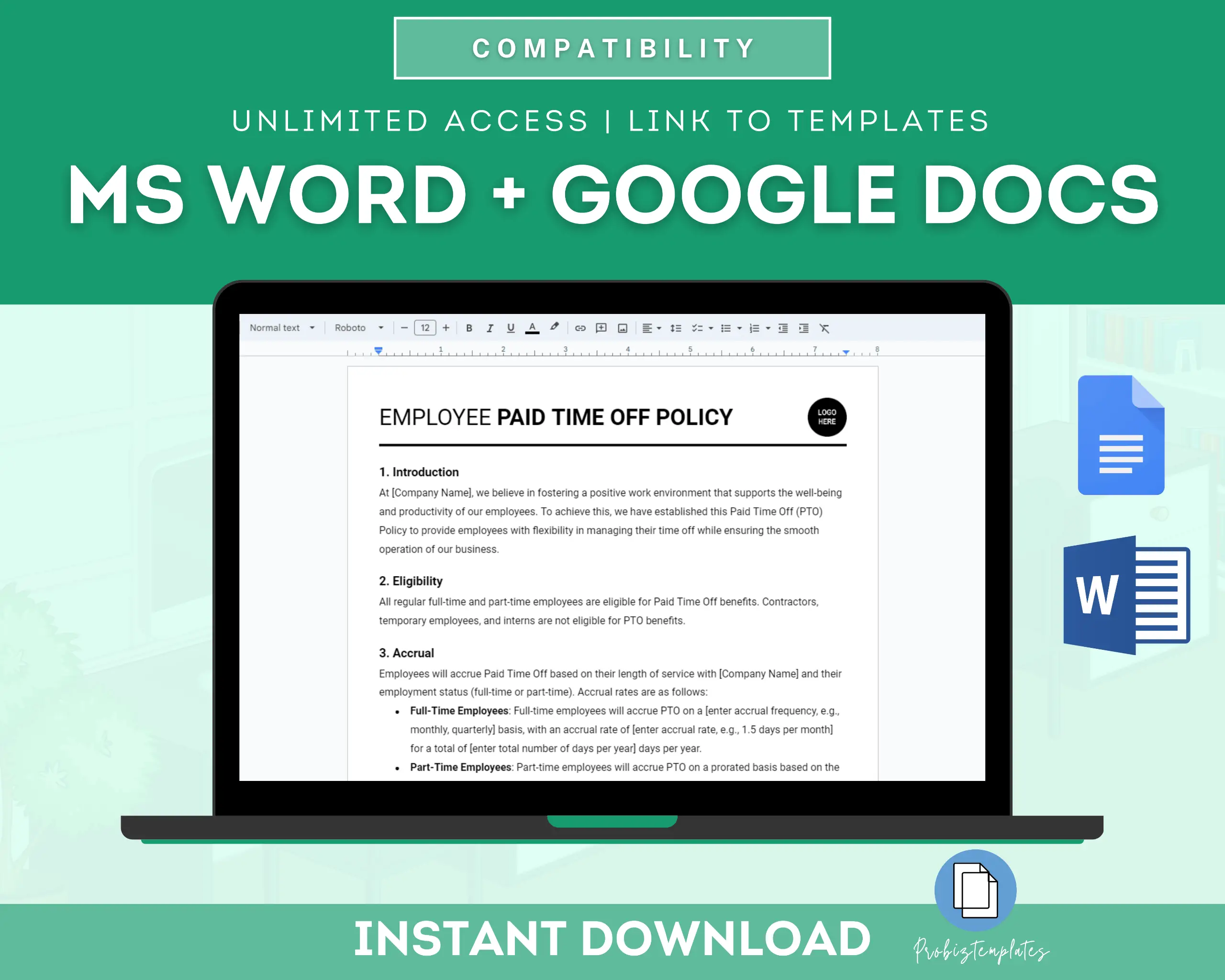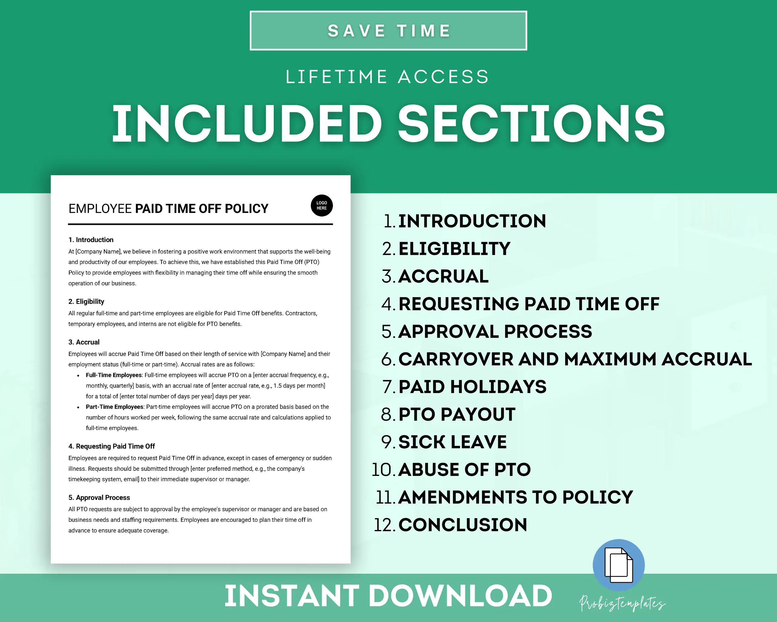 This Employee Paid Time Off Policy template establishes the guidelines and procedures for granting and utilizing paid time off (PTO) within your organization. It defines eligibility criteria, accrual rates, and the process for requesting and approving time off, ensuring clarity and consistency in PTO management.