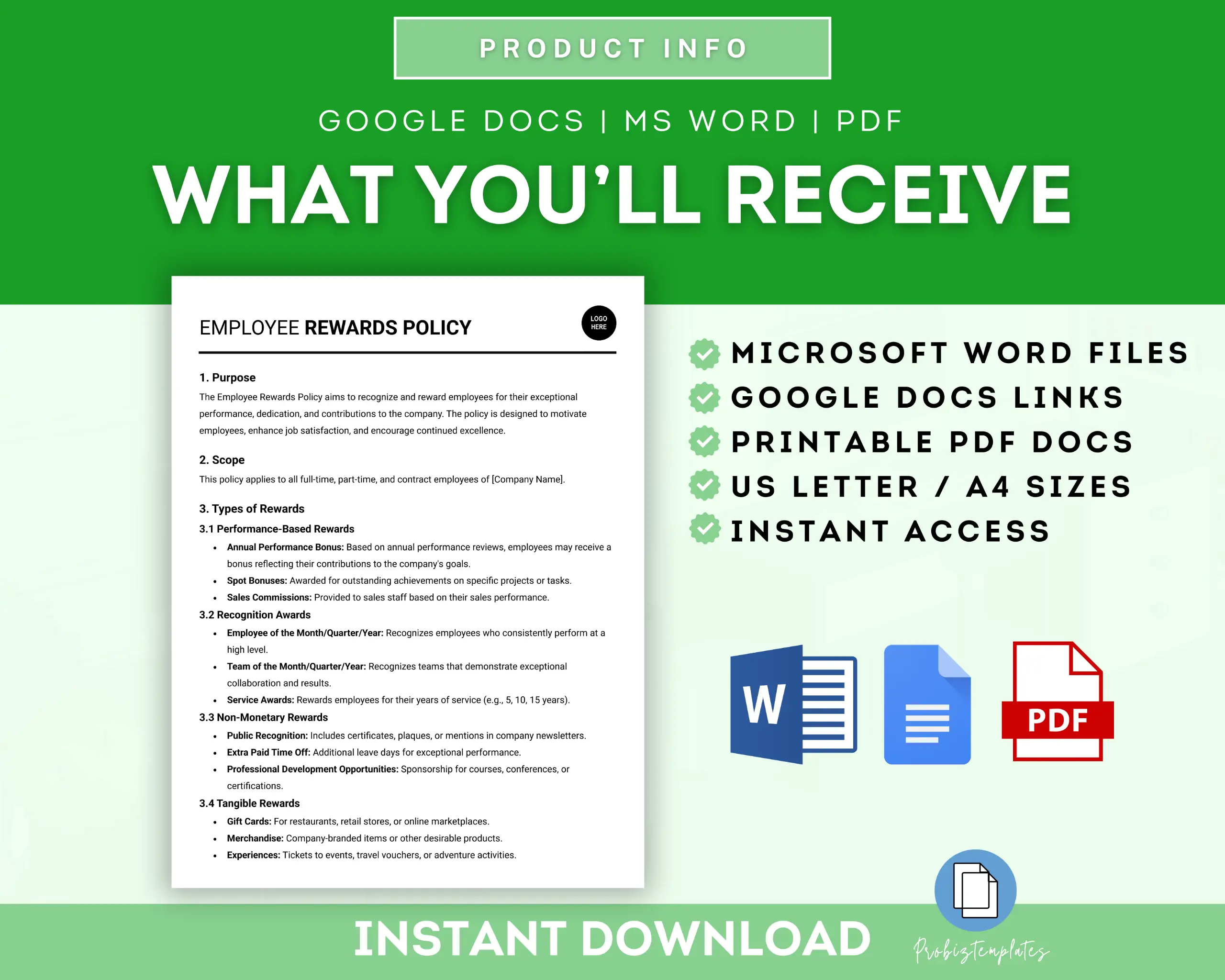 This Employee Rewards Policy template outlines the company’s program for recognizing and rewarding employees. It includes sections on types of rewards, eligibility criteria, and procedures for granting rewards to ensure employee motivation and satisfaction.