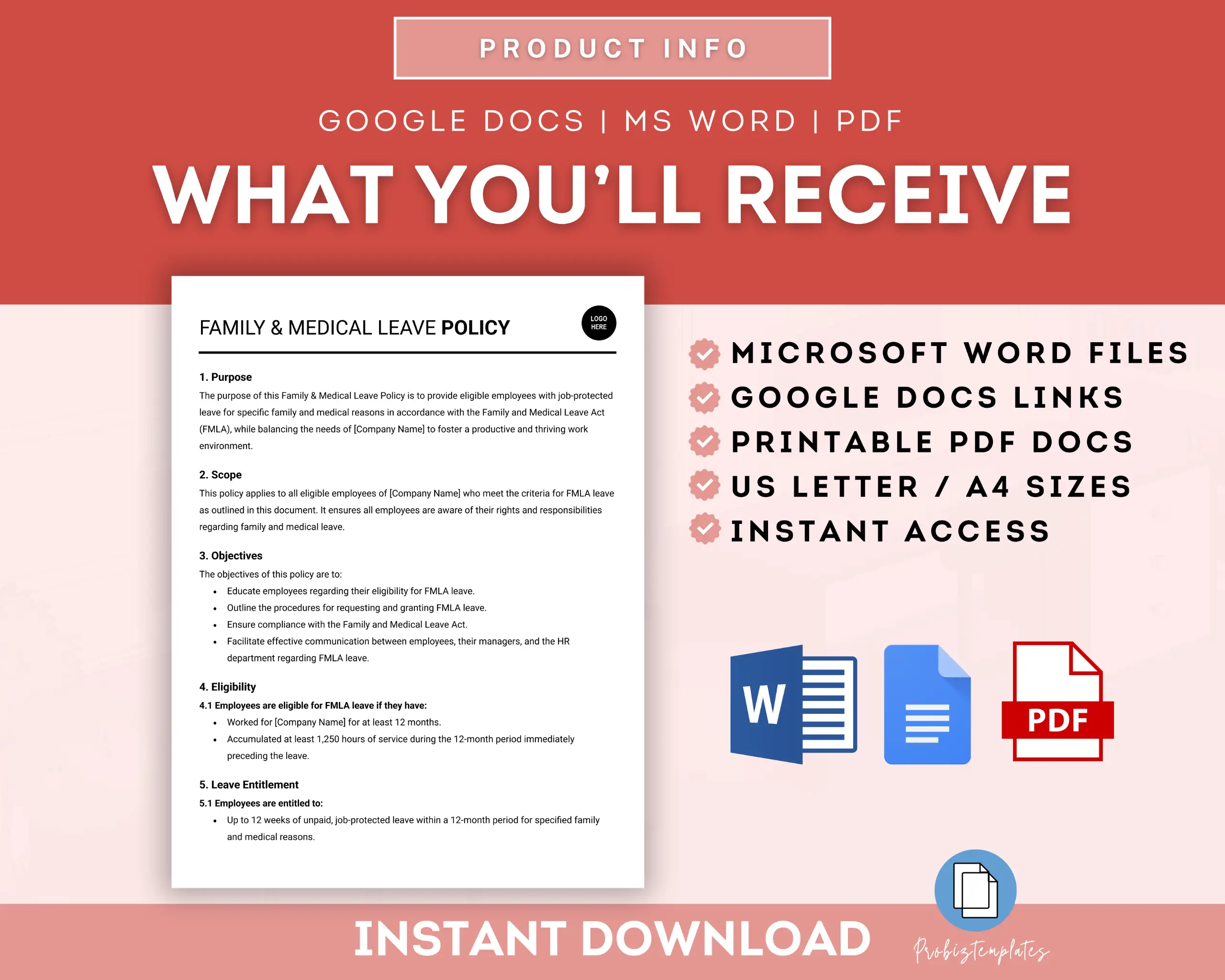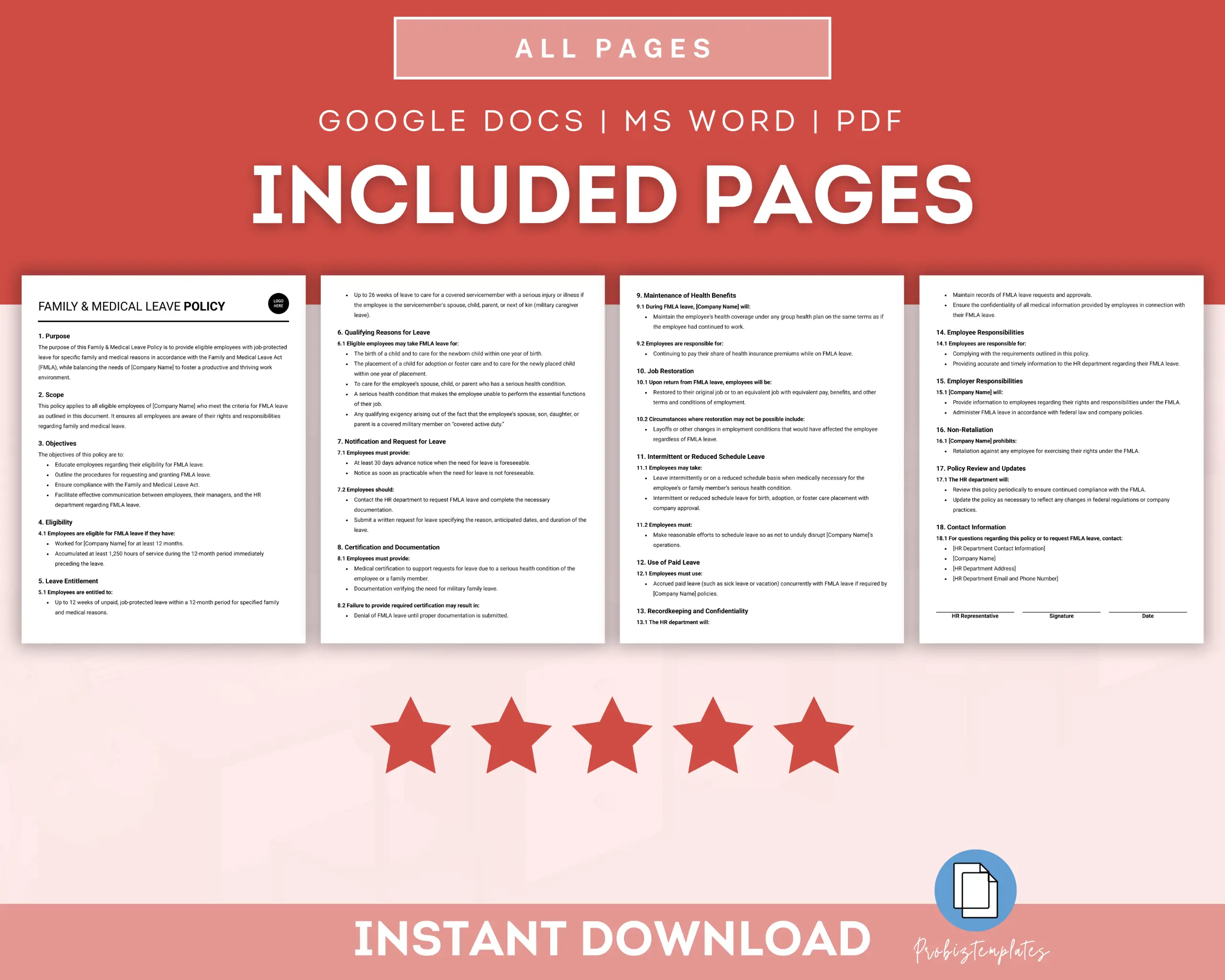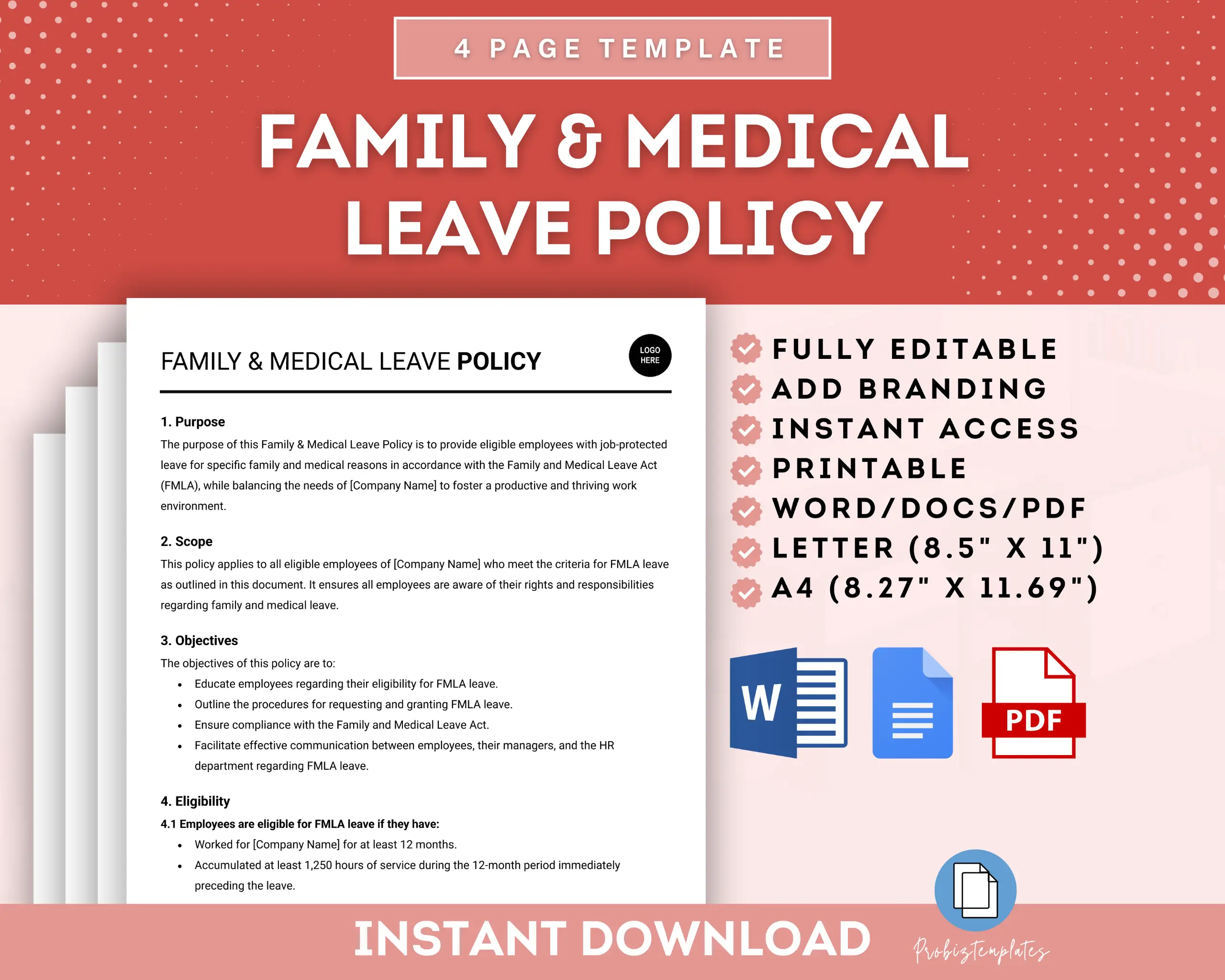 This Family And Medical Leave Policy outlines the company’s guidelines for employee leave due to family or medical reasons. It details eligibility, duration, and procedures for taking leave. Ensure compliance and support for employees in need.