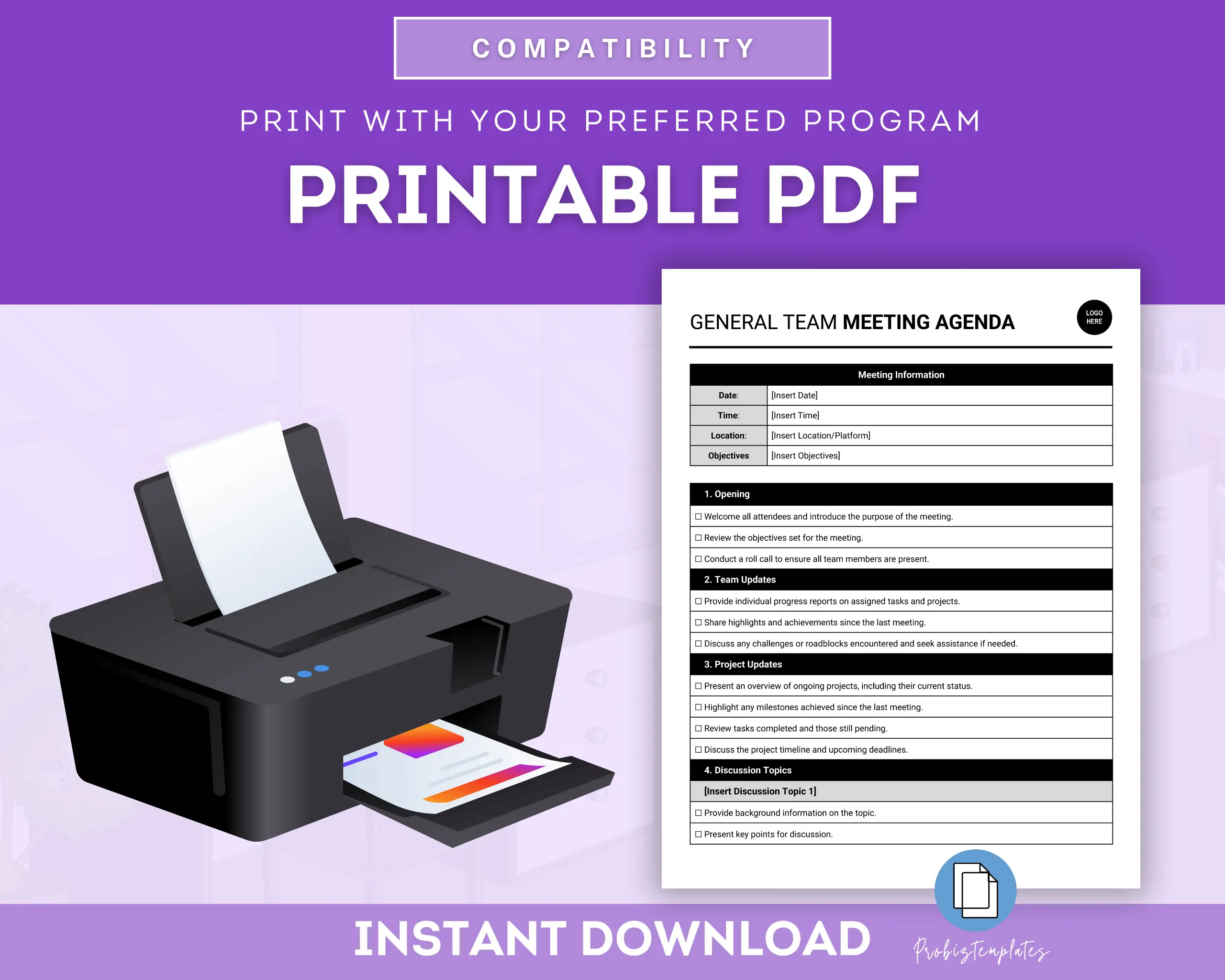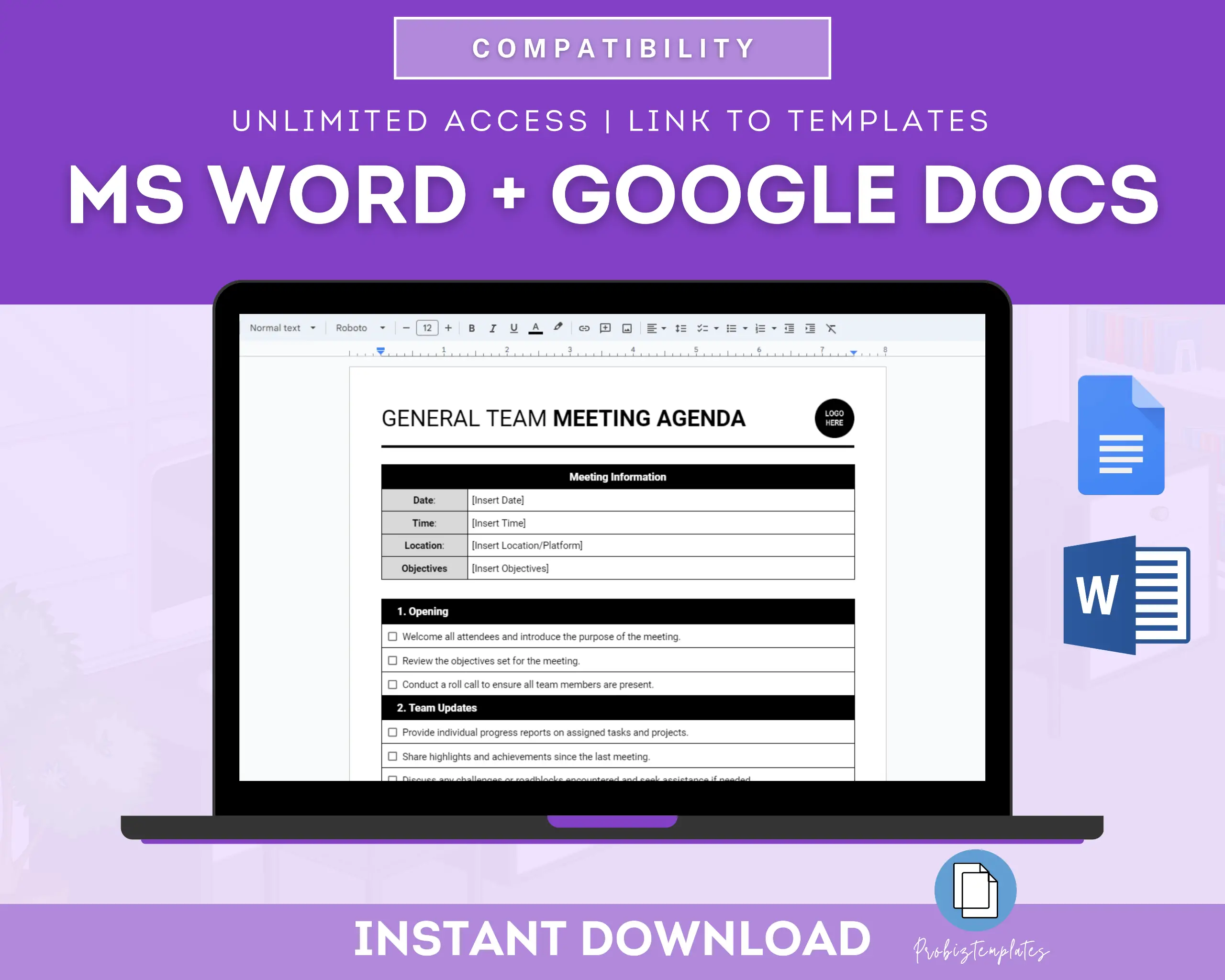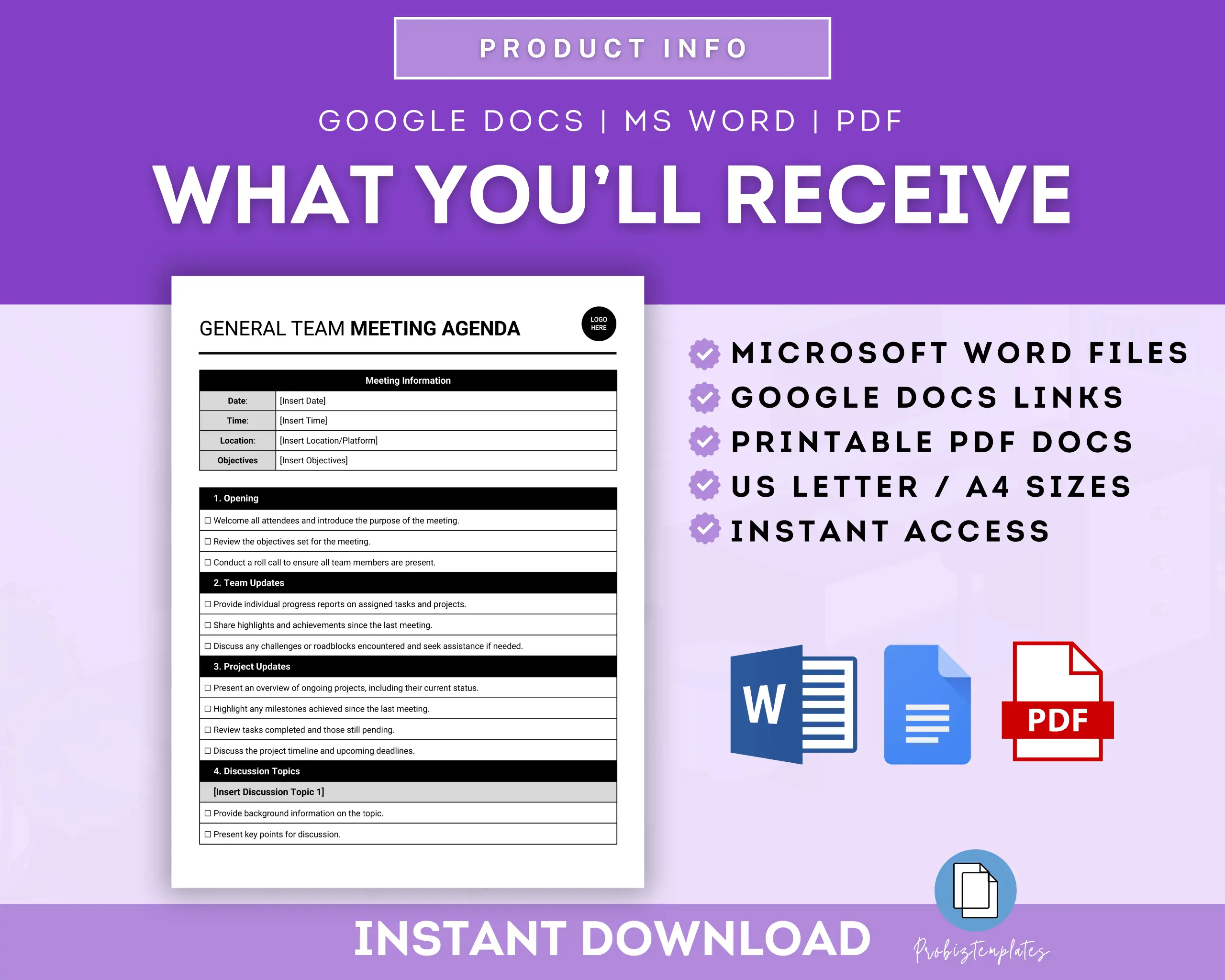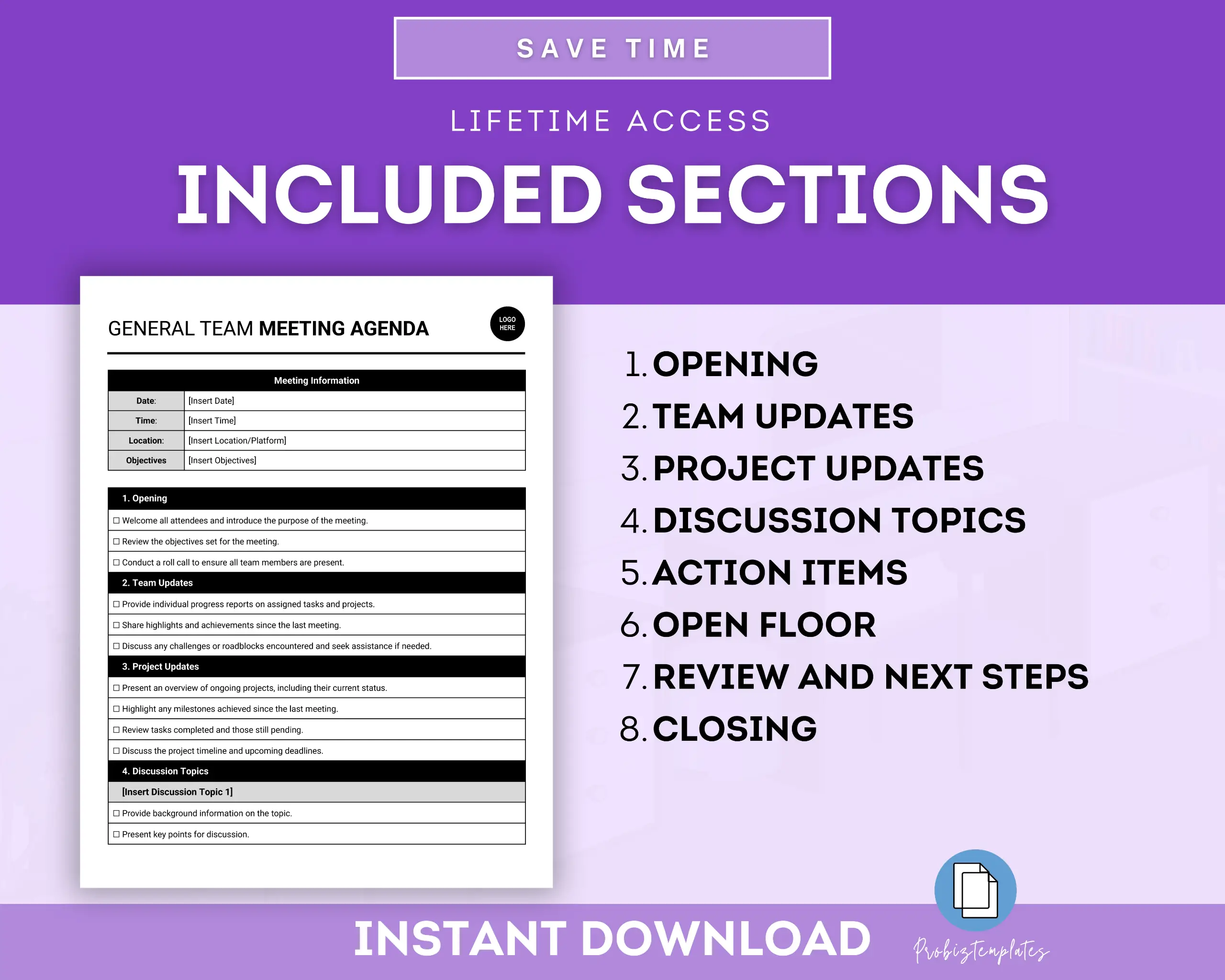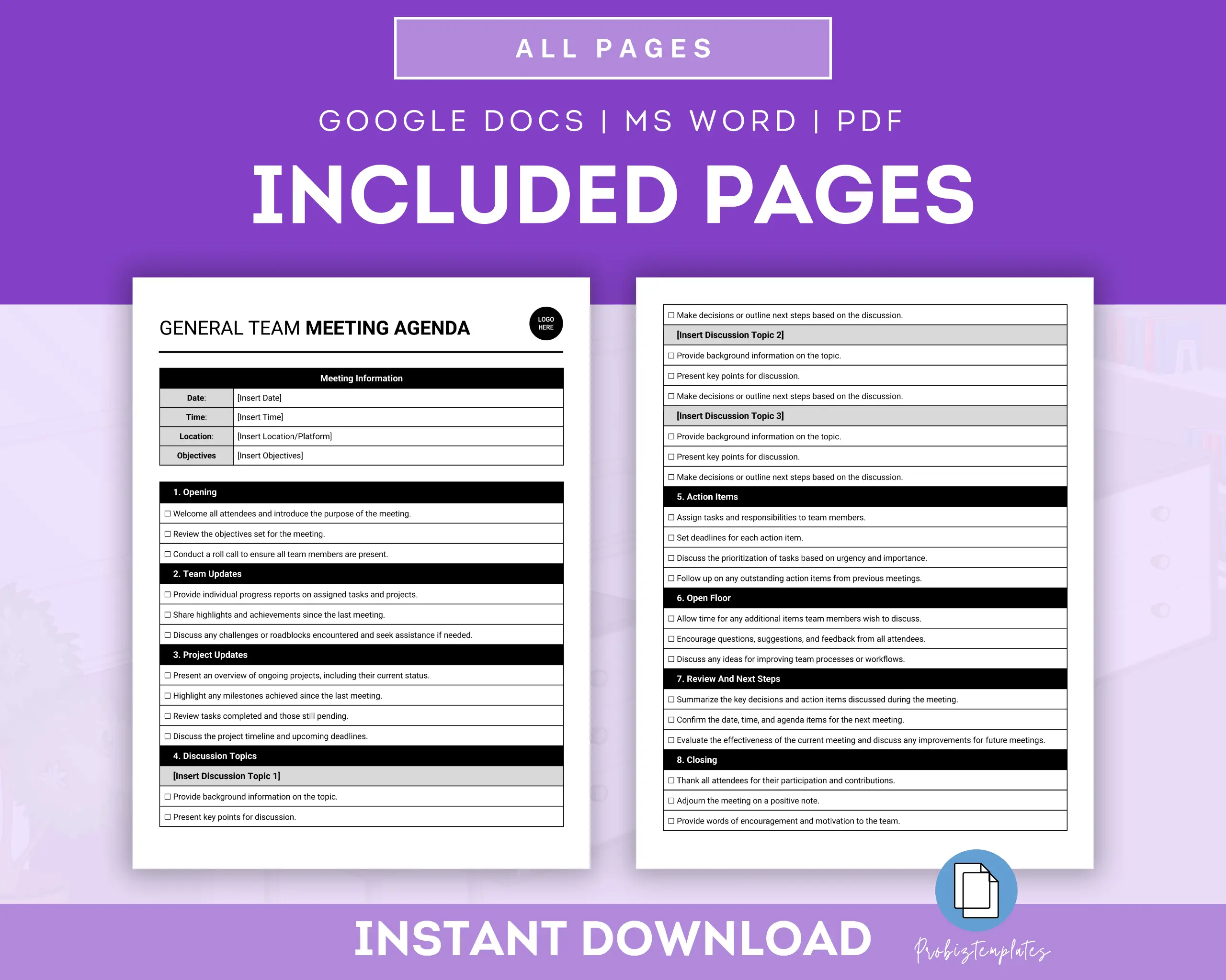This General Team Meeting Agenda Template is a tool for organizing and structuring team meetings effectively. It provides a clear outline of topics to be discussed, such as updates, agenda items, action items, and open discussions, ensuring that everyone stays focused and on track during the meeting.