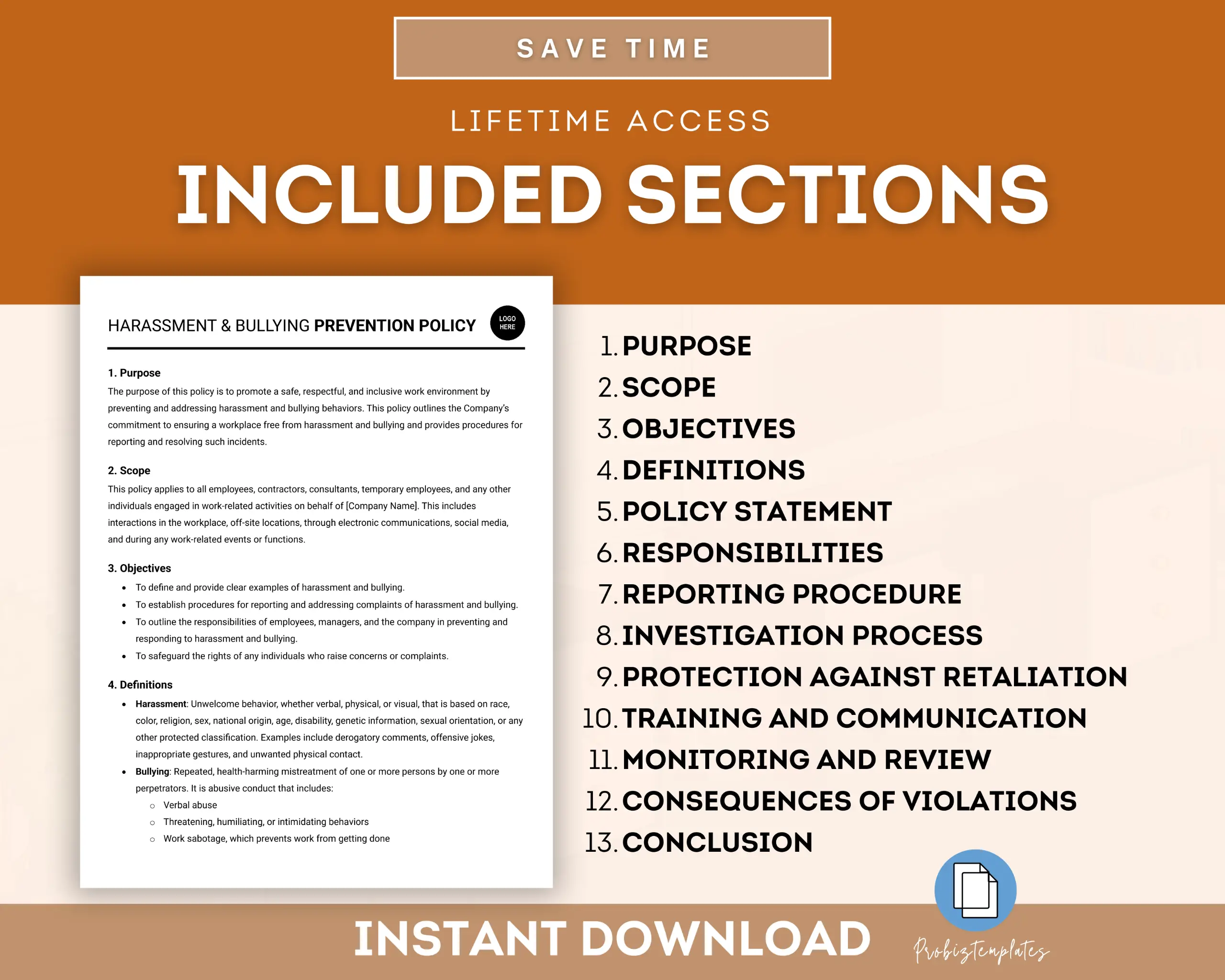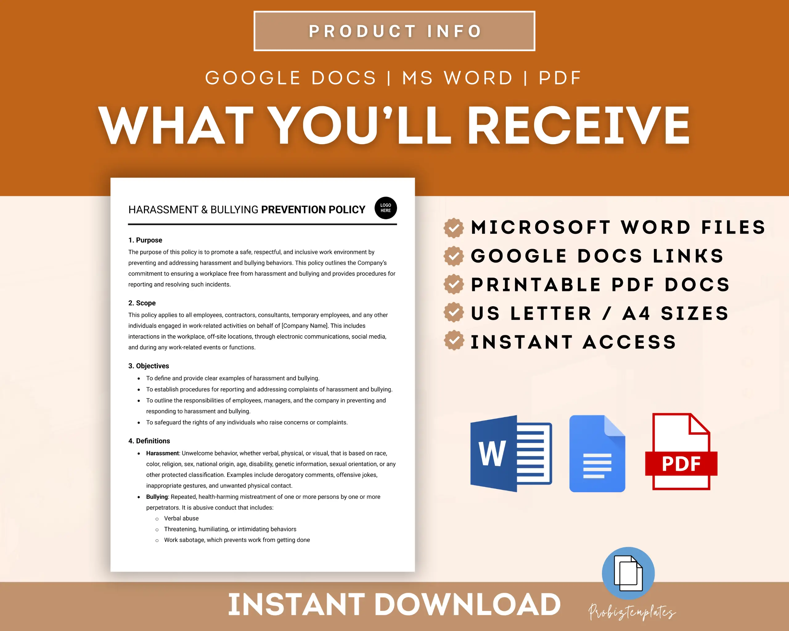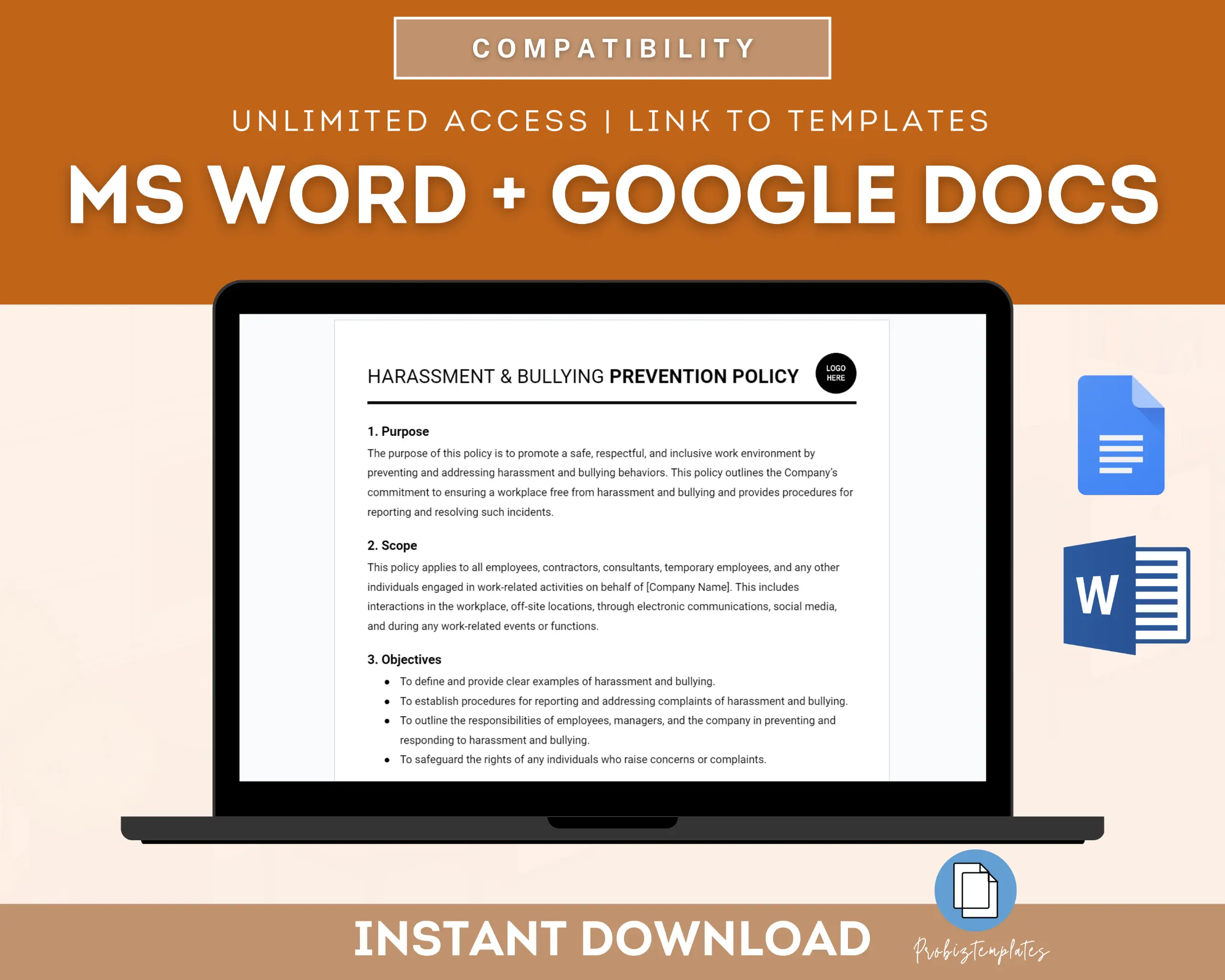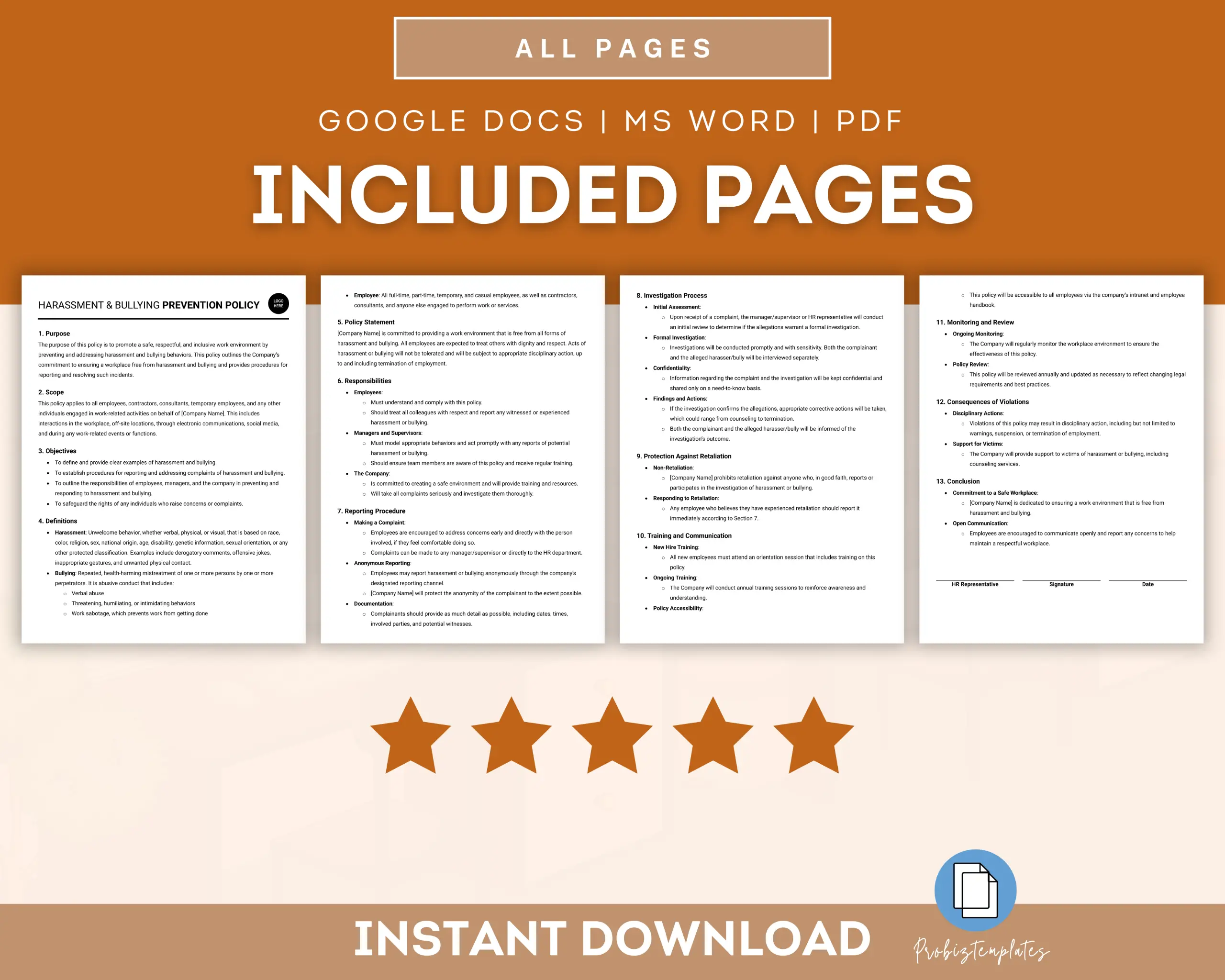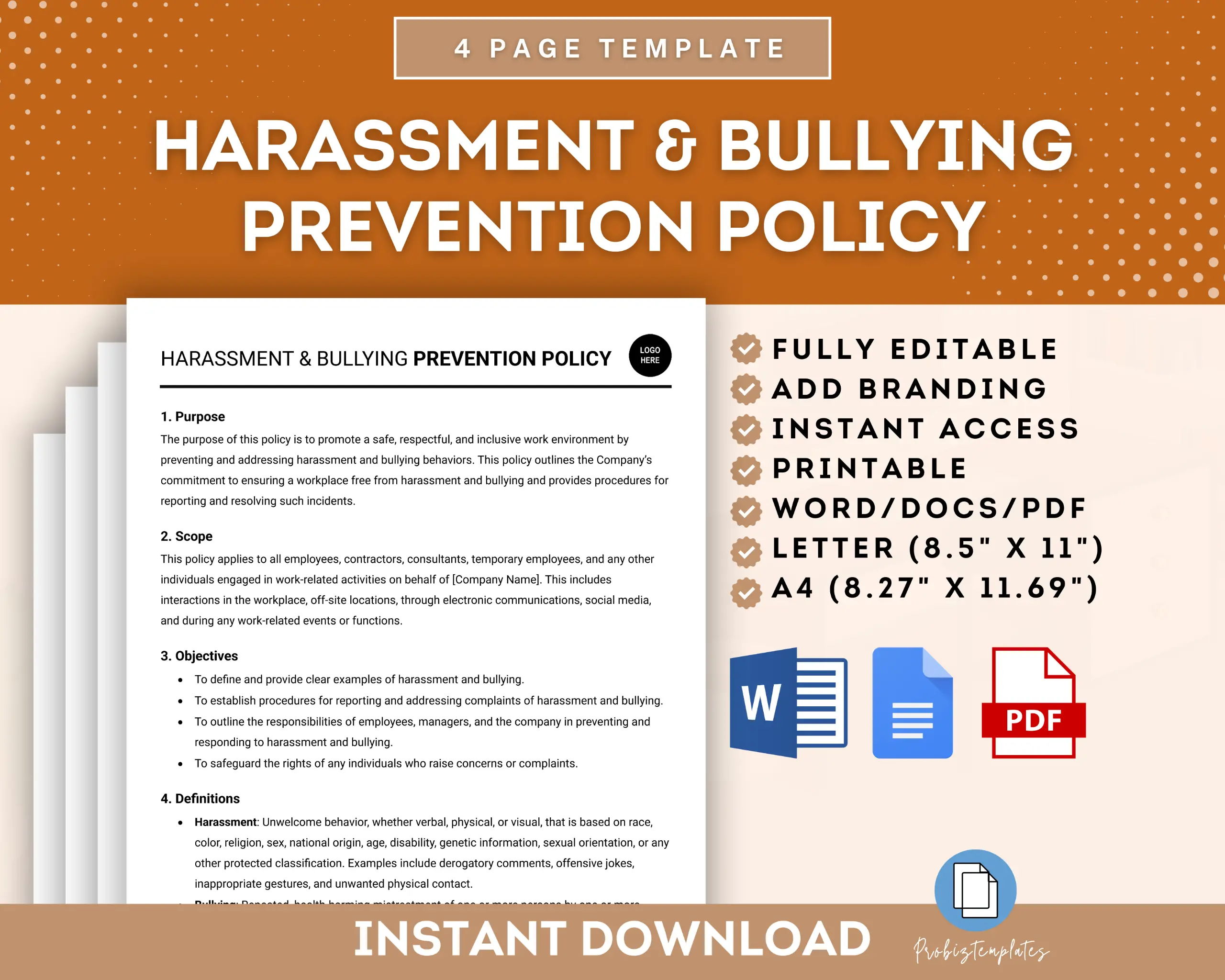 This Harassment And Bullying Prevention Policy template outlines measures to prevent harassment and bullying in the workplace. It includes reporting procedures, disciplinary actions, and support resources, promoting a safe work environment.