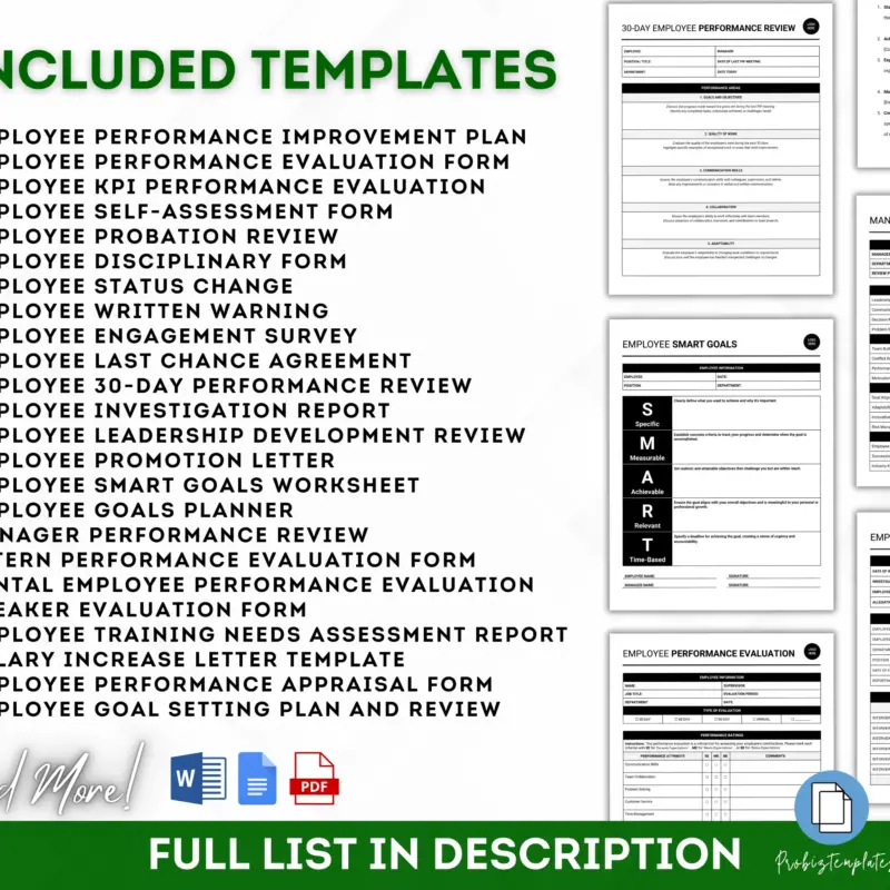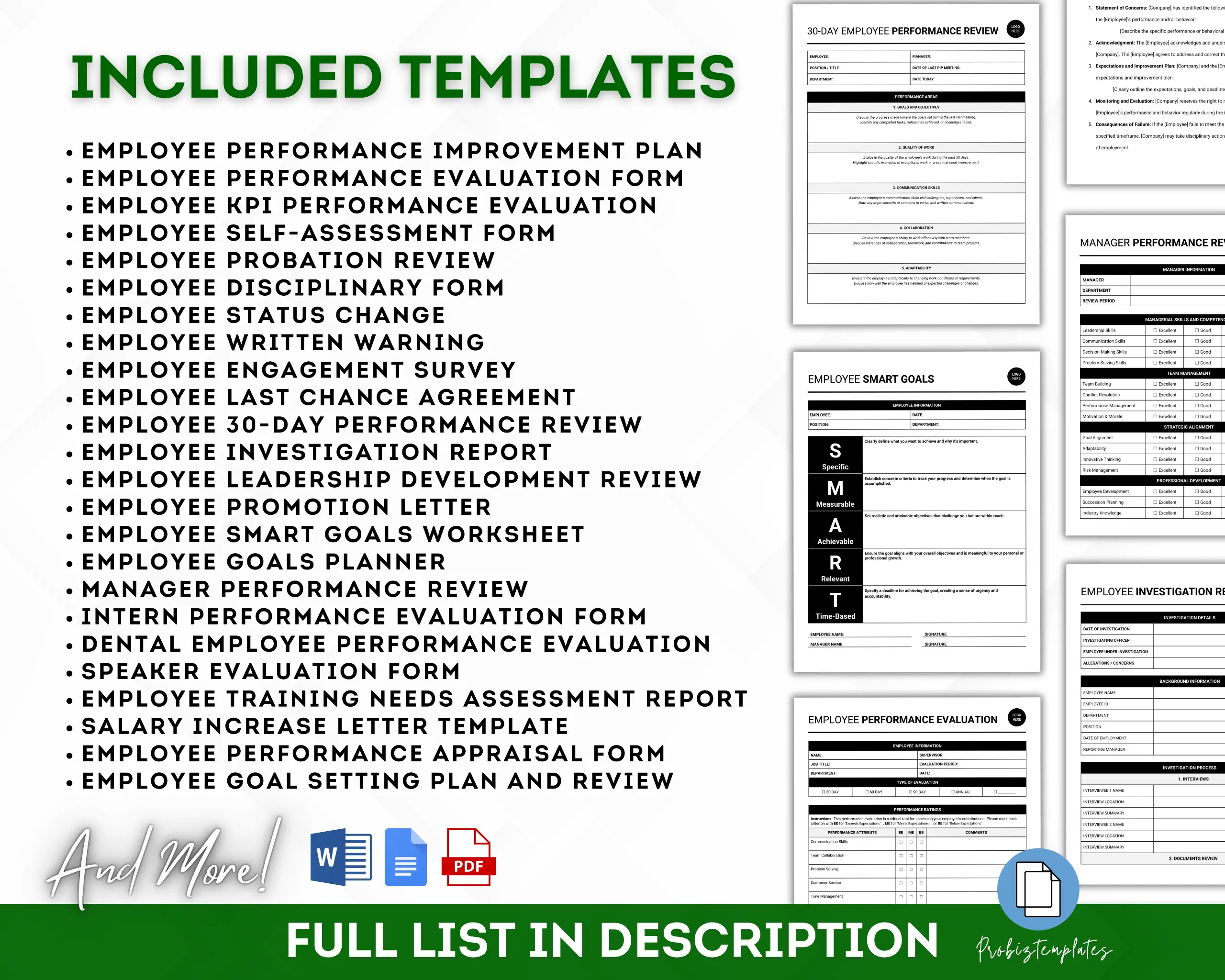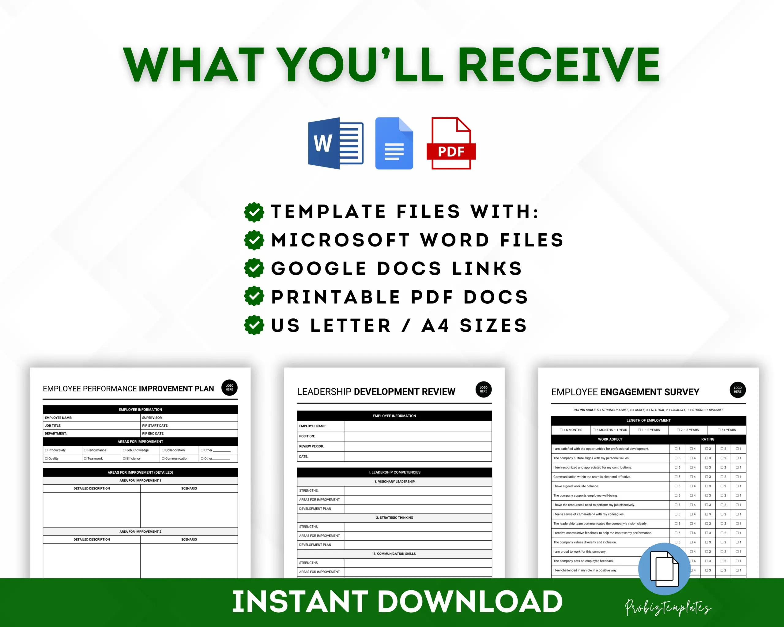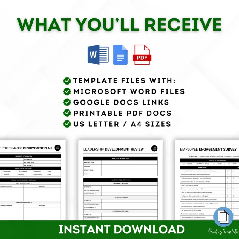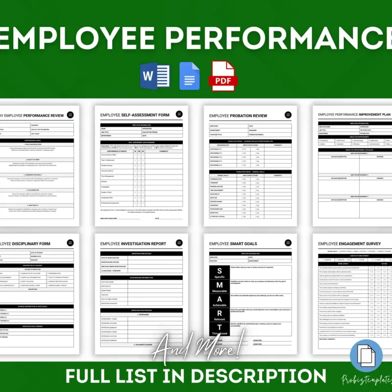 Our HR Employee Performance Review Bundle is a practical collection of essential tools to streamline your employee management processes. This bundle includes key documents such as Performance Improvement Plans, Evaluation Forms, Self-Assessment Forms, Probation Reviews, Disciplinary Forms, Status Change templates, Written Warnings, and more.