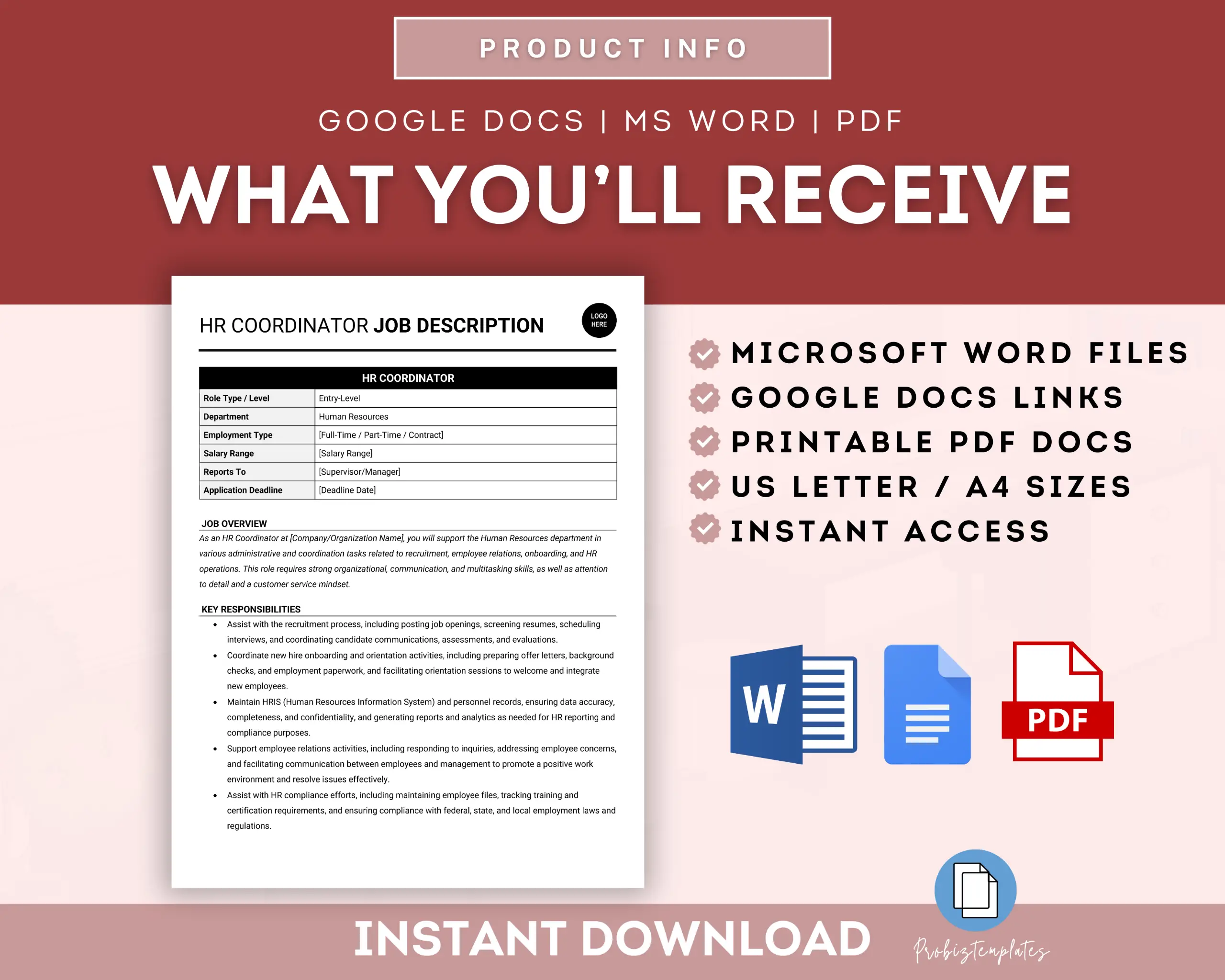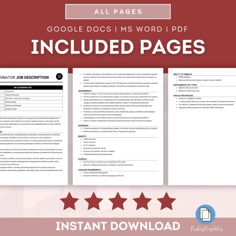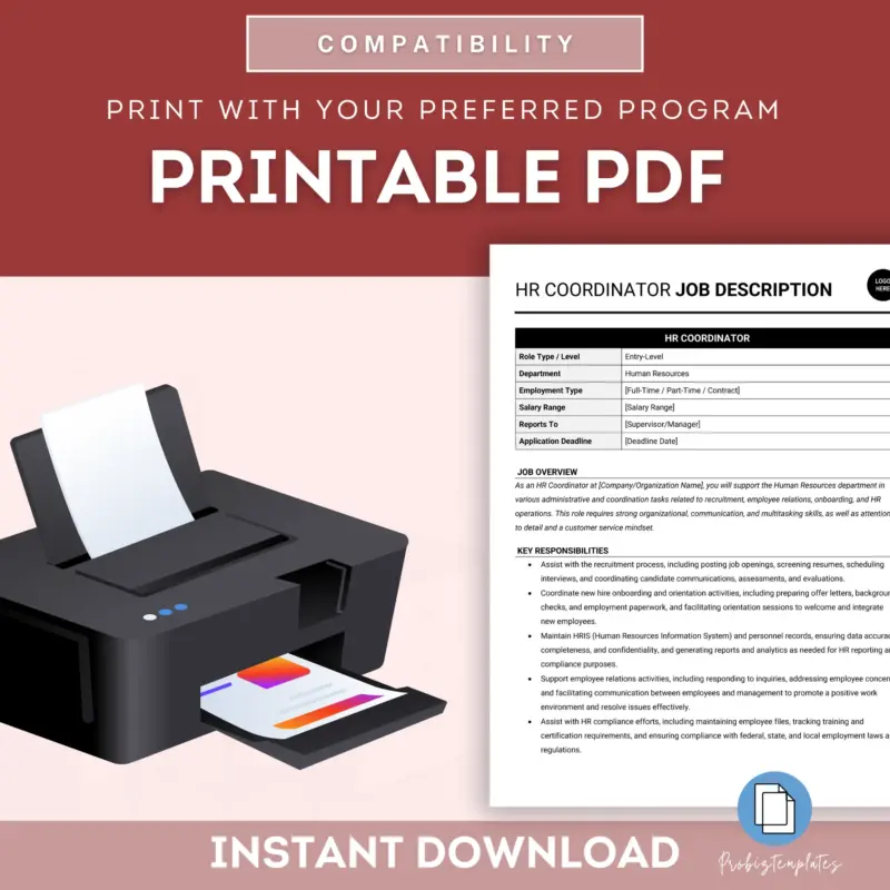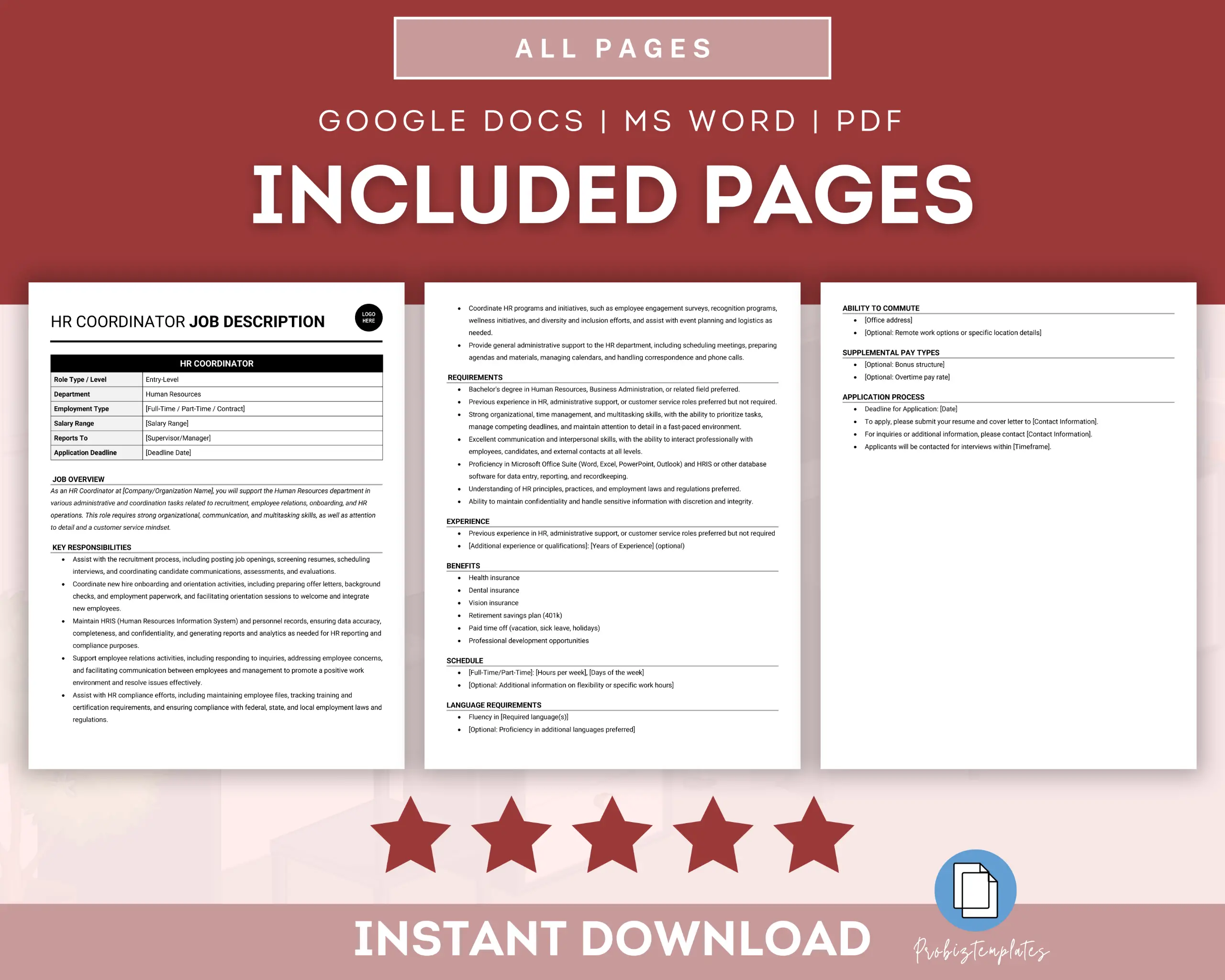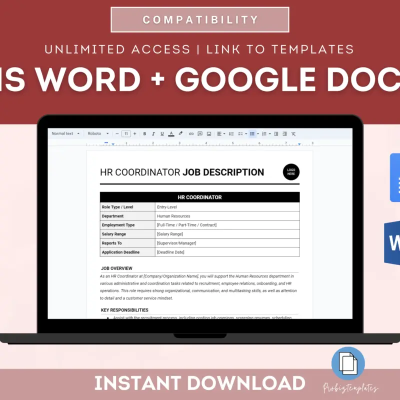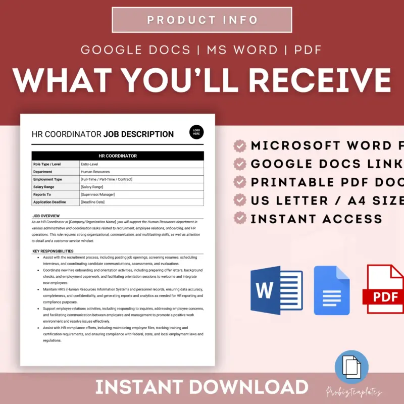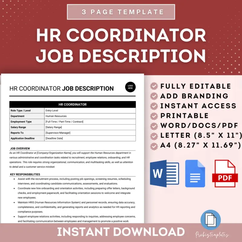 This HR Coordinator Job Description template outlines the responsibilities and qualifications for HR coordinators. It includes tasks such as recruitment support, employee onboarding, and HR administration to ensure smooth HR operations.