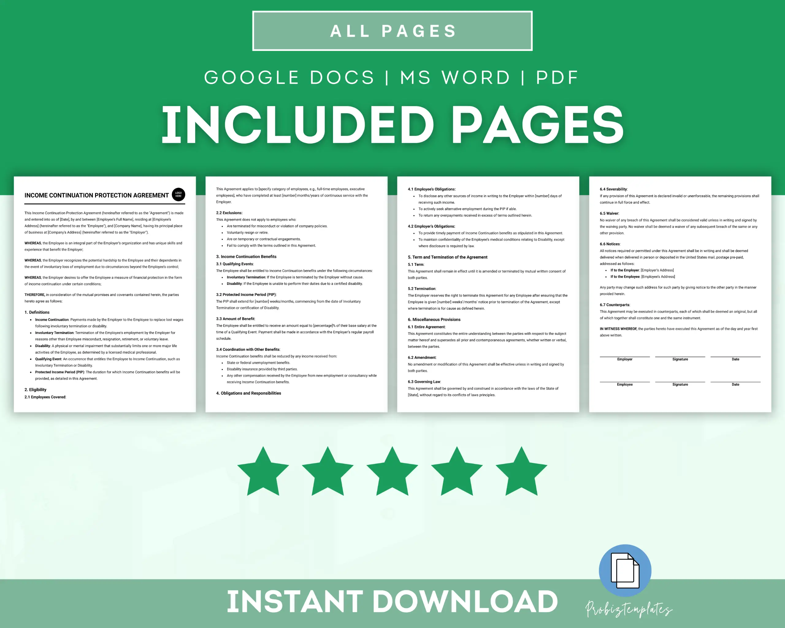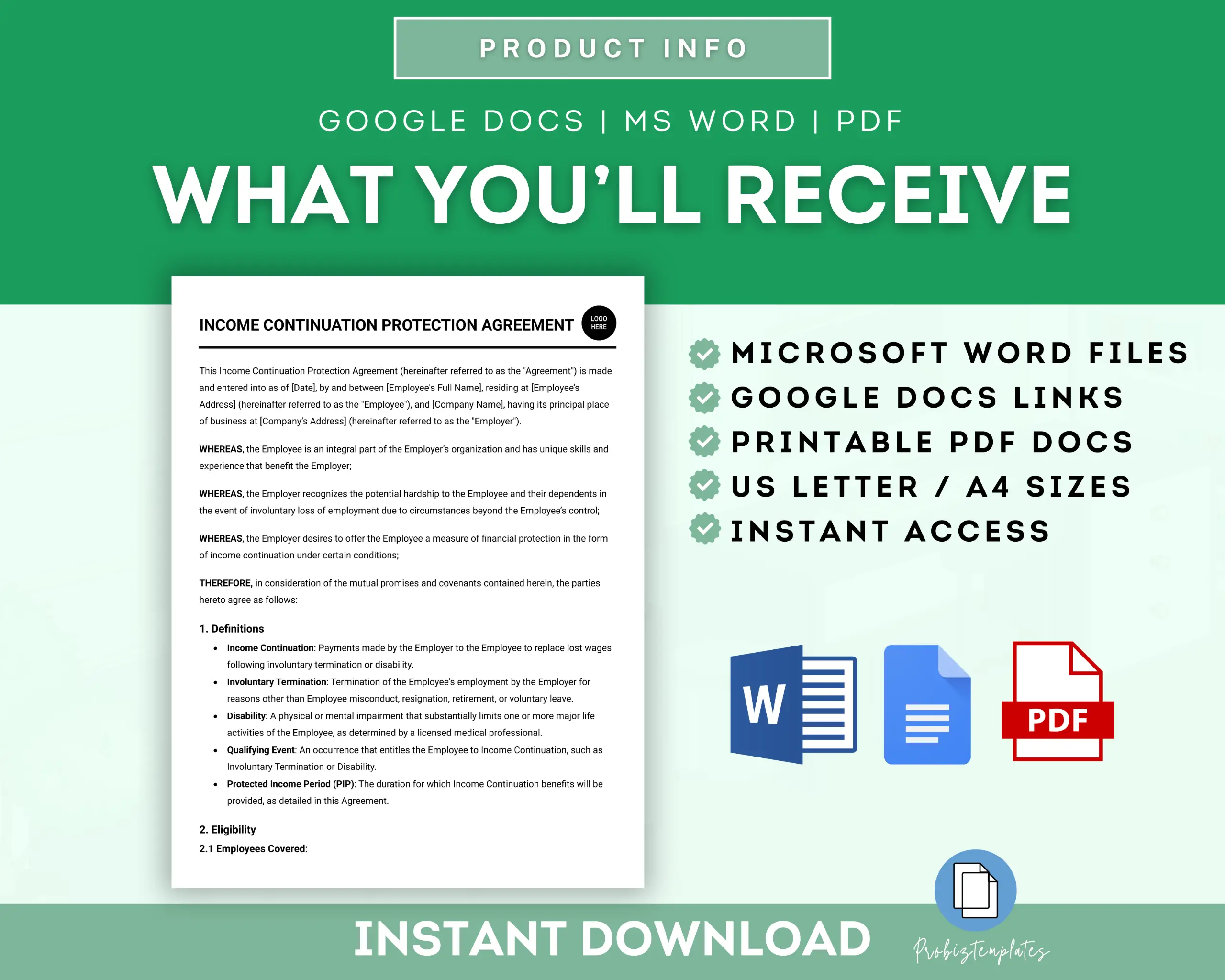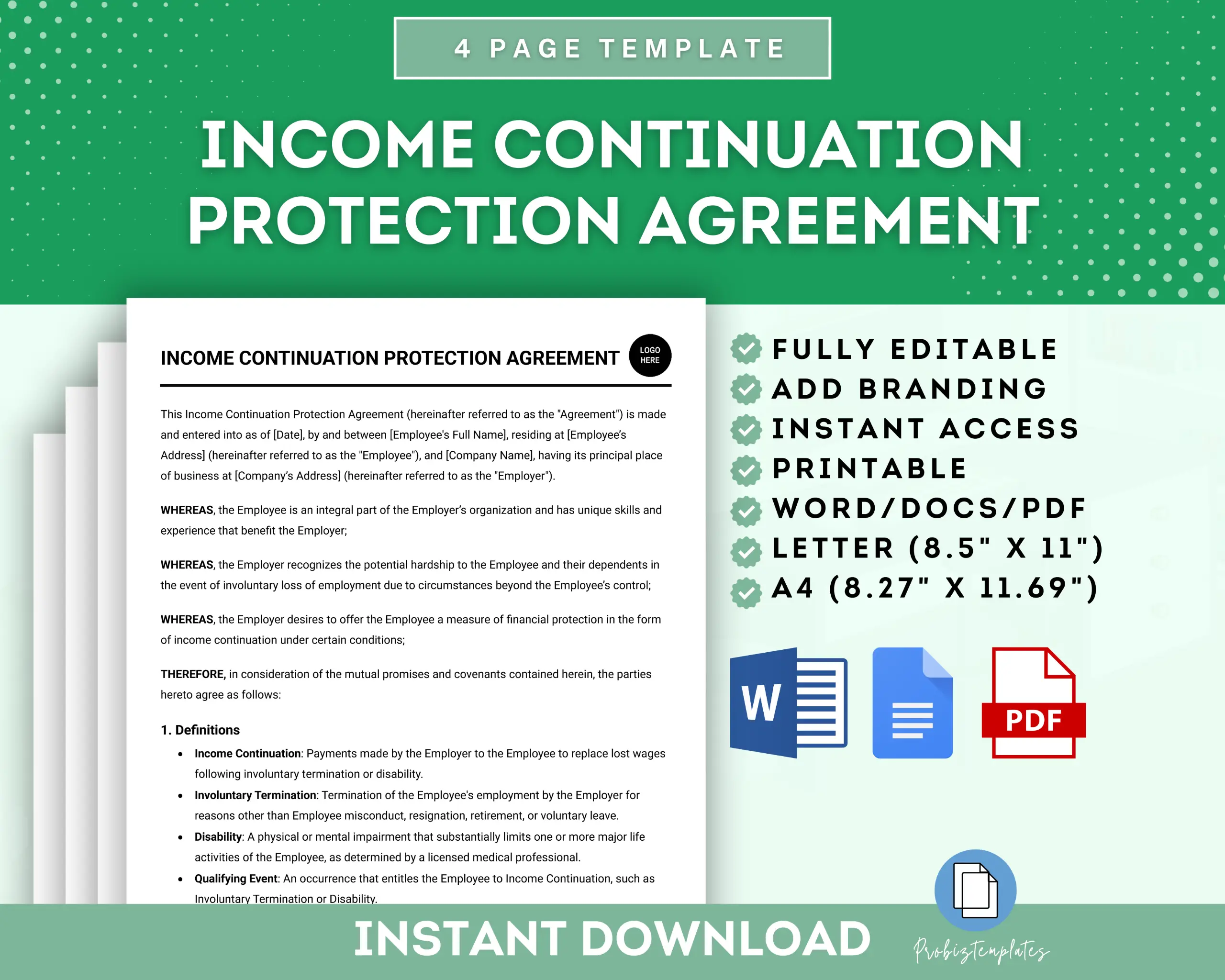 This Income Continuation Protection Agreement template outlines the terms for providing income protection to employees. It includes coverage details, payment terms, and eligibility criteria, ensuring financial security for employees.