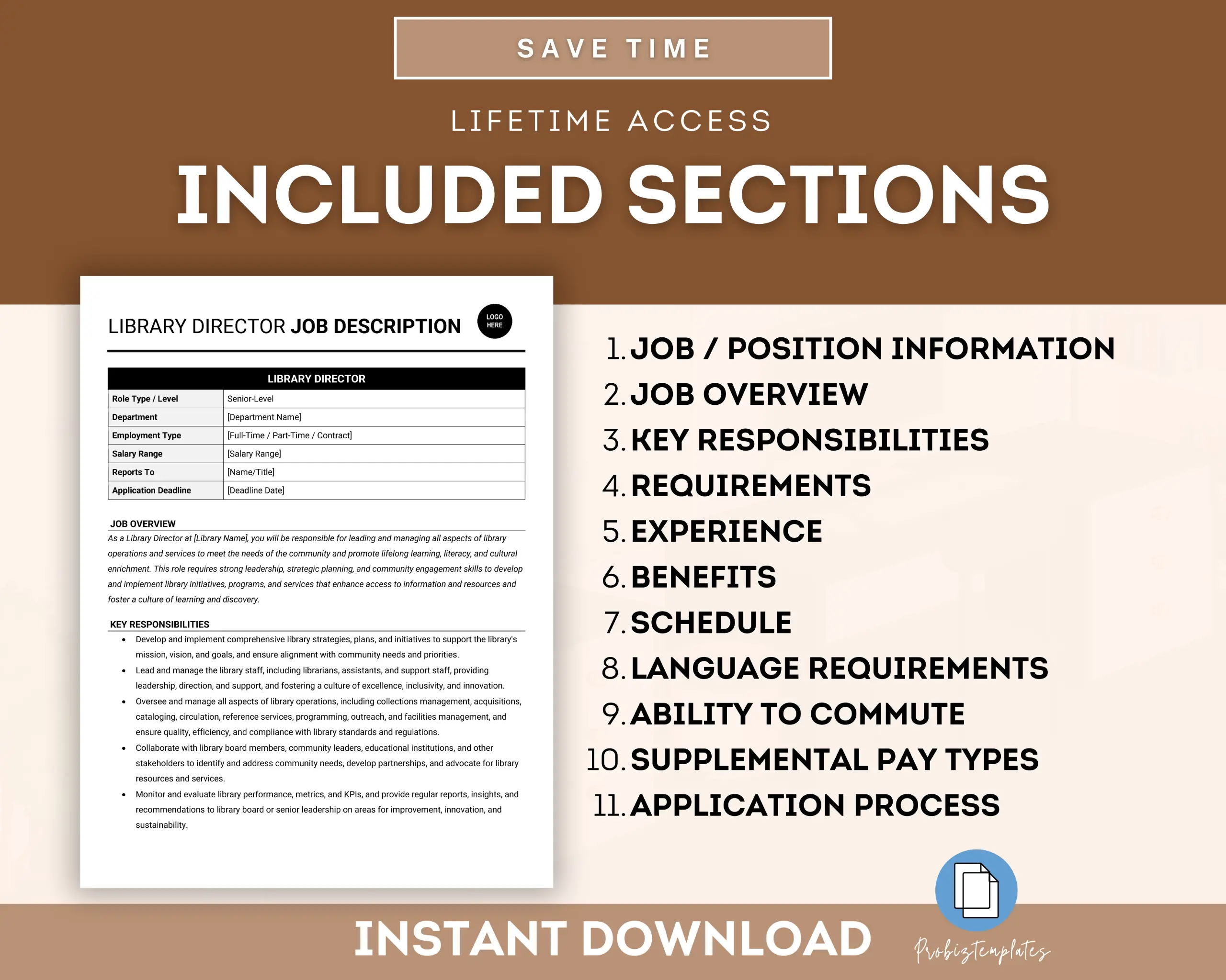 This Library Director Job Description template details the responsibilities and qualifications for a library director. It includes duties such as overseeing library operations, managing staff, and developing library programs and services.
