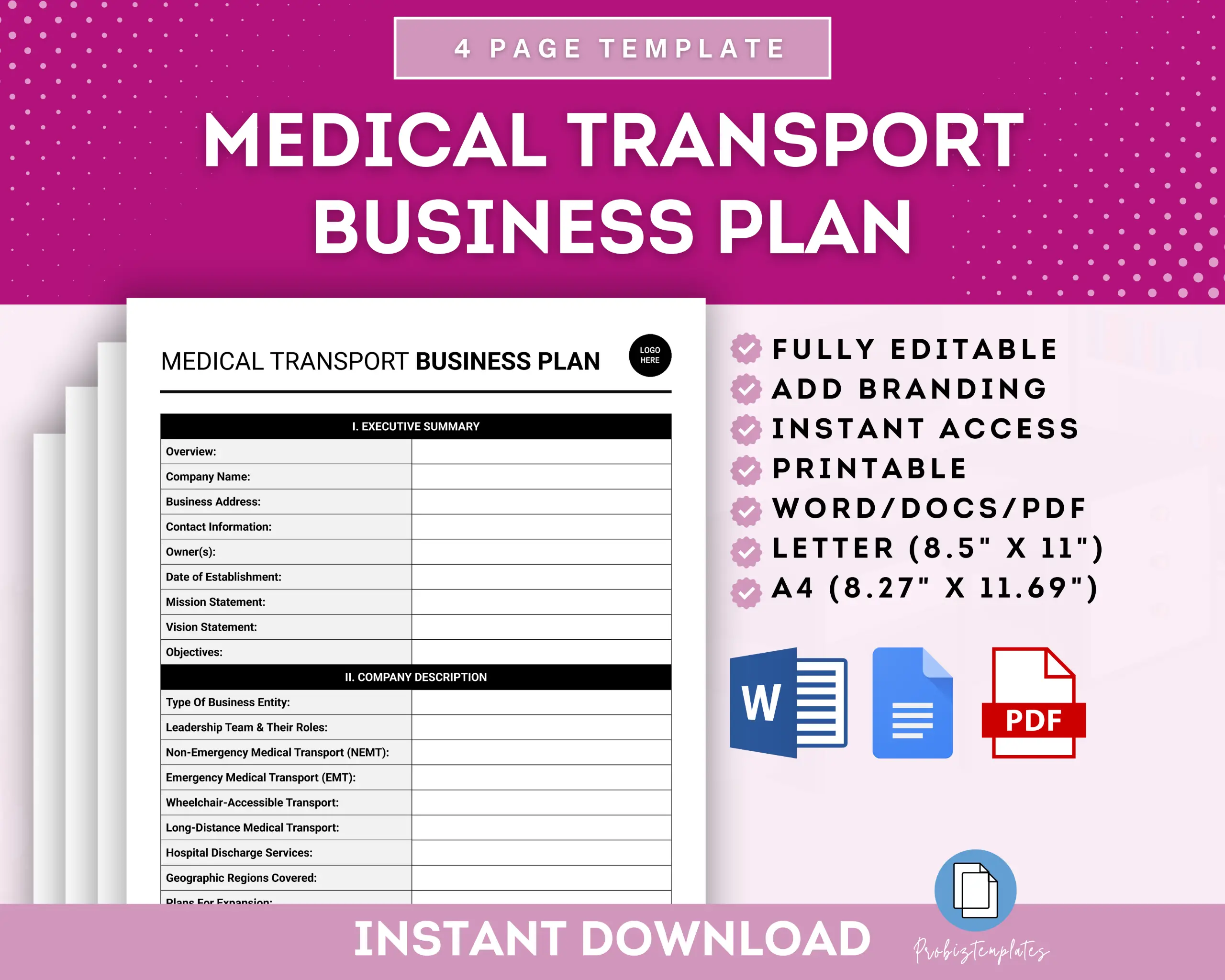 This business plan template helps individuals start a medical transport service. It includes sections for business strategies, services, market analysis, financial projections, and more ensuring a thorough and organized plan for success.