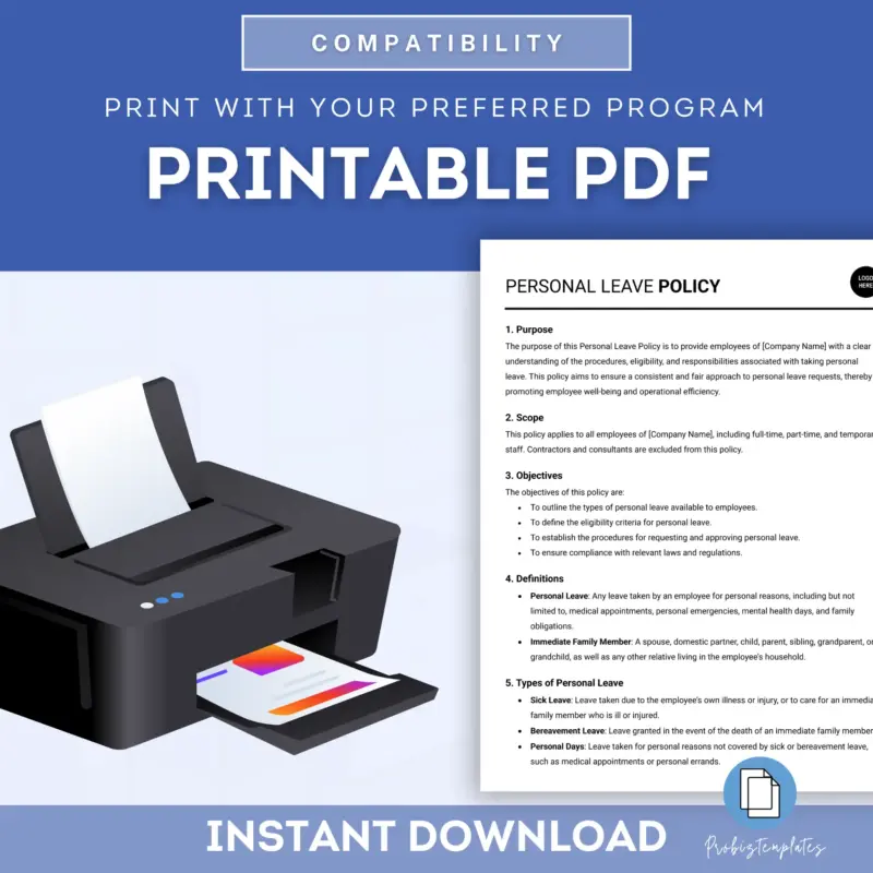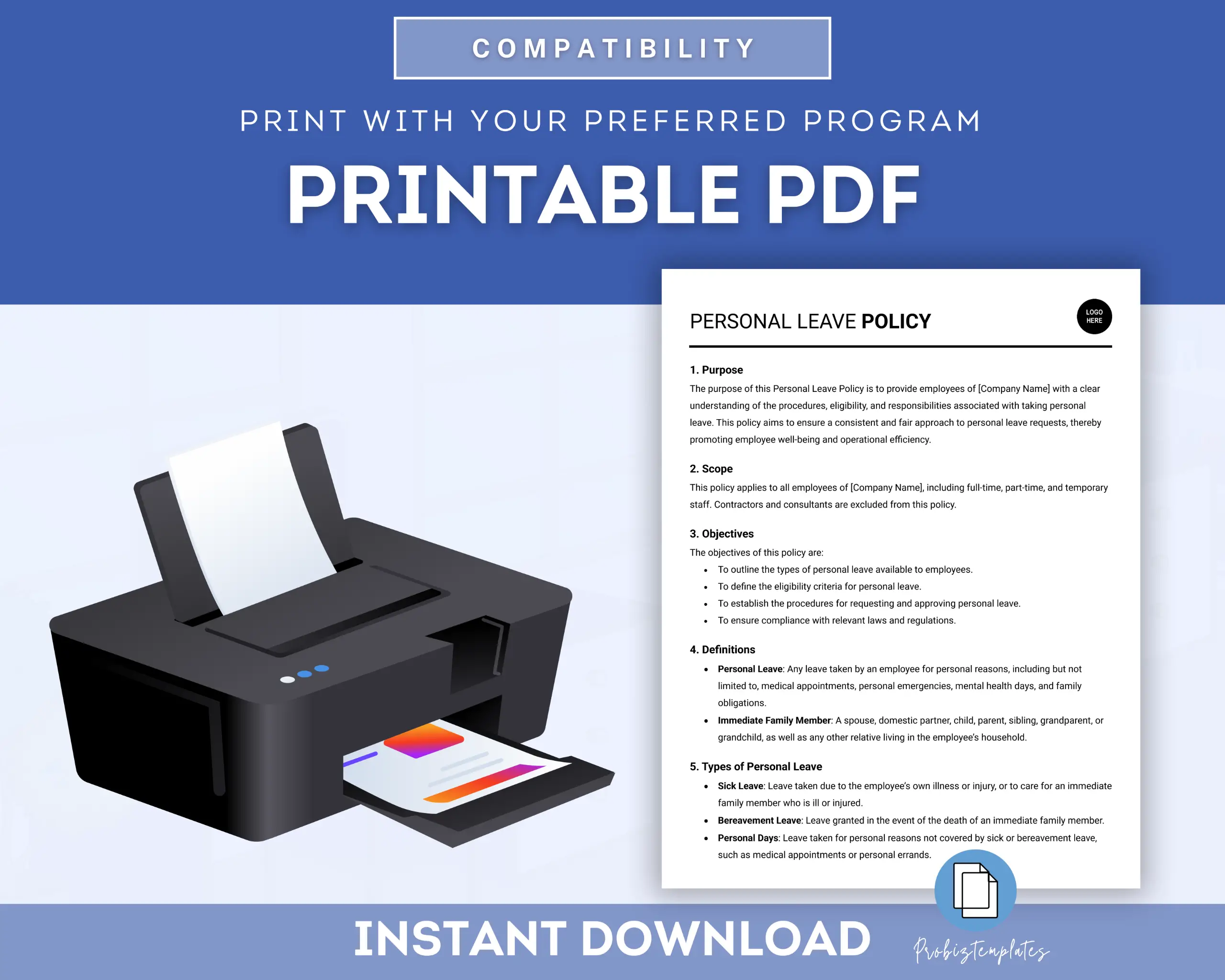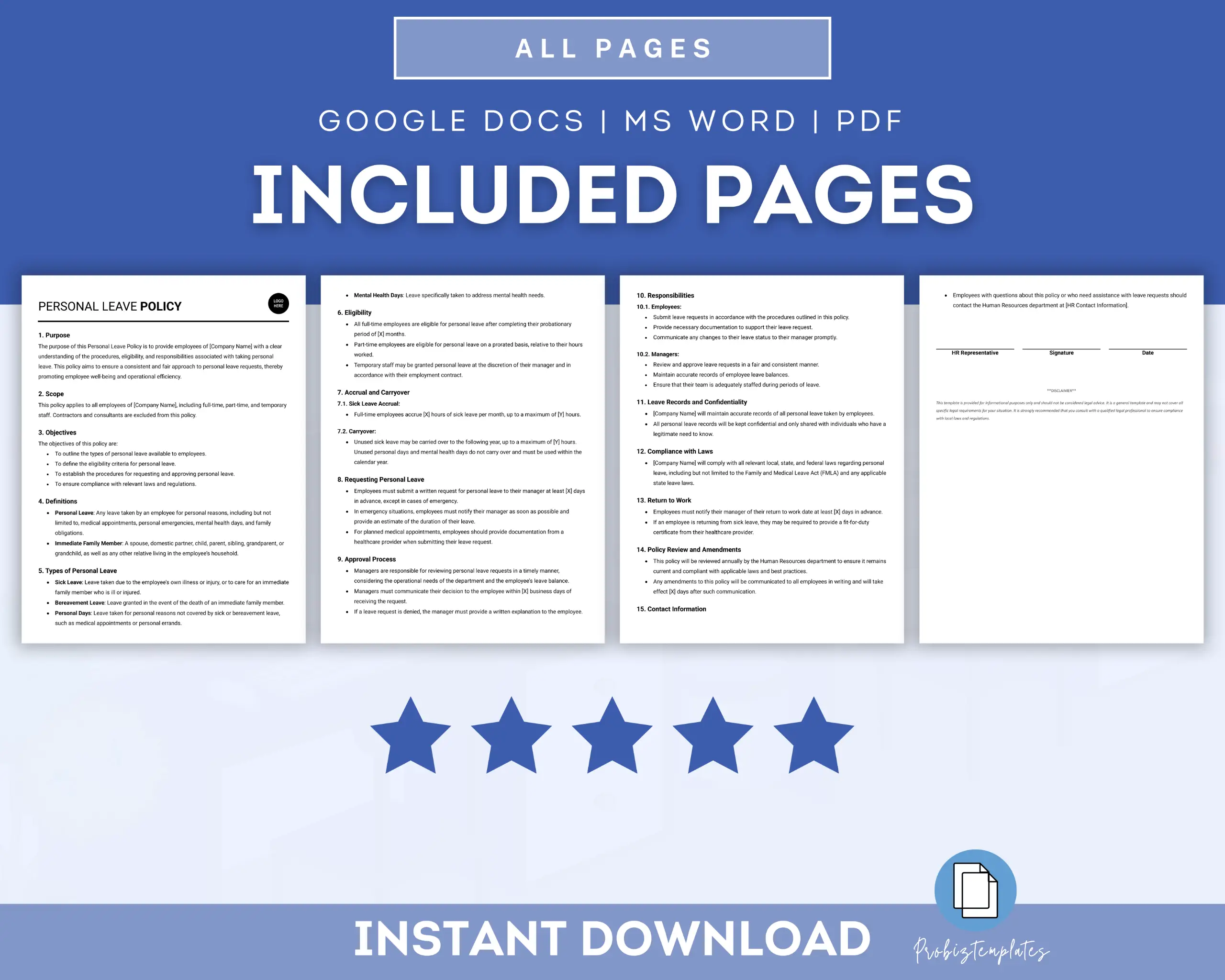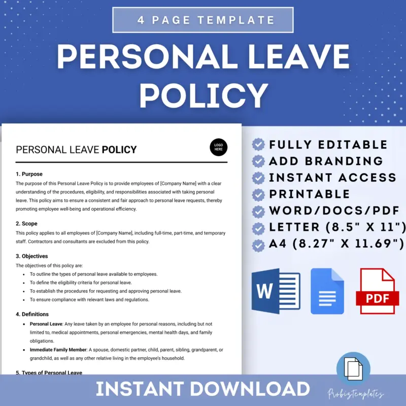This Personal Leave Policy template outlines the guidelines for employees taking personal leave. It includes sections on eligibility, application procedures, and leave duration to ensure clear and fair leave management.