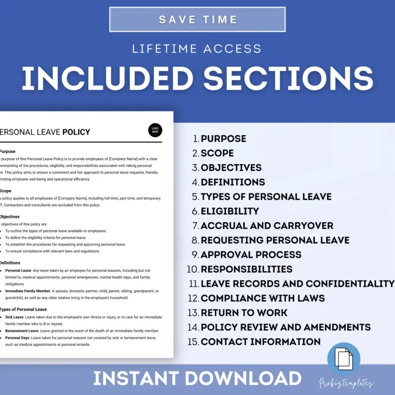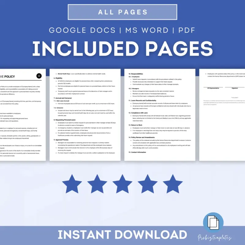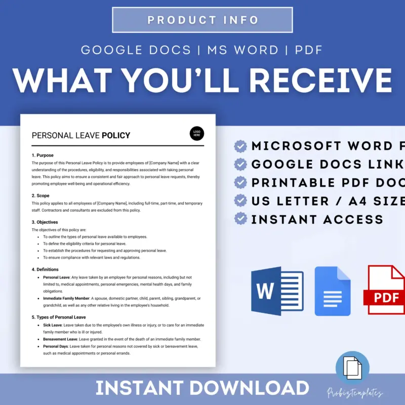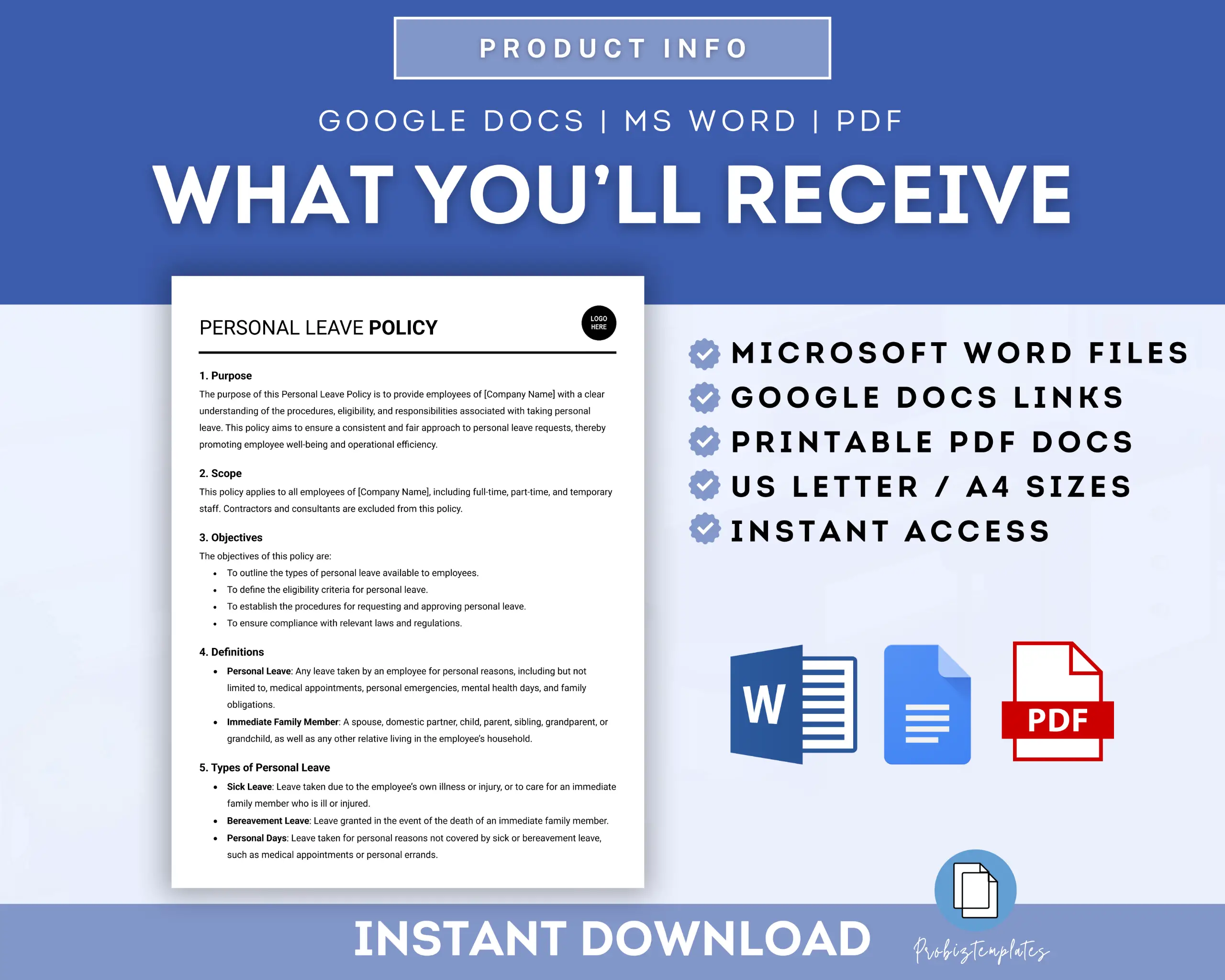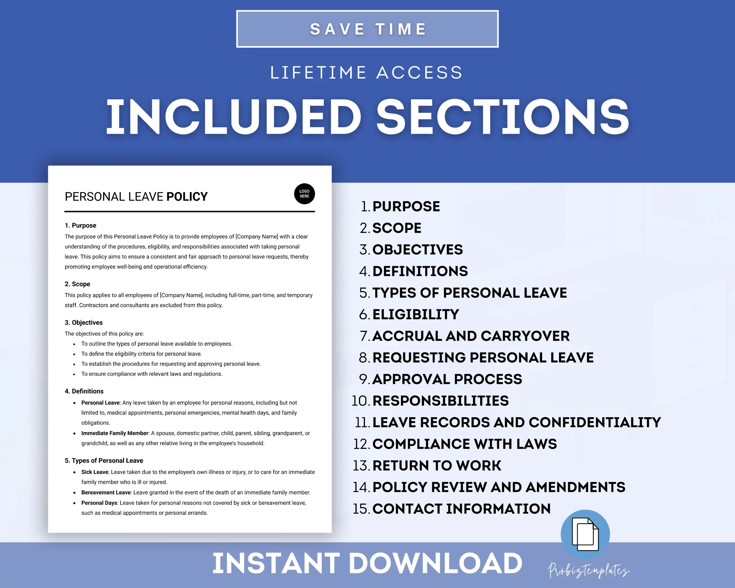 This Personal Leave Policy template outlines the guidelines for employees taking personal leave. It includes sections on eligibility, application procedures, and leave duration to ensure clear and fair leave management.