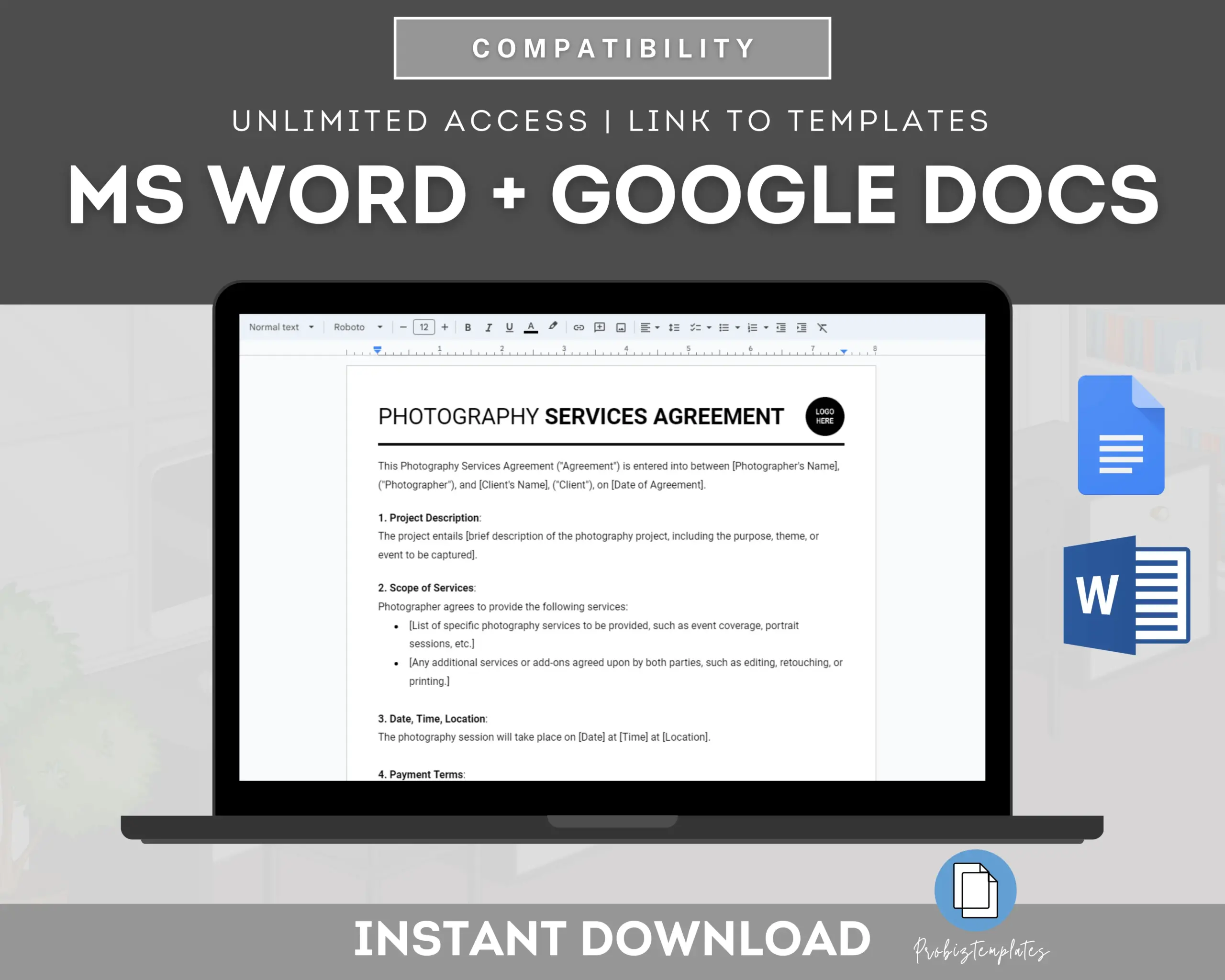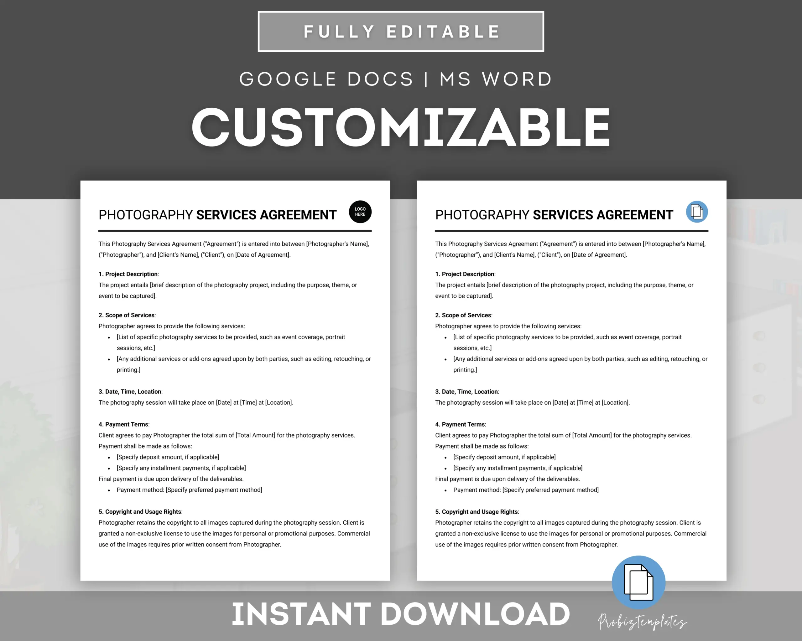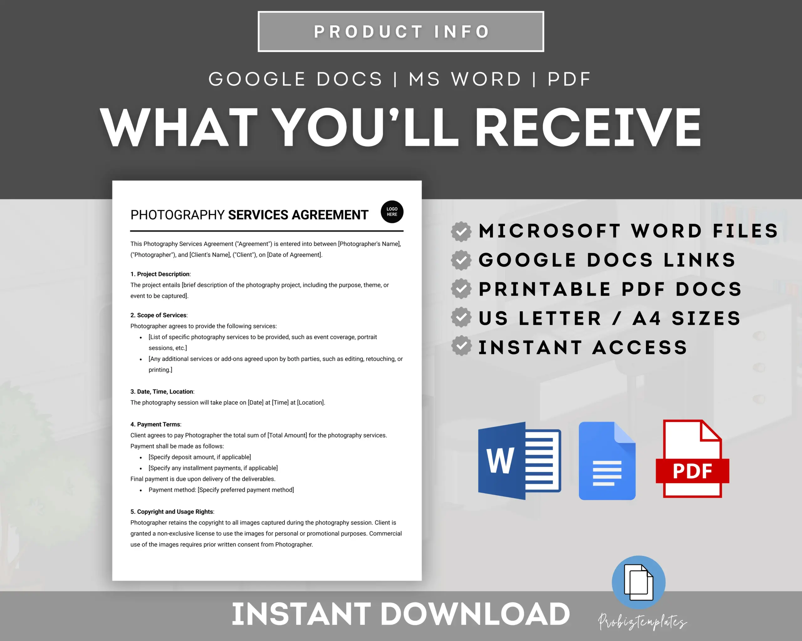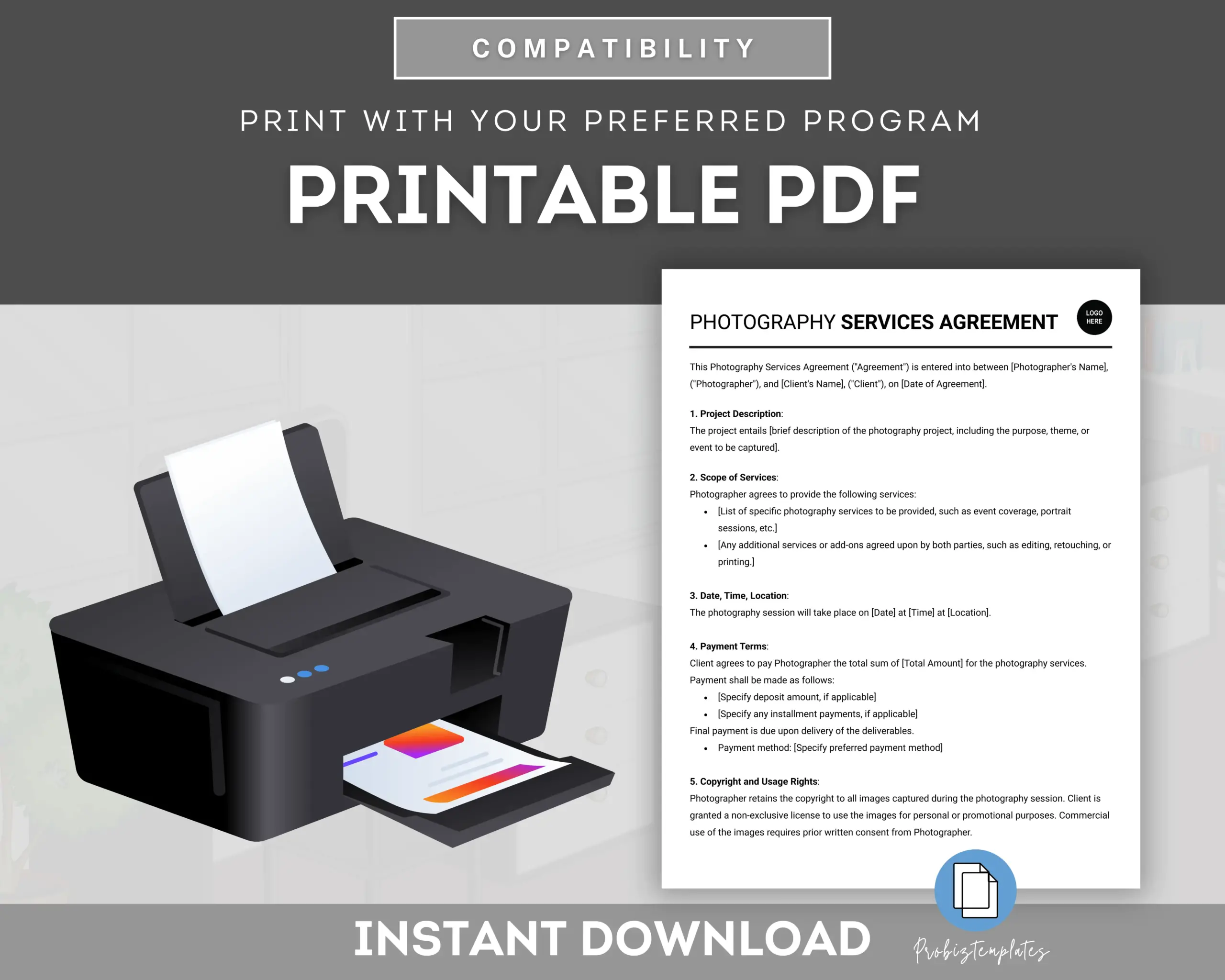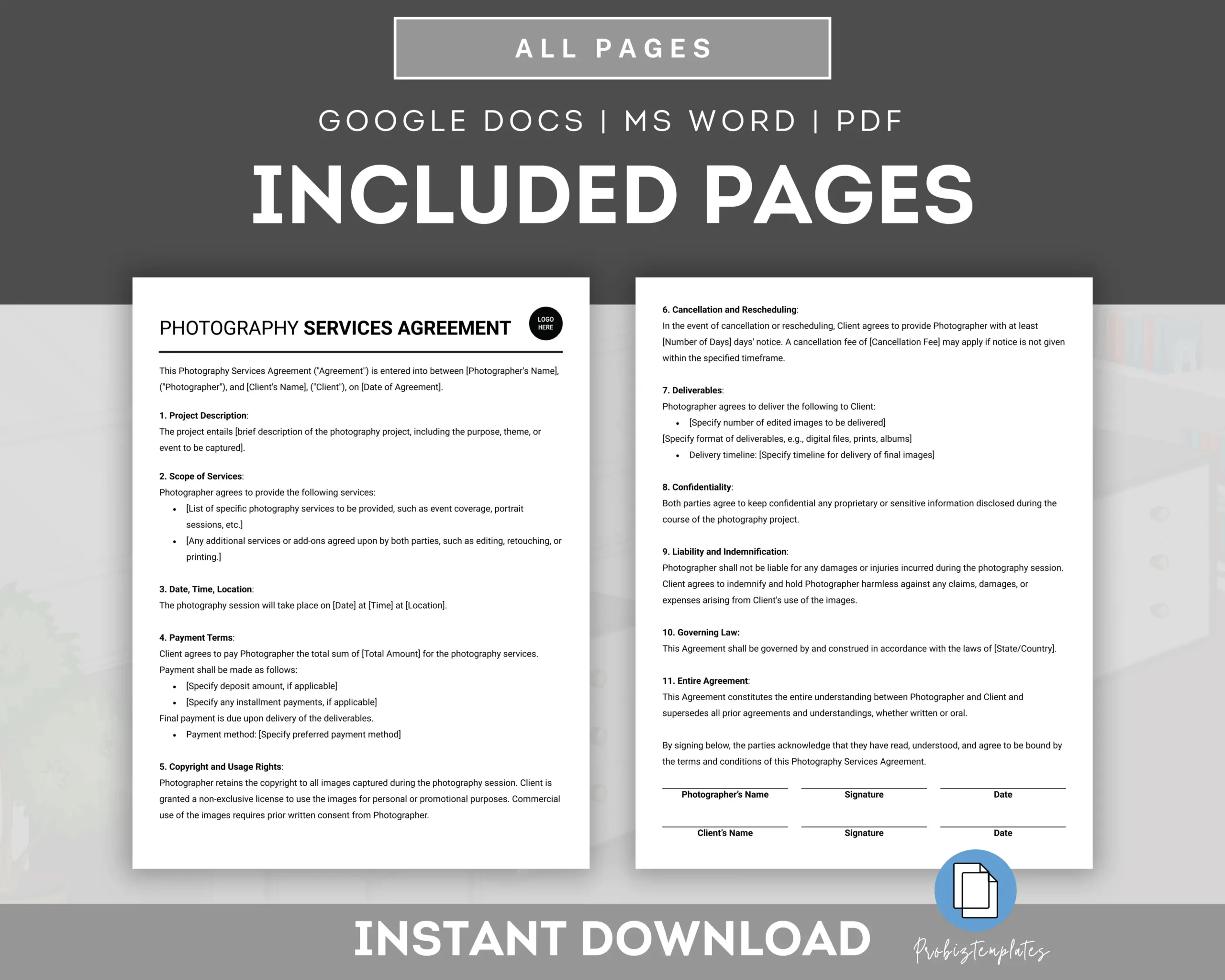 Ensure clarity and professionalism in your photography services with this comprehensive agreement template. Clearly outline terms and conditions for your clients, covering important aspects like fees, usage rights, and responsibilities to protect both parties.