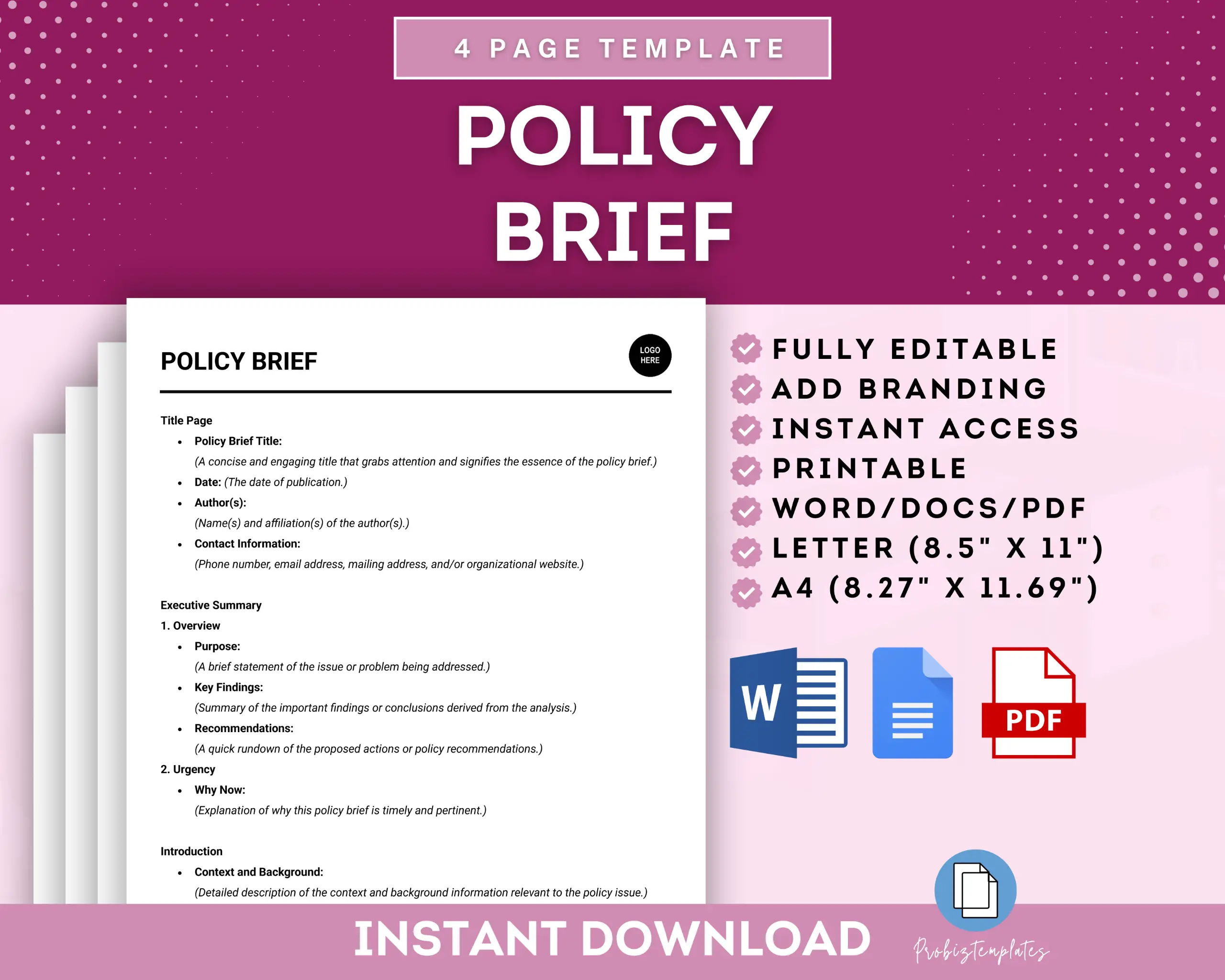 This Policy Brief template provides a concise summary of company policies. It includes sections on policy objectives, key points, and implementation guidelines to ensure clear and effective communication of organizational policies.