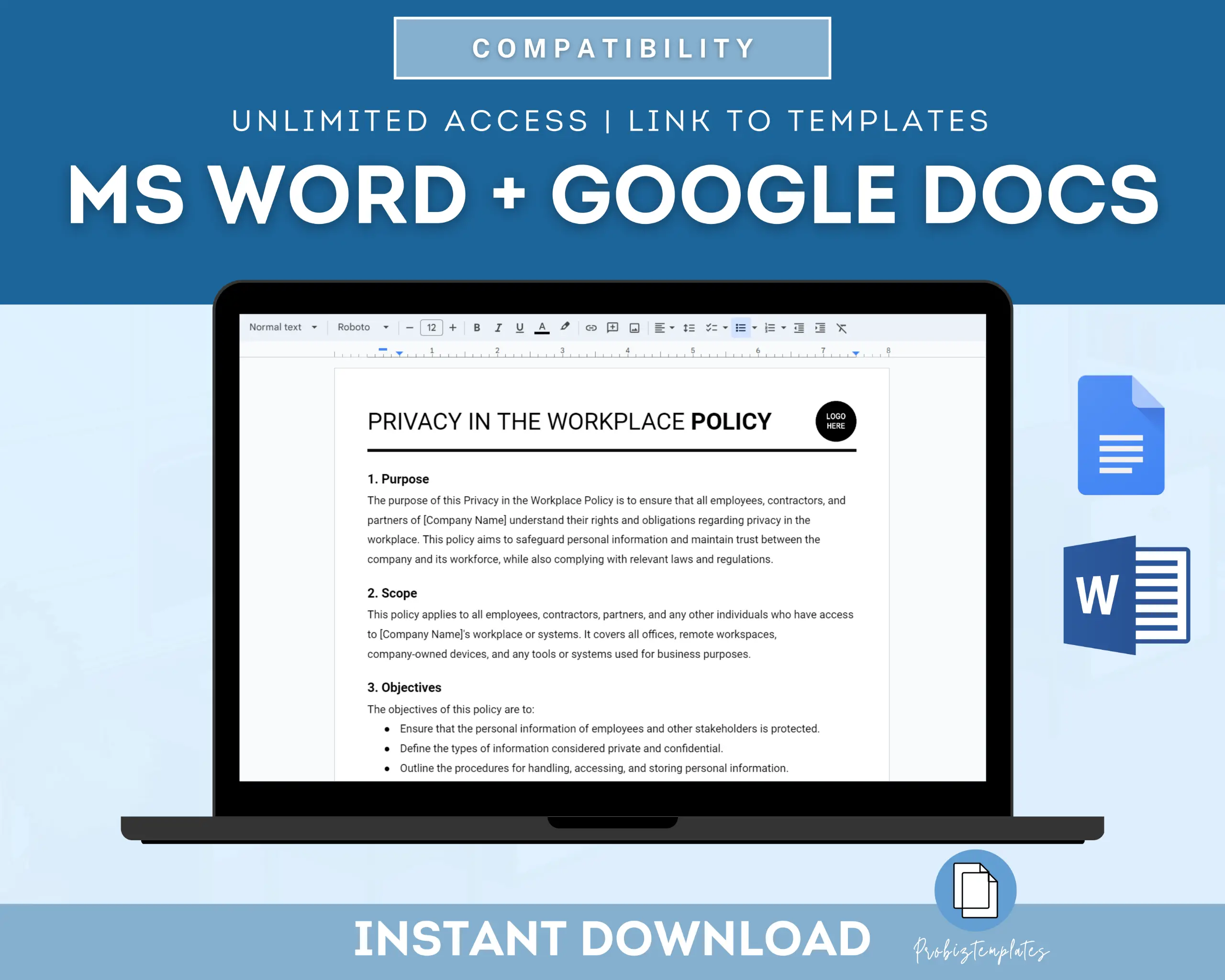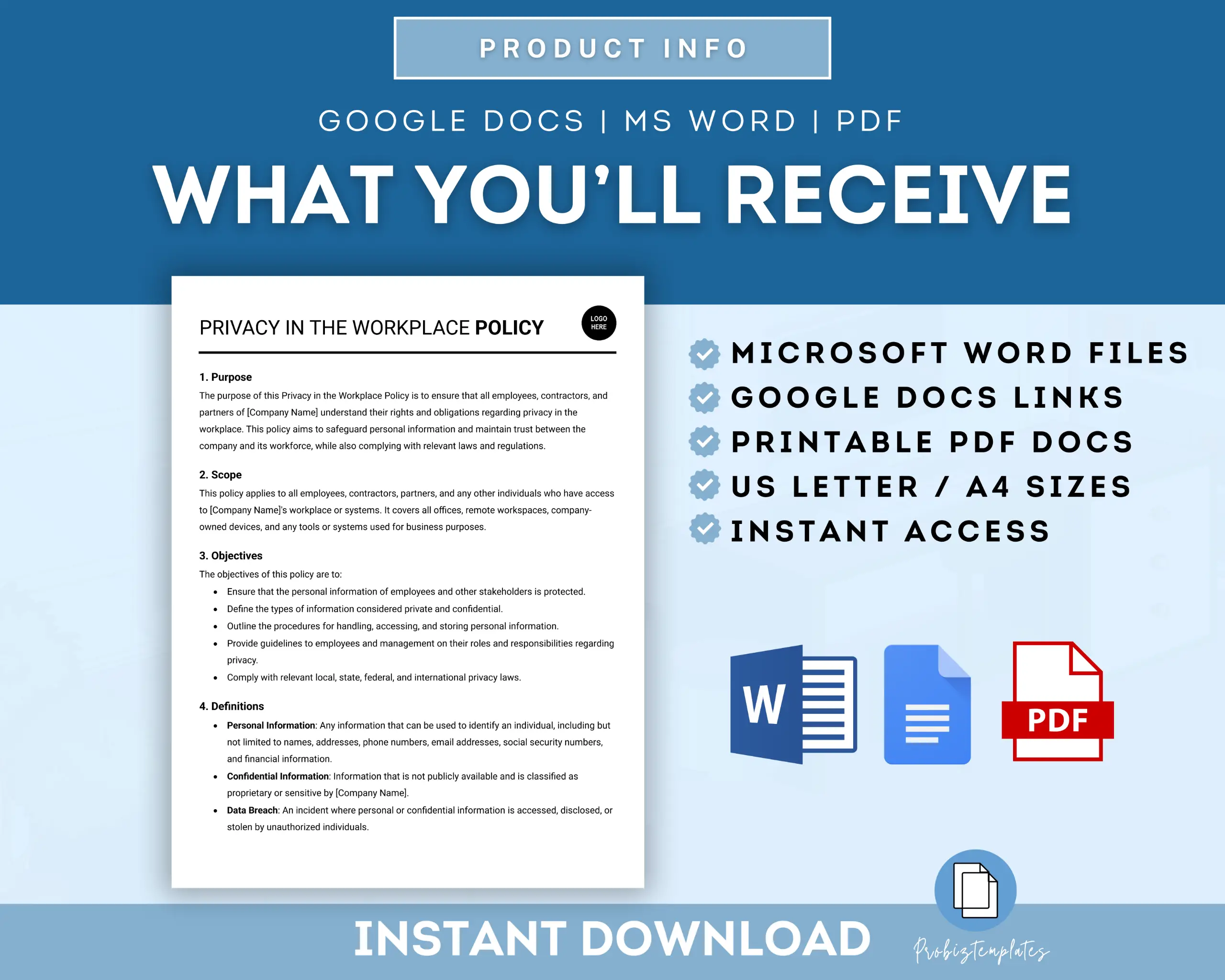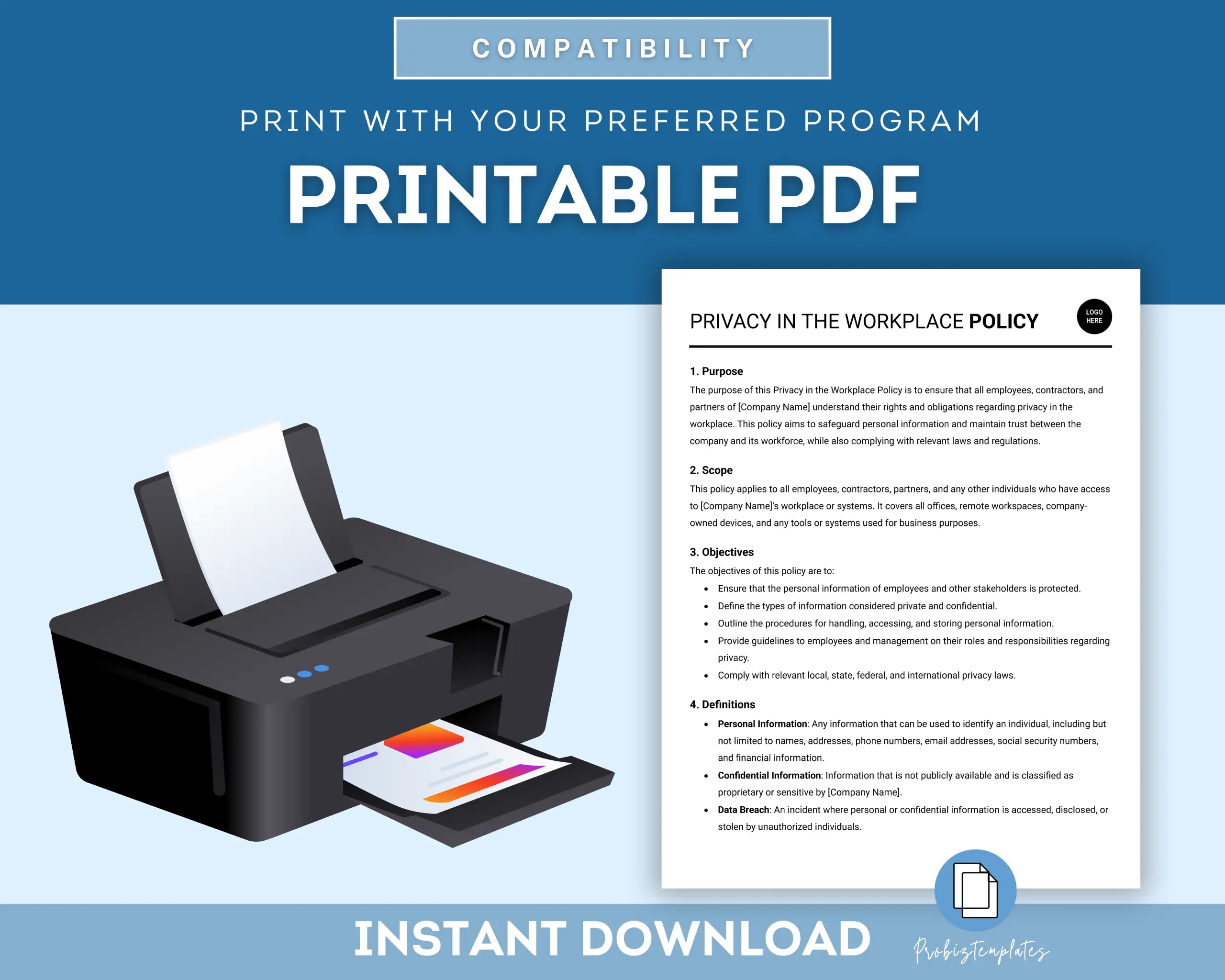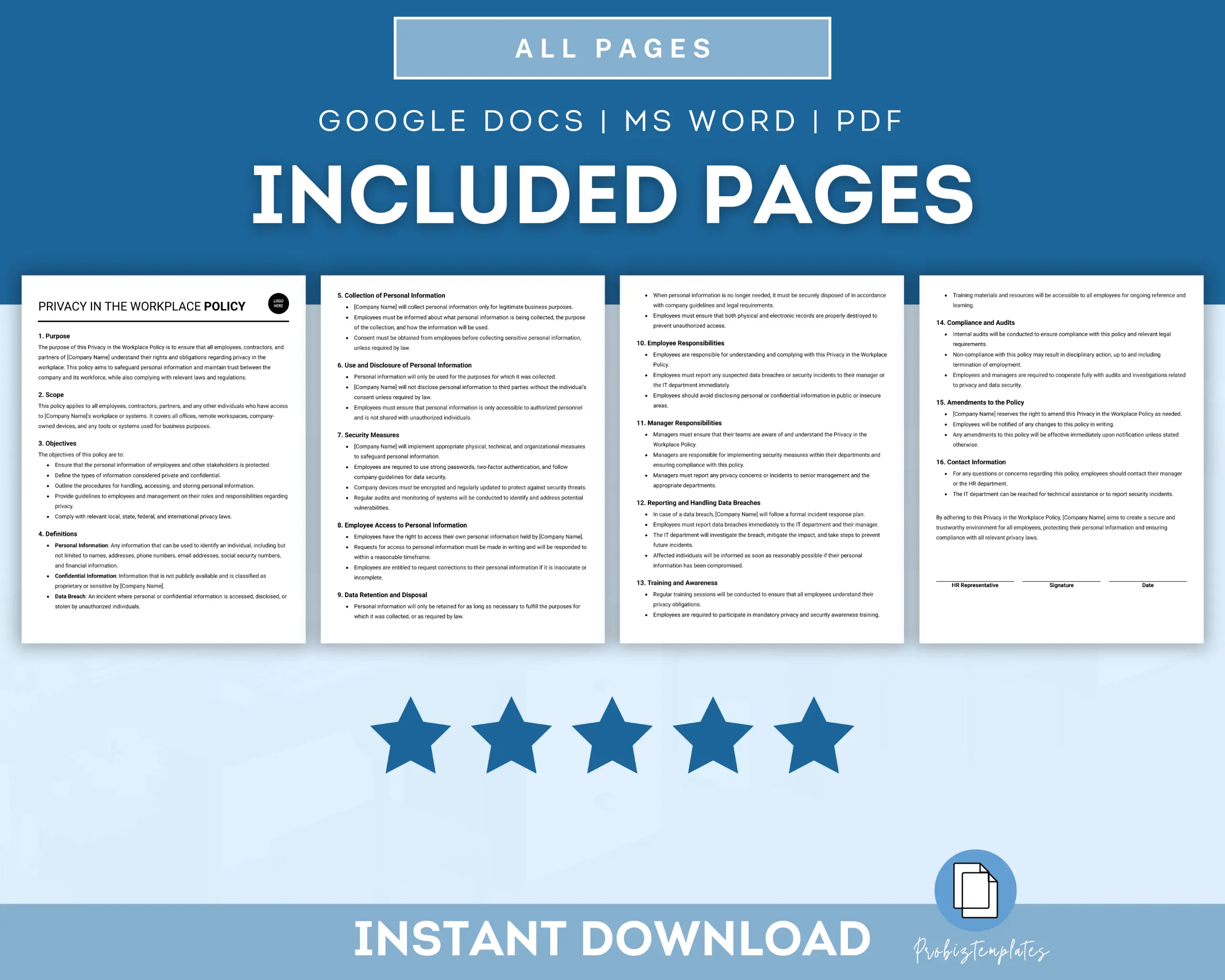 This Privacy In The Workplace Policy template outlines the guidelines for protecting employee privacy. It includes sections on data protection, confidentiality, and employee rights to ensure a respectful and secure workplace environment.