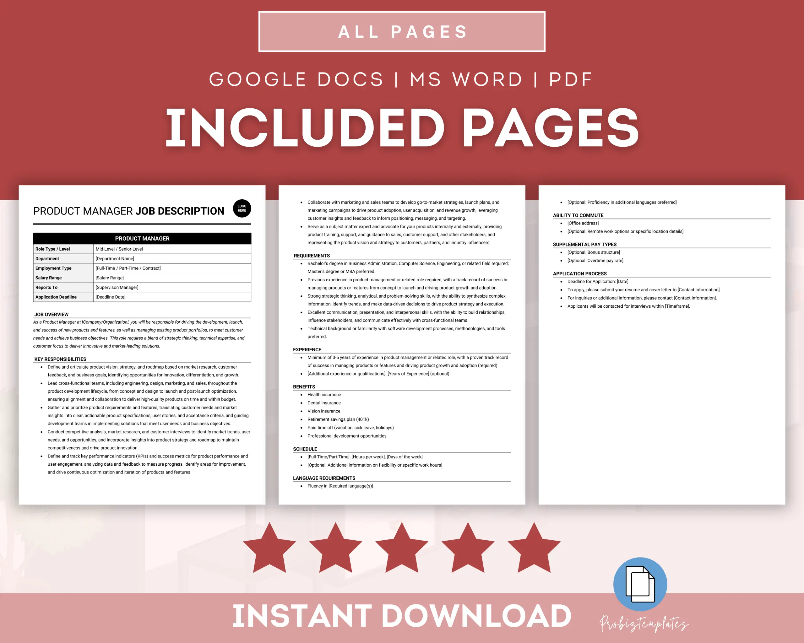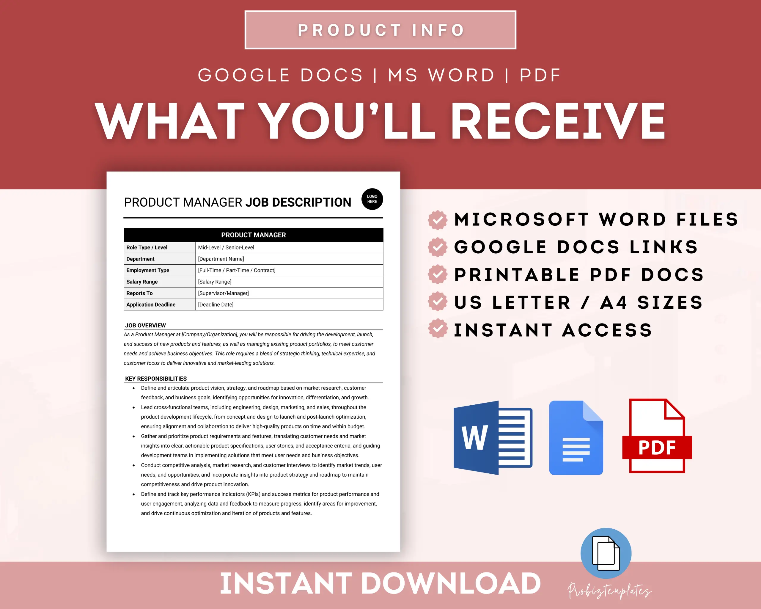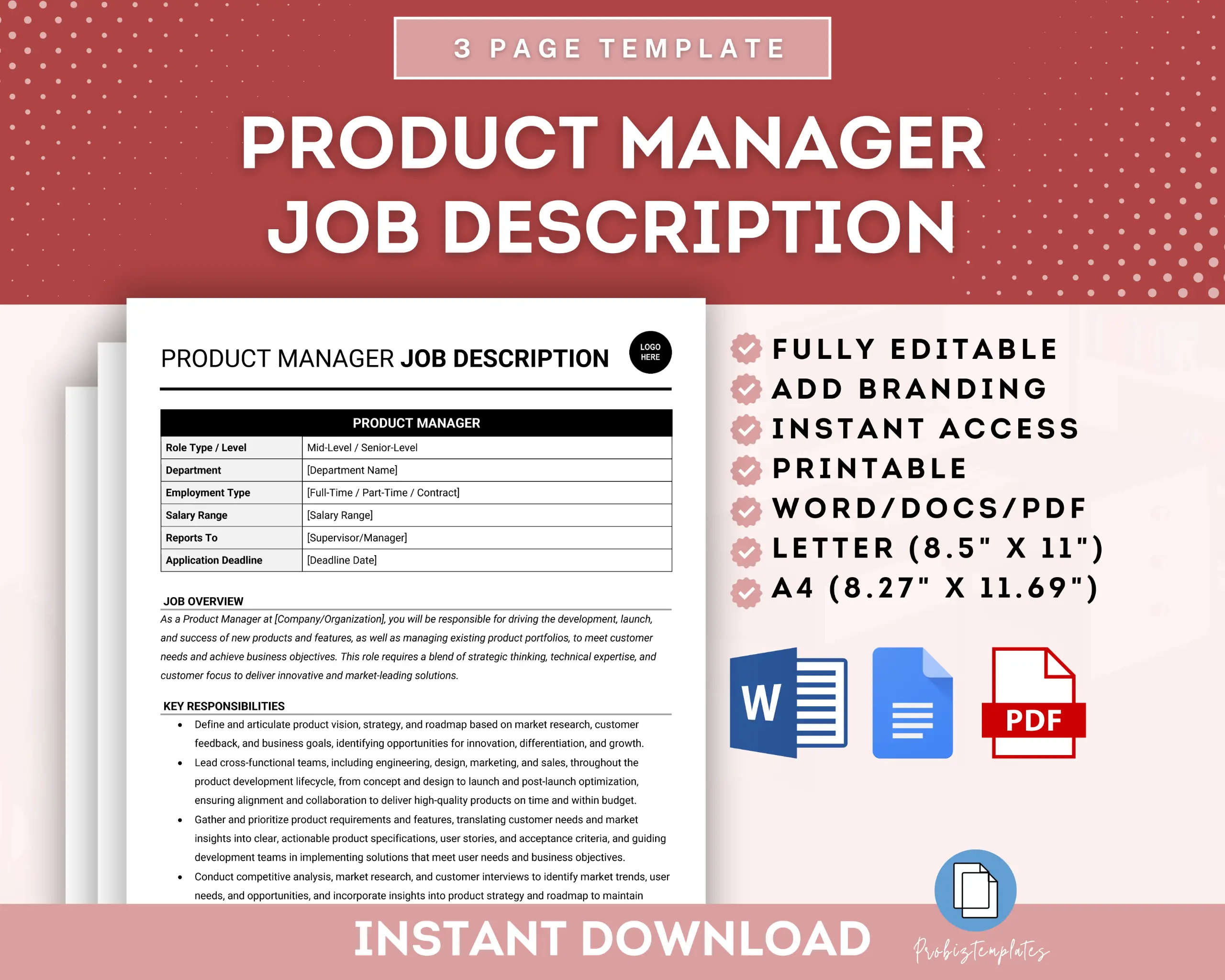 This Product Manager Job Description template outlines the key responsibilities and qualifications for product managers. It includes duties such as product strategy development, market analysis, and overseeing product development to ensure successful product launches.