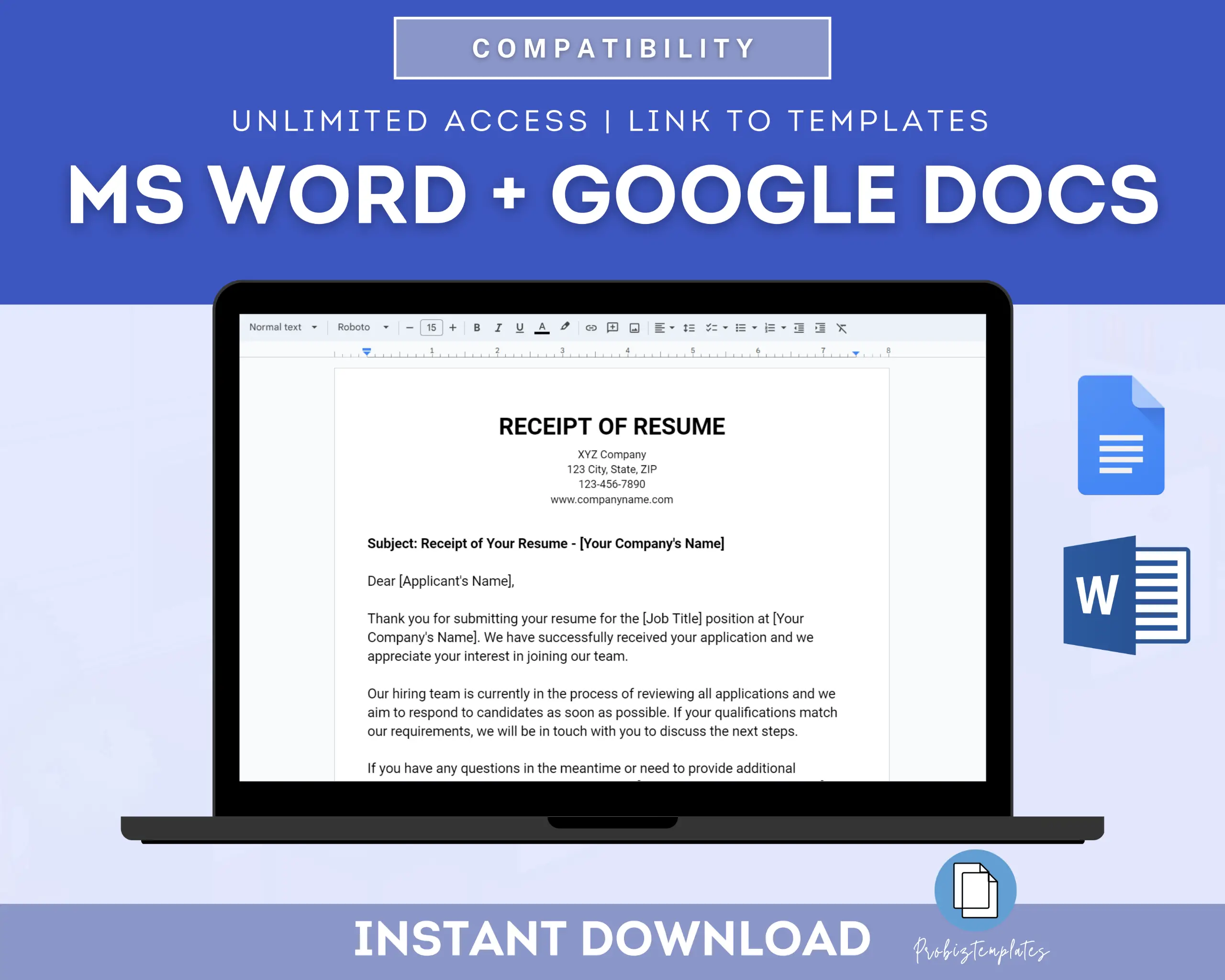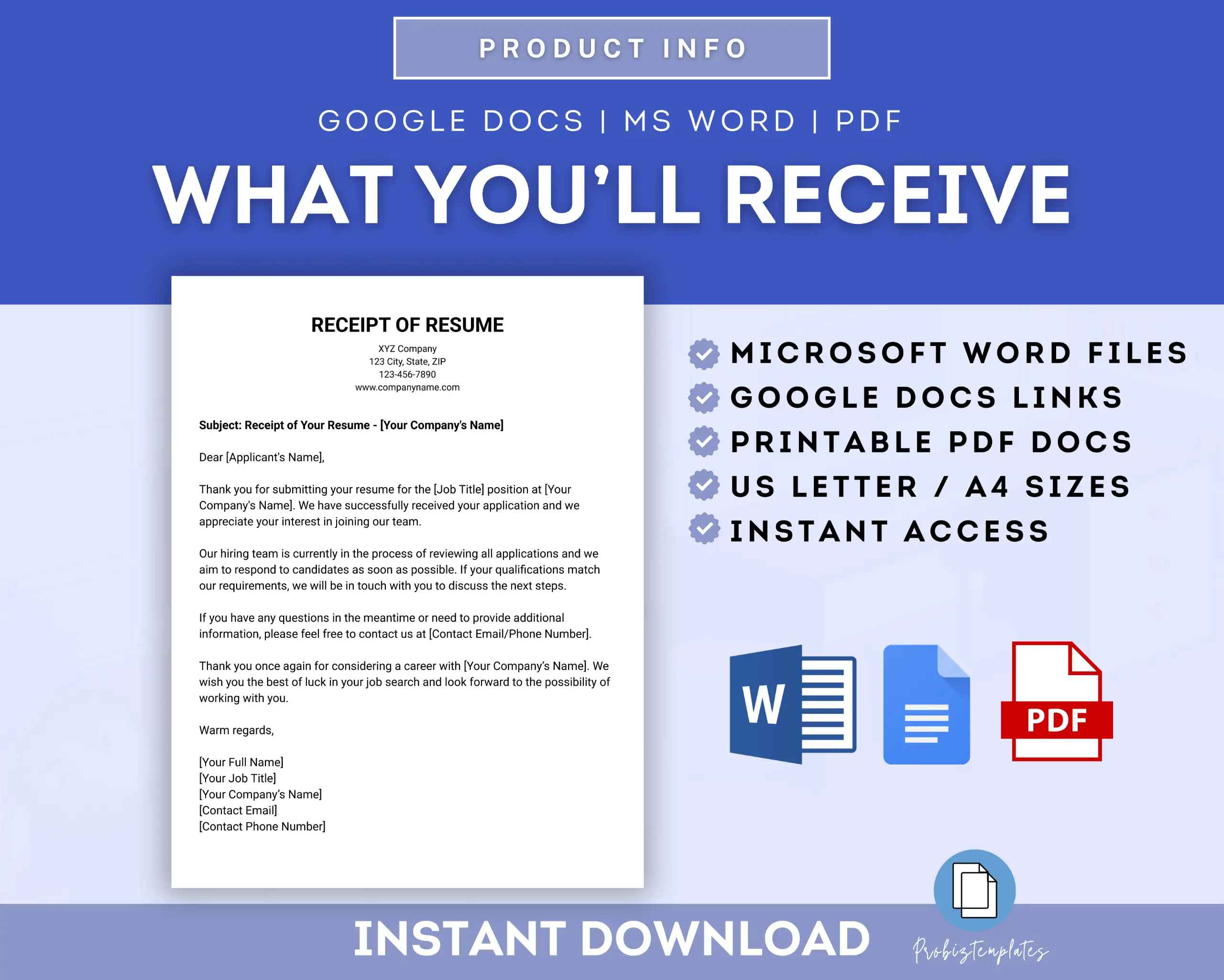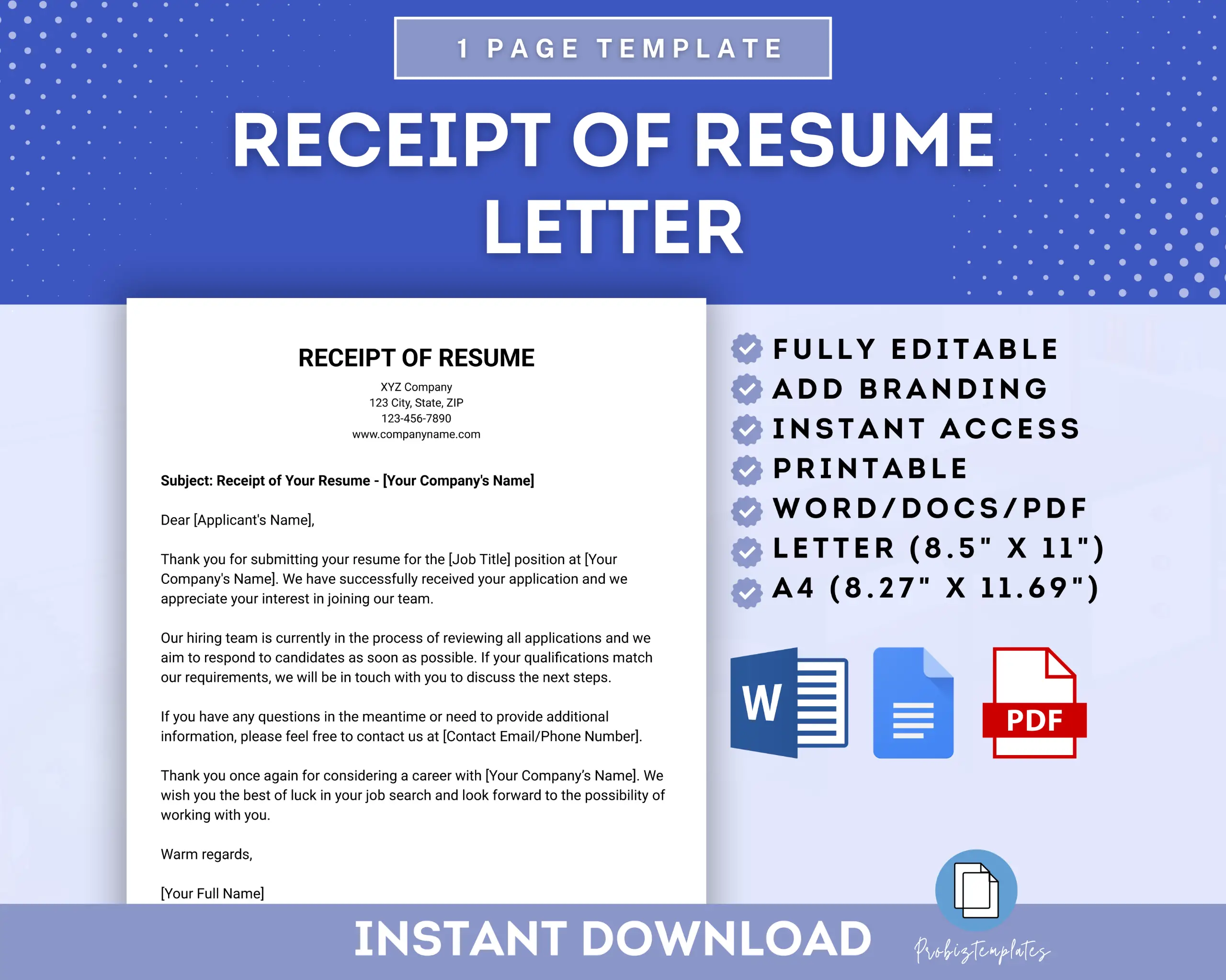 This Receipt of Resume Letter template acknowledges the receipt of a job applicant’s resume. It includes sections to confirm receipt, outline the next steps in the hiring process, and provide any additional information the applicant needs to know.