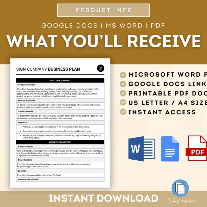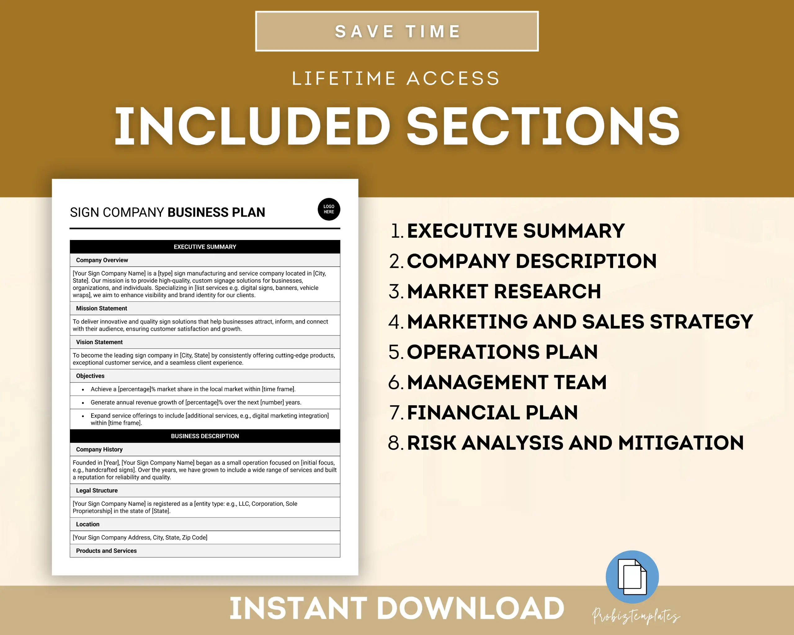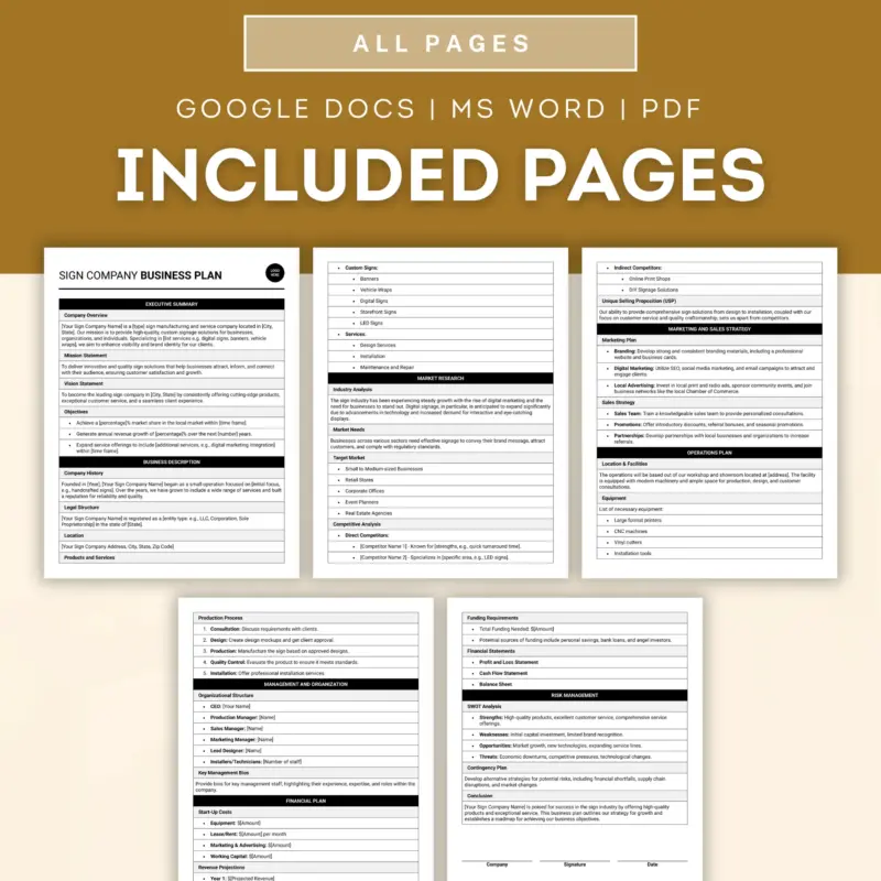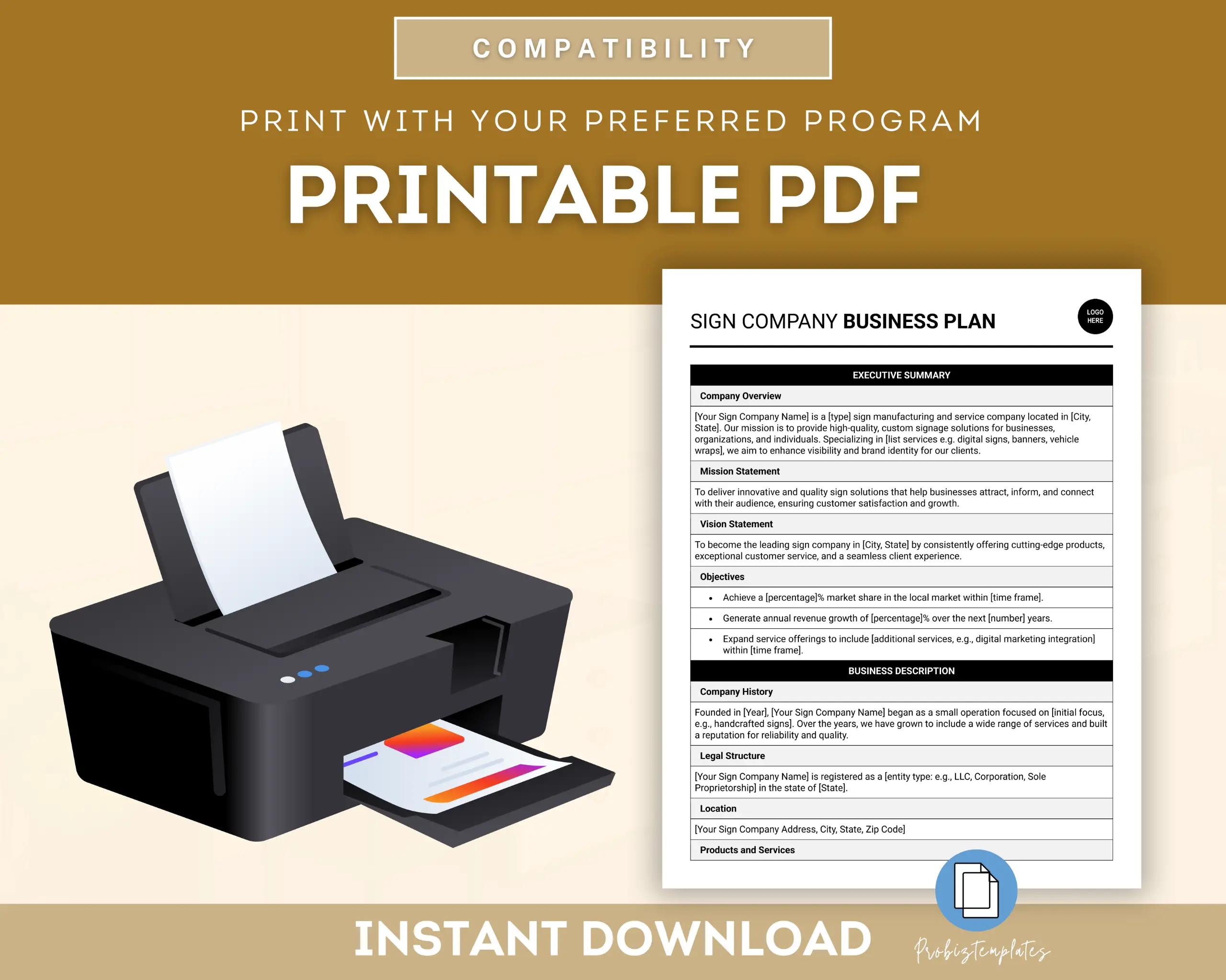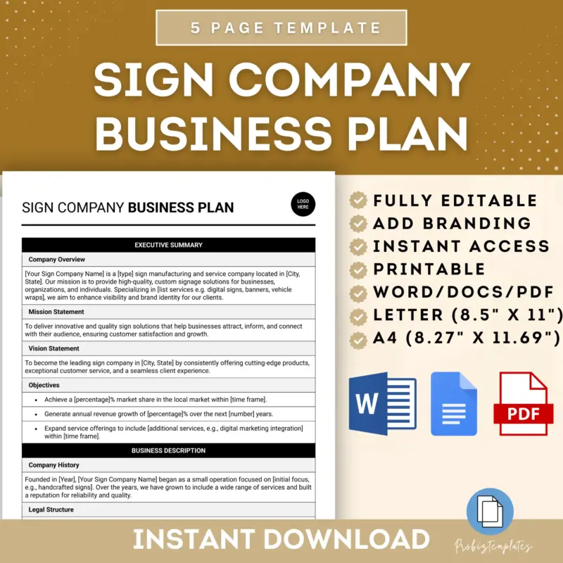 This Sign Company Business Plan provides a comprehensive framework for starting and growing a sign company. It includes sections for market analysis, financial planning, and operations, ideal for entrepreneurs in the signage industry.