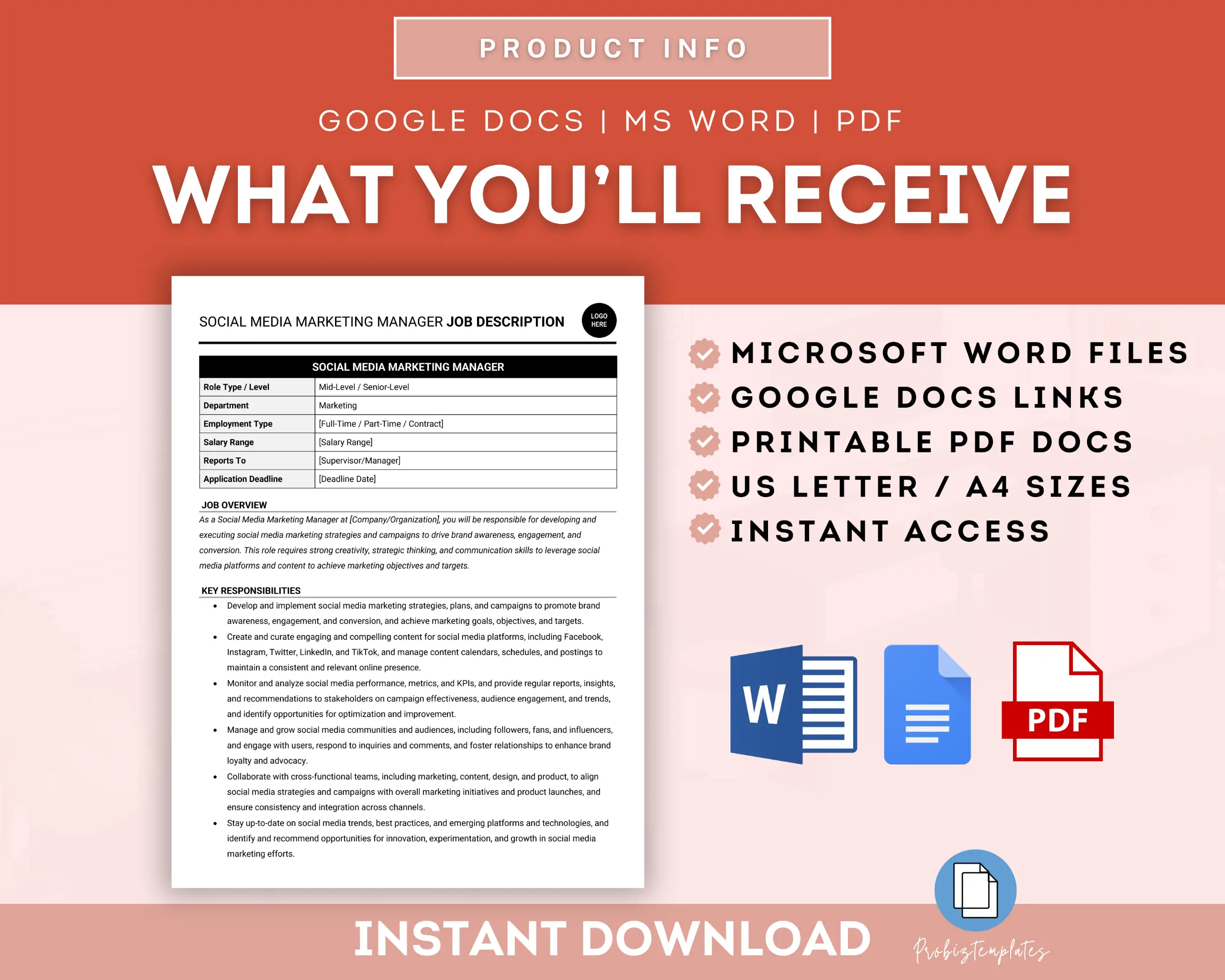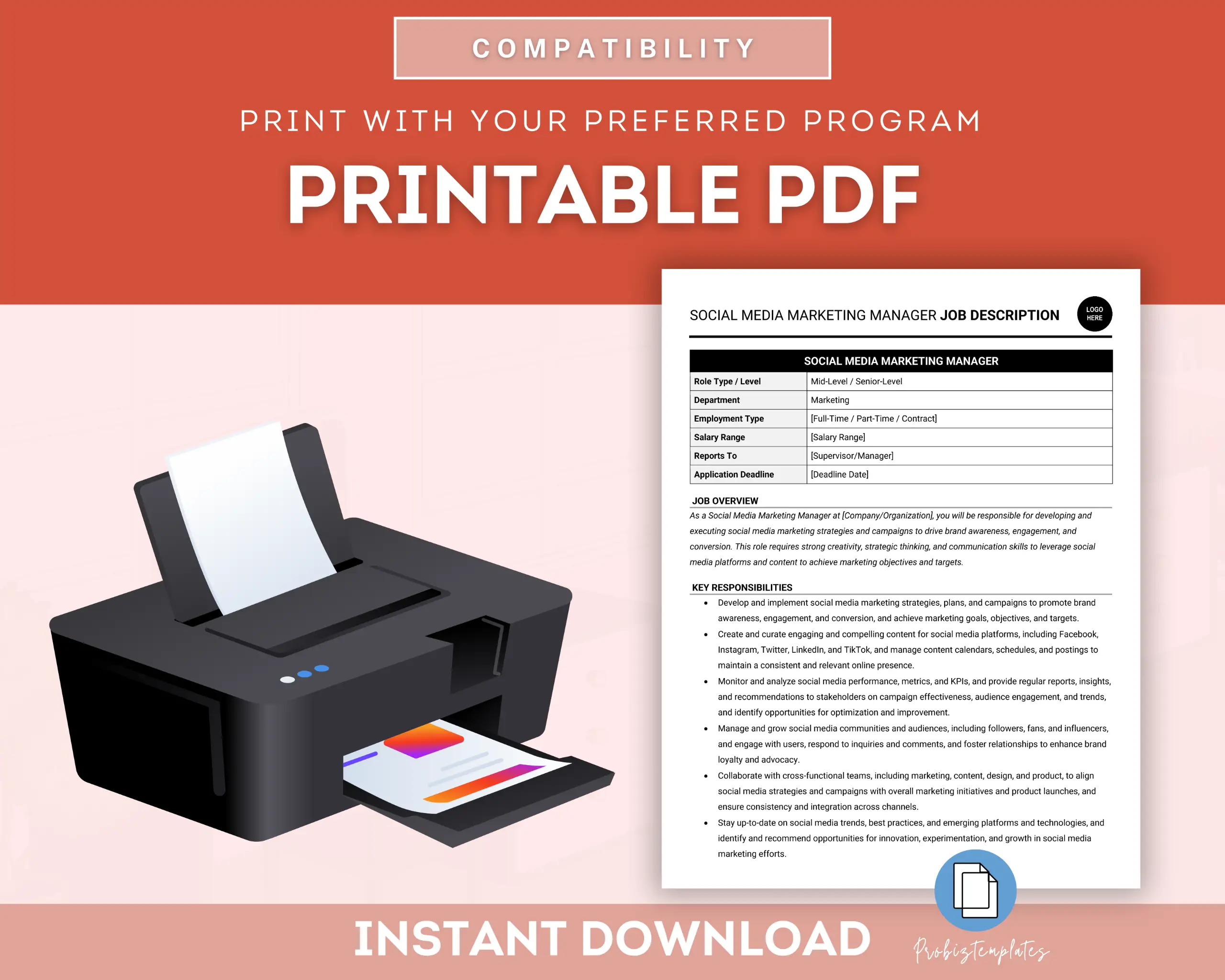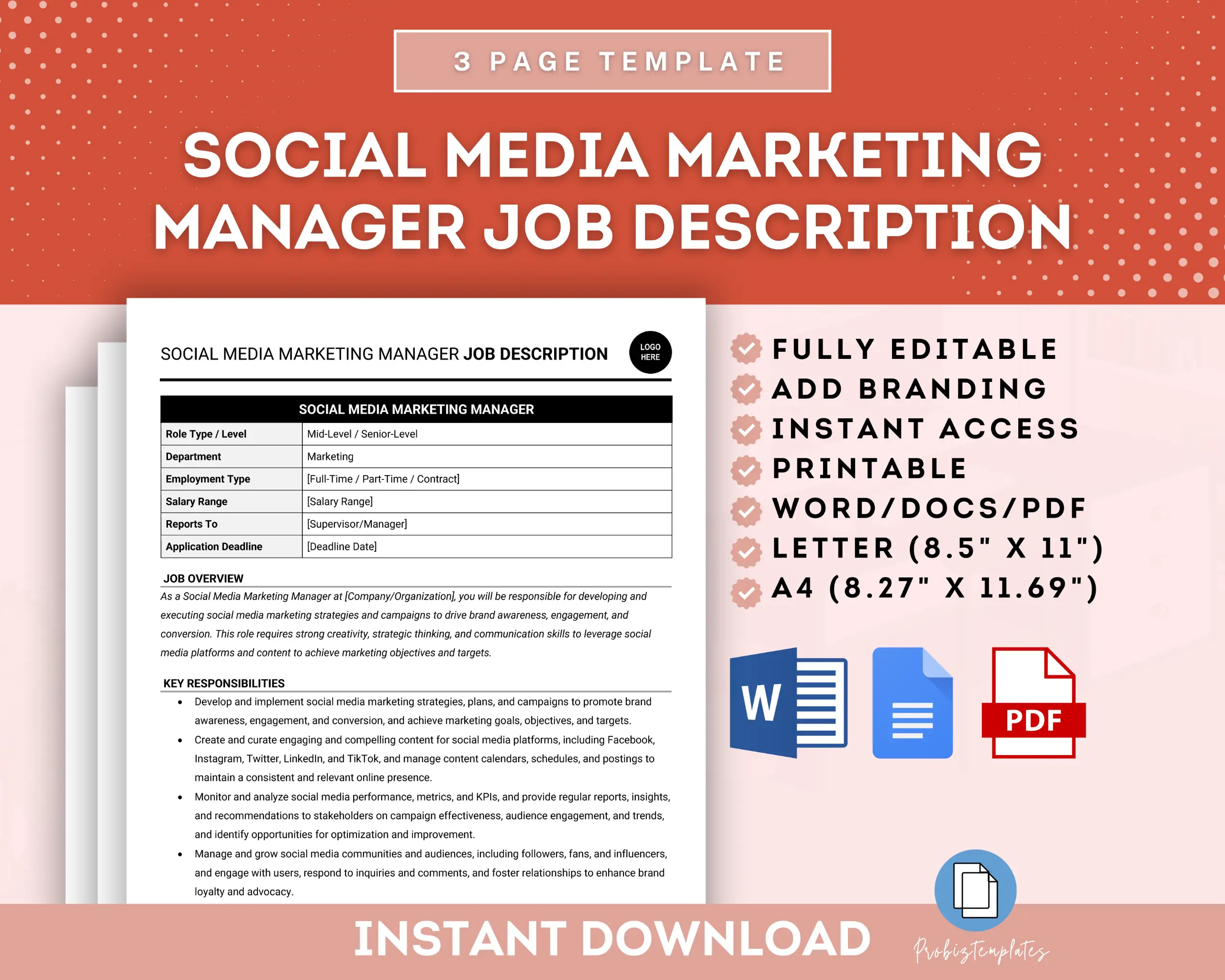 This Social Media Marketing Manager Job Description outlines the key responsibilities and qualifications for social media marketing managers. It includes tasks like creating content, managing campaigns, and analyzing performance, essential for effective social media marketing.