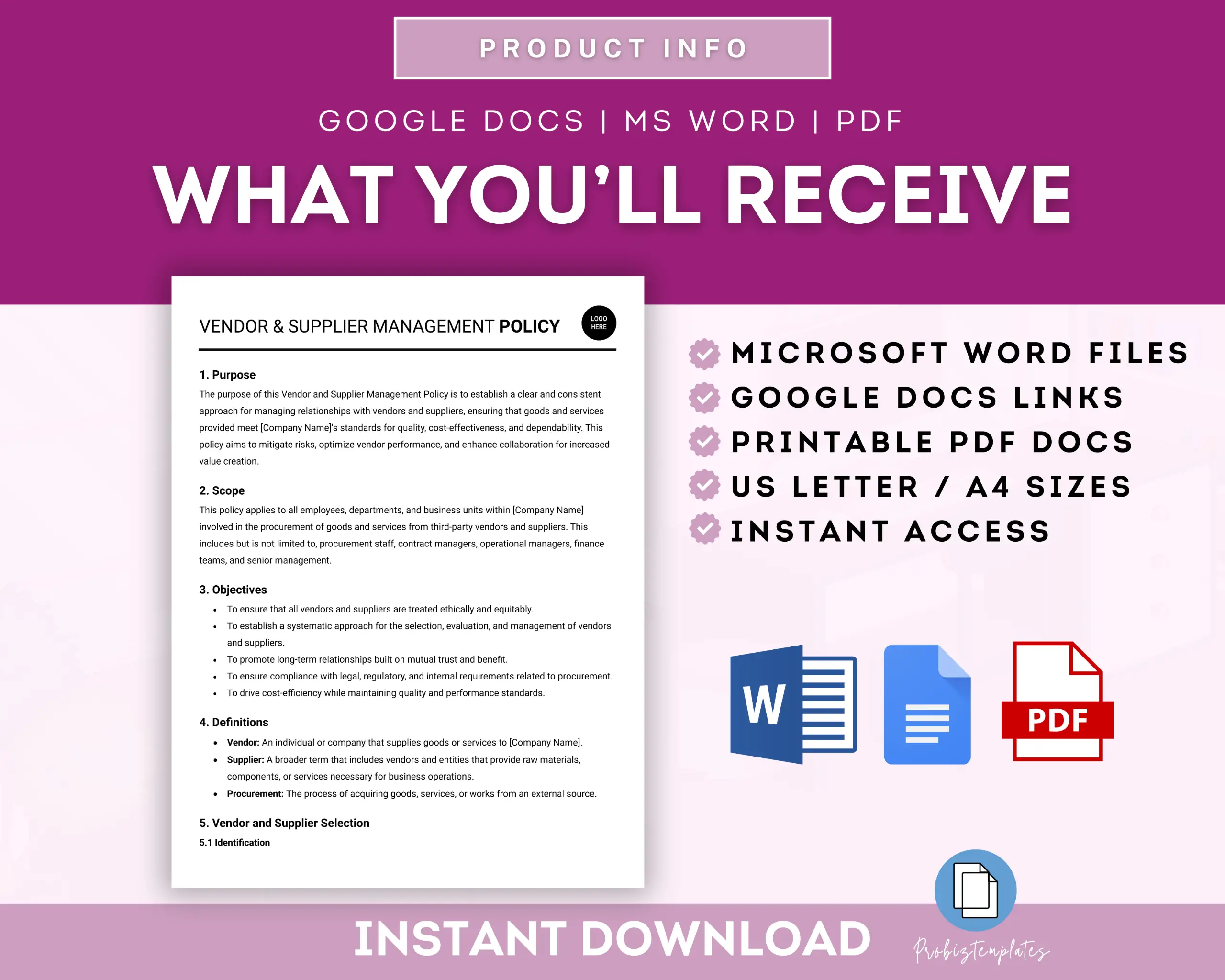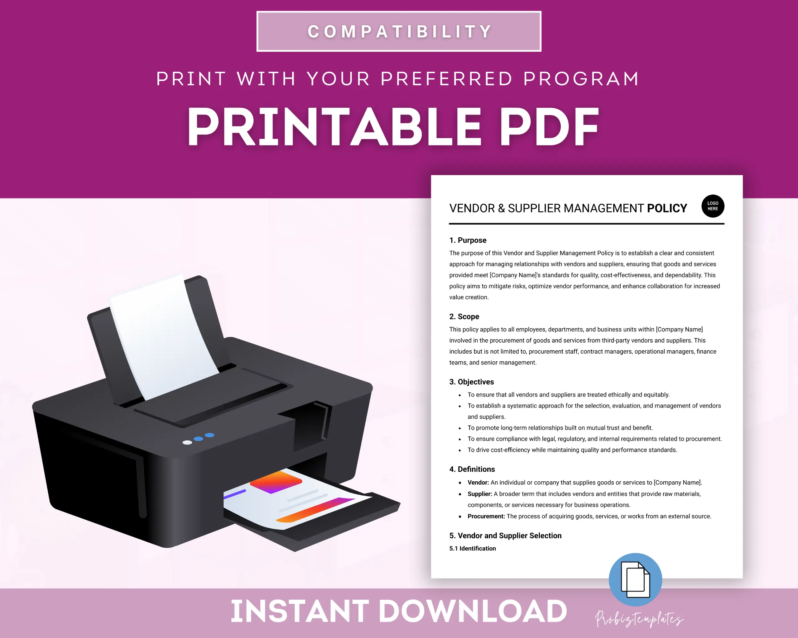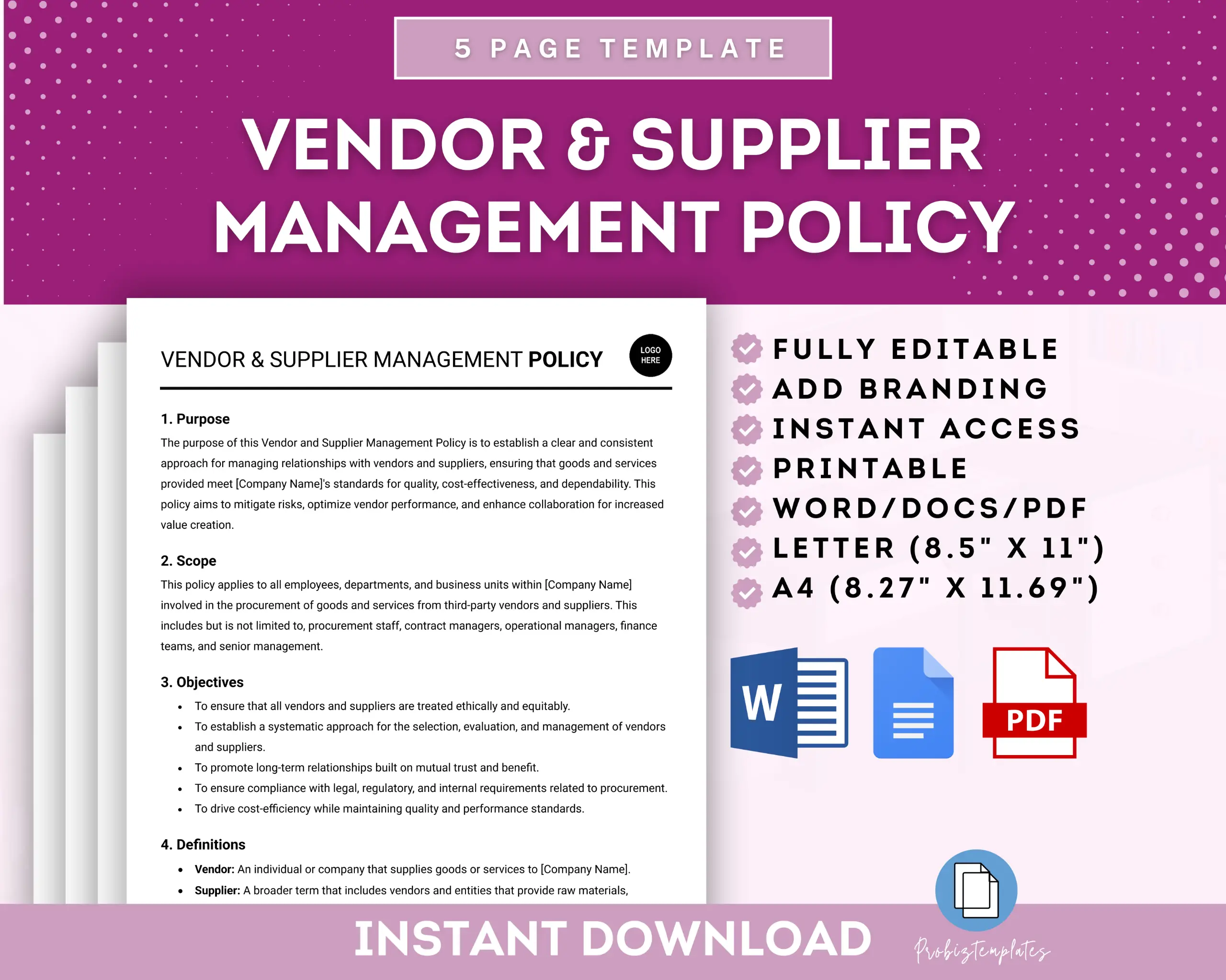This Vendor and Supplier Management Policy provides comprehensive guidelines for managing vendor and supplier relationships. It includes procedures for selection, evaluation, compliance, and performance monitoring. Ideal for ensuring effective partnerships.