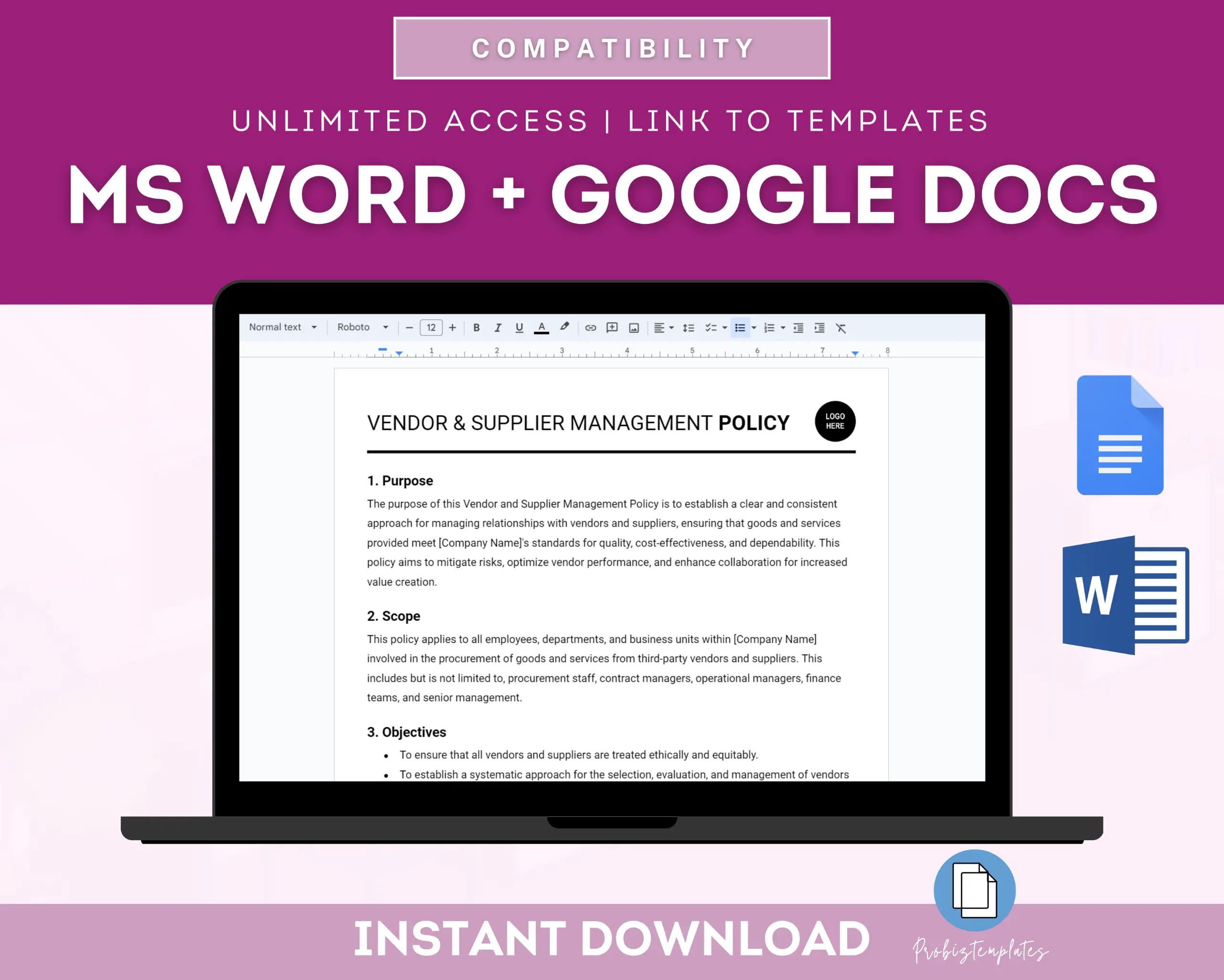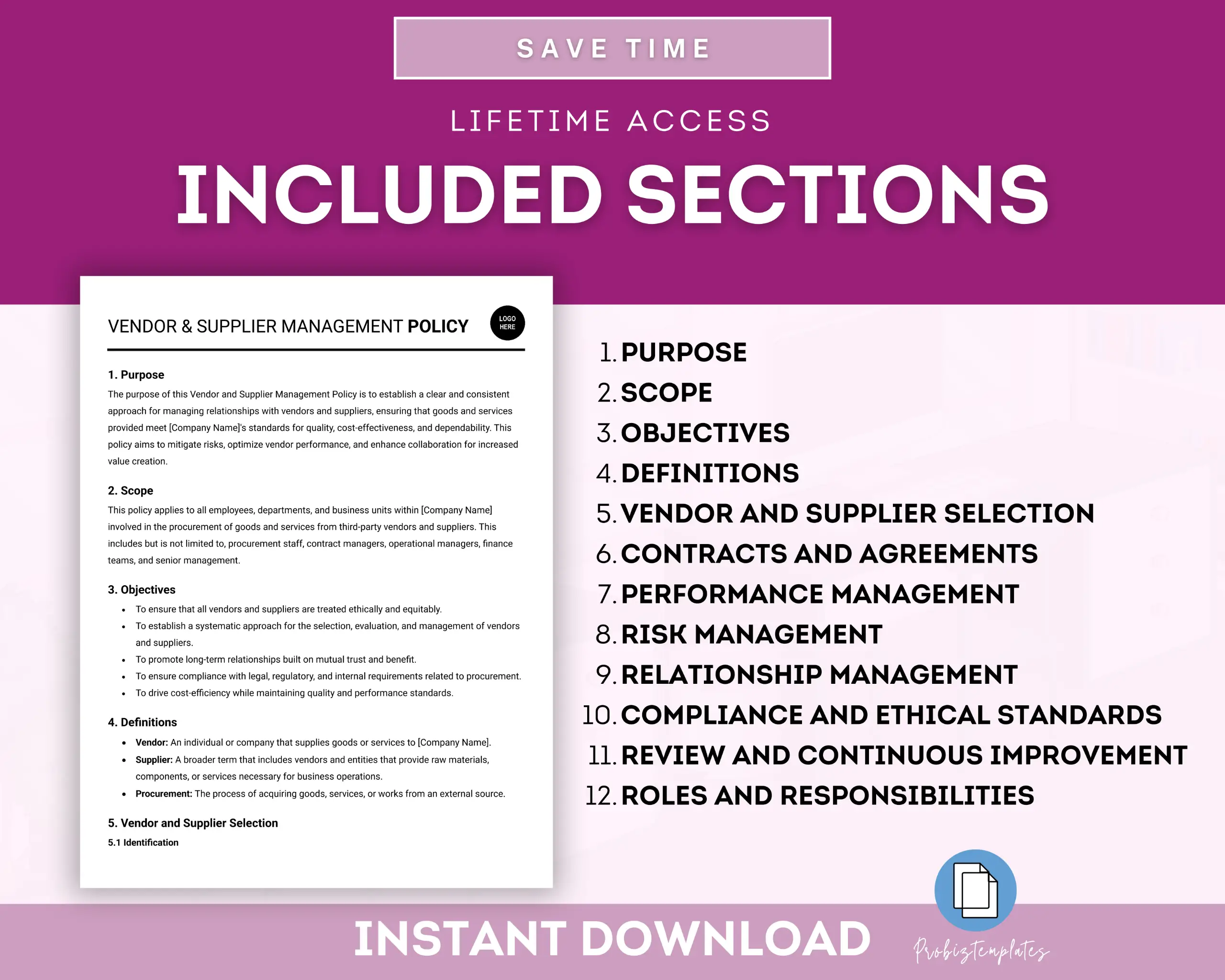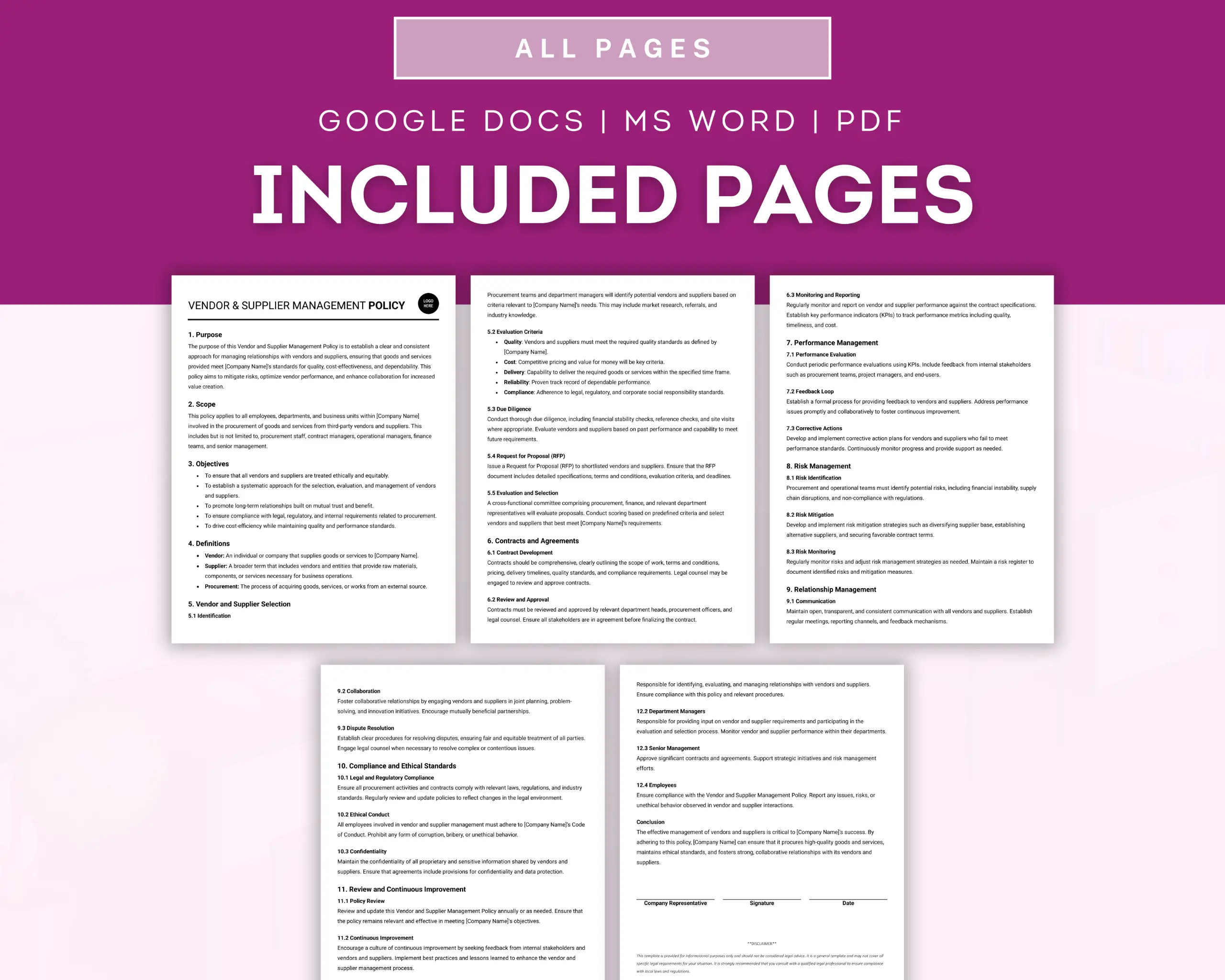 This Vendor and Supplier Management Policy provides comprehensive guidelines for managing vendor and supplier relationships. It includes procedures for selection, evaluation, compliance, and performance monitoring. Ideal for ensuring effective partnerships.