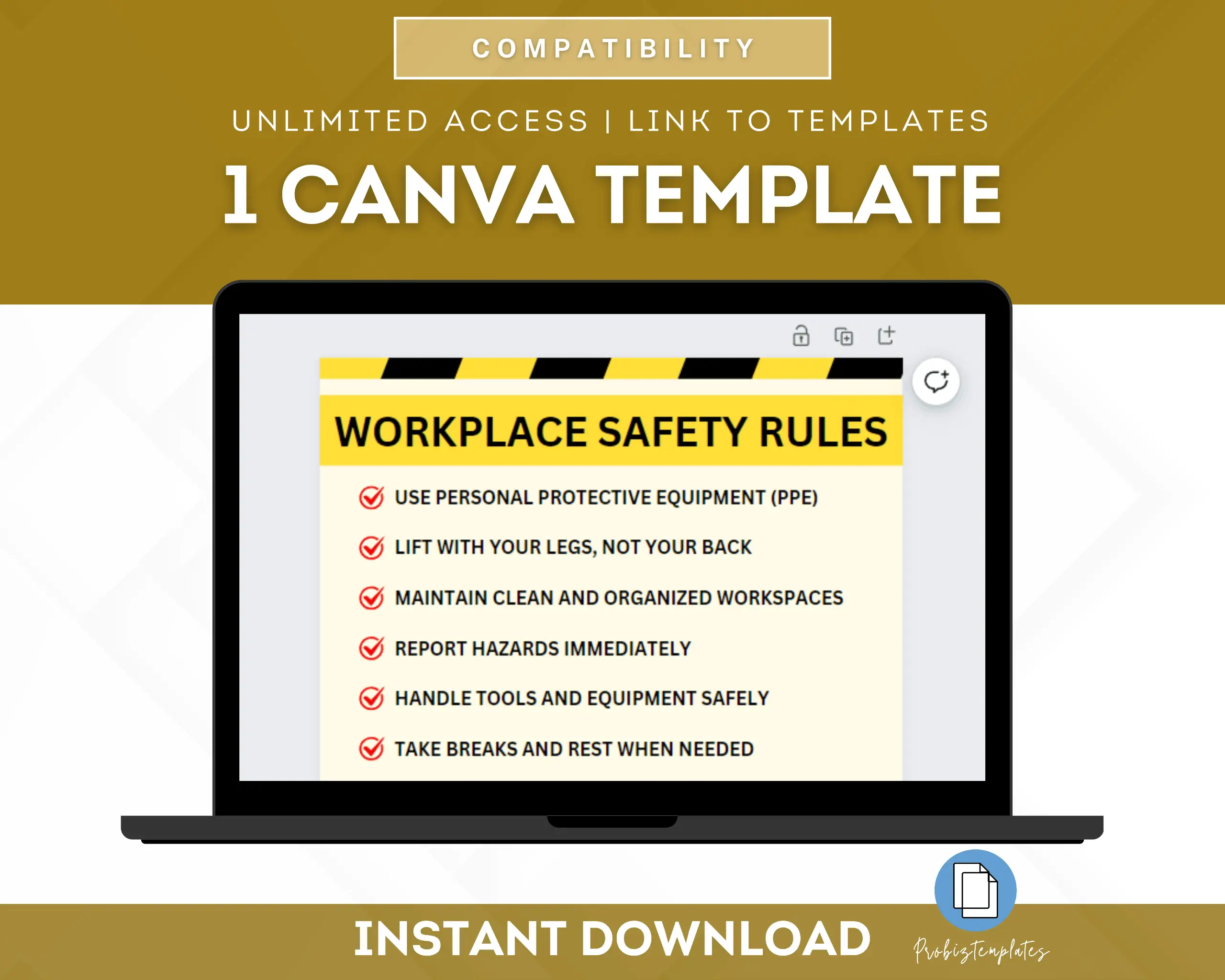 - “Workplace Safety Rules Poster” includes both printable PDF documents, as well as a link to edit the template in Canva (Free).